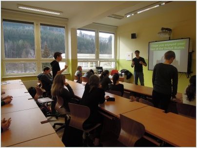 V pondělí jsme se učili anglicky více než netradičně. Svou návštěvou nás poctil americký rodilý mluvčí Bradley Kaspar. Seznámil nás se svou rodnou zemí, s jejími státy i jejich specialitami a kuriozitami. Konverzovali jsme, smáli se, ptali se na nejrůznější otázky… A to vše s dokonalým českým přízvukem naším a dokonalejším chicagským přízvukem Bradovým.