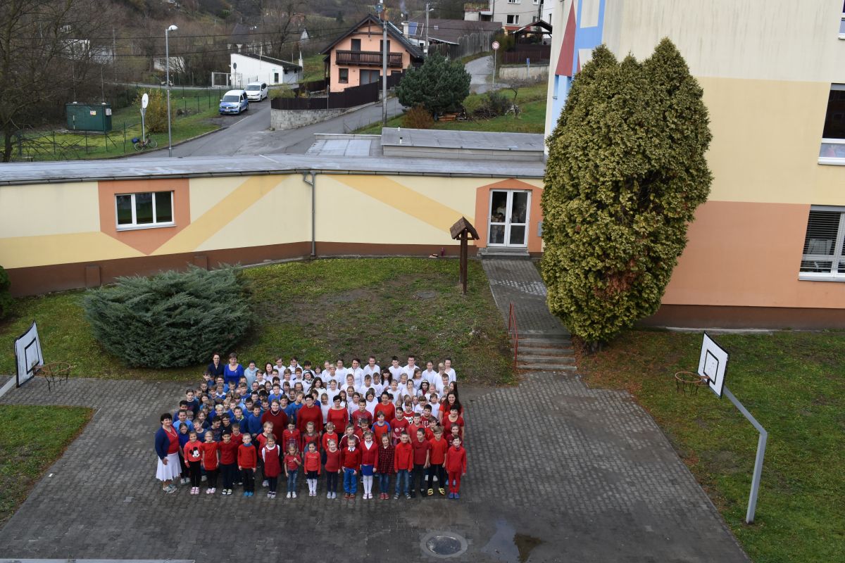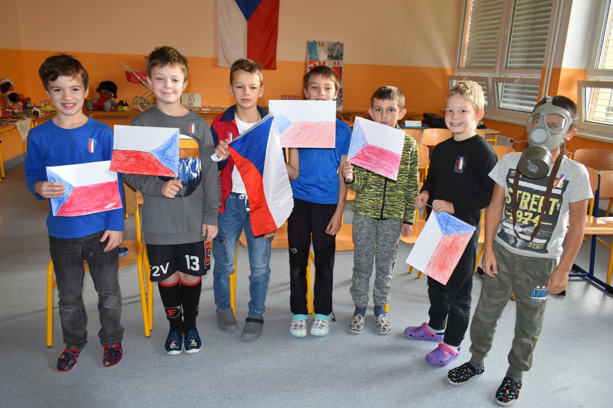 Zážitkové vyučování ještě umocnilo společné fotografování ve tvaru státní vlajky. Děti měly přijít oblečené v našich národních barvách.