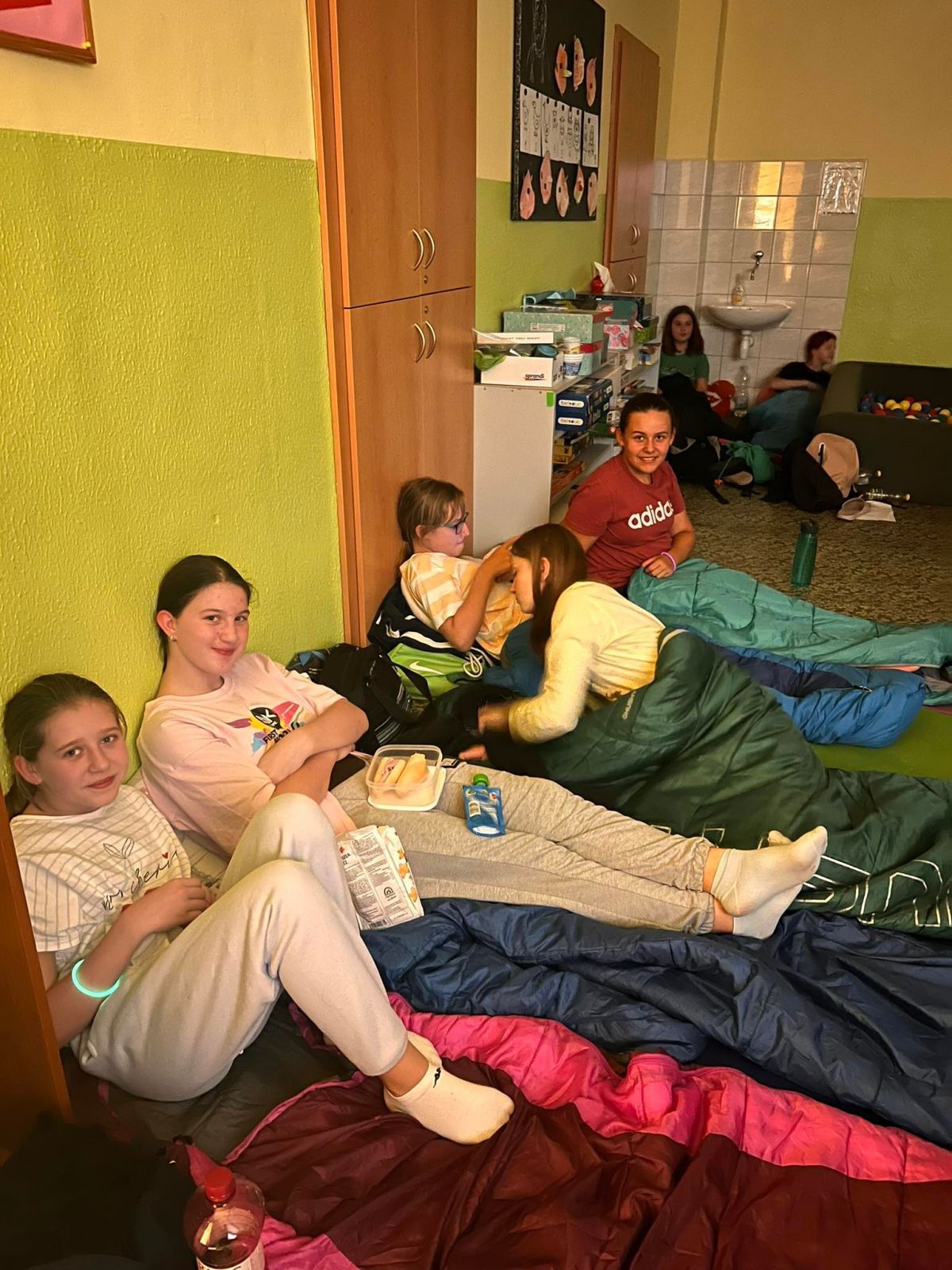 Přespávačka byla vážně super zábavná. Byla legrace :-) S holkama jsem nespaly skoro až do 3:30 ráno. Vážně jsem si užila i stezku odvahy. Všechno bylo super a byla také moc dobrá pizza.