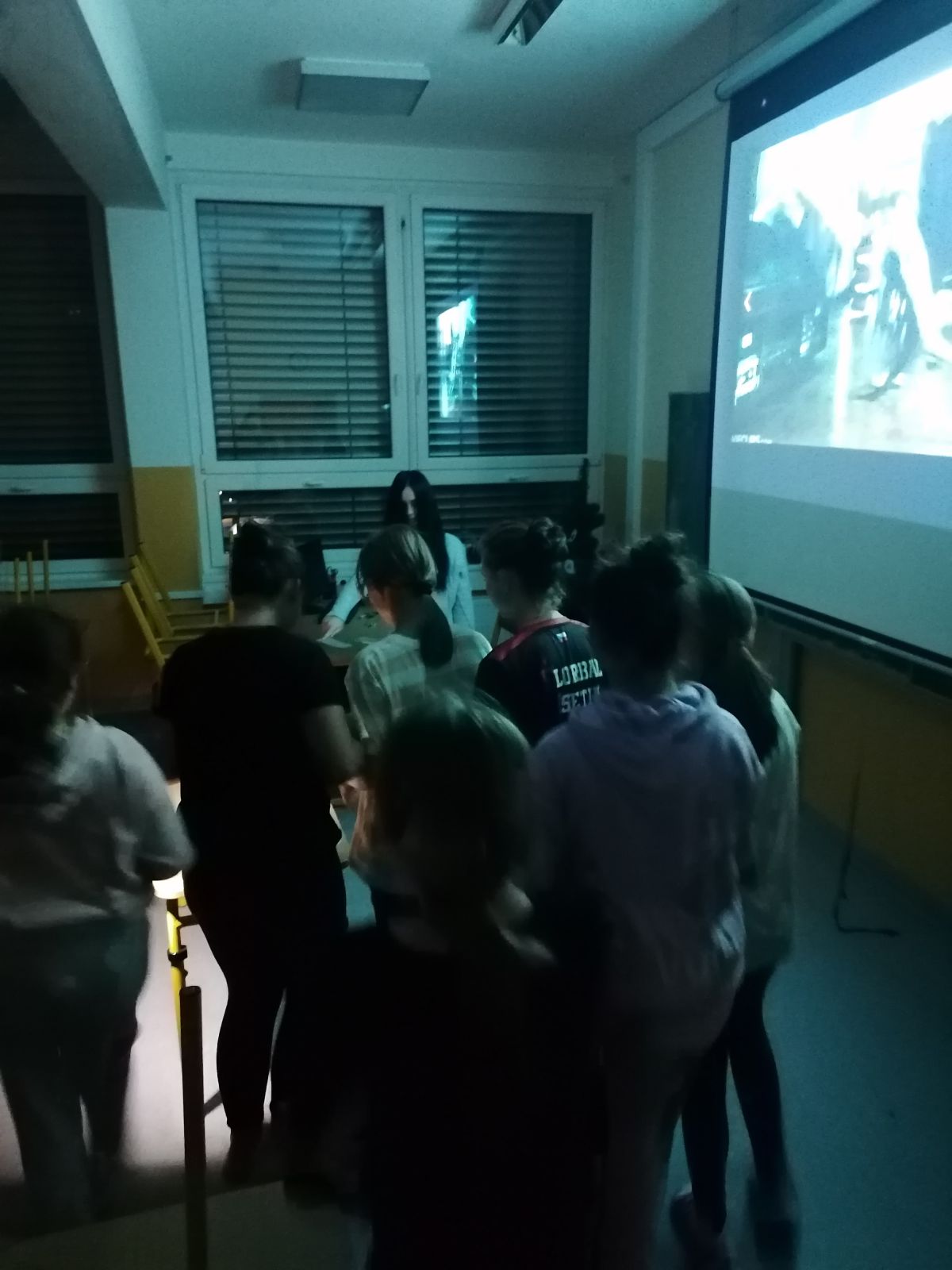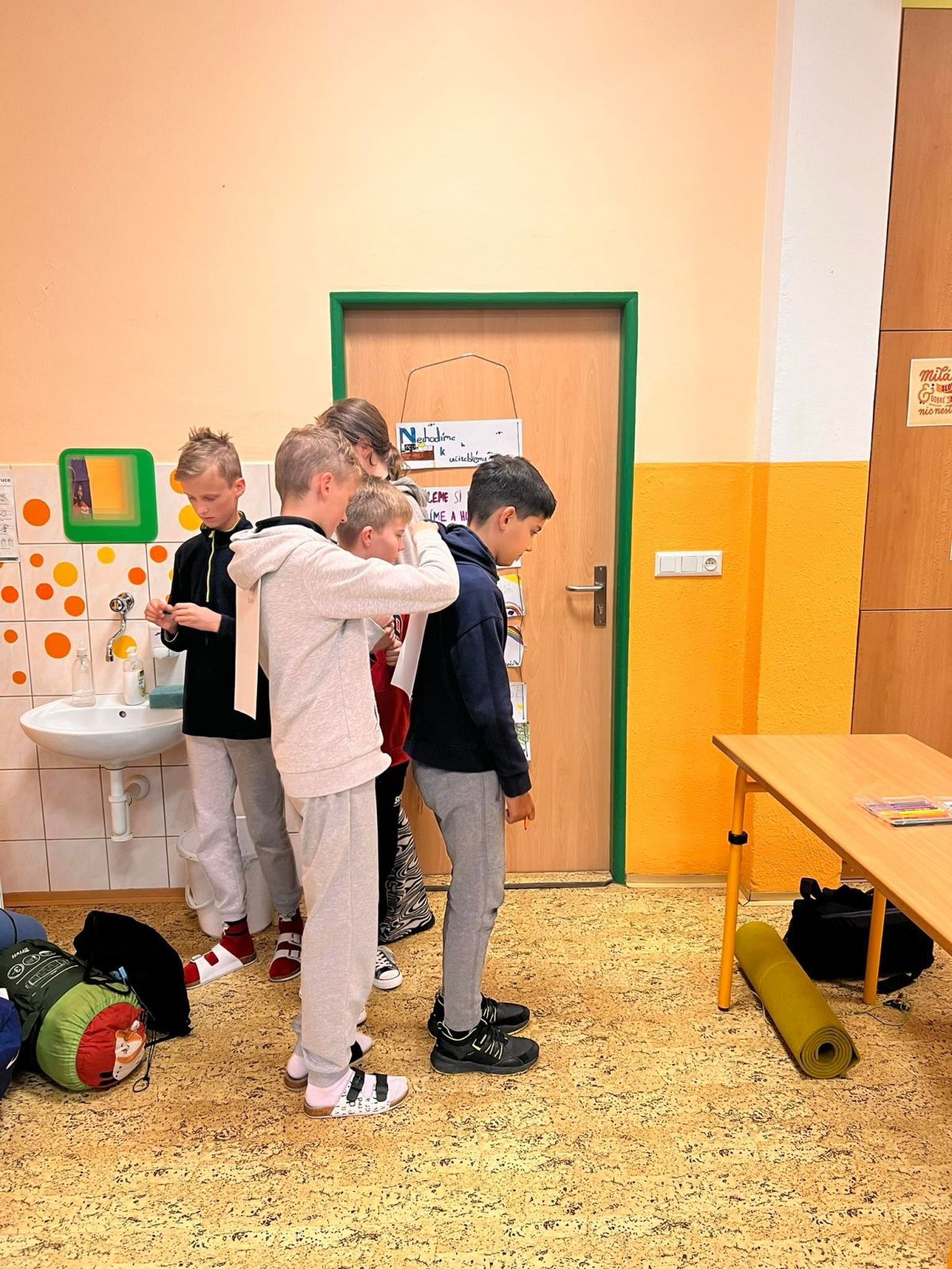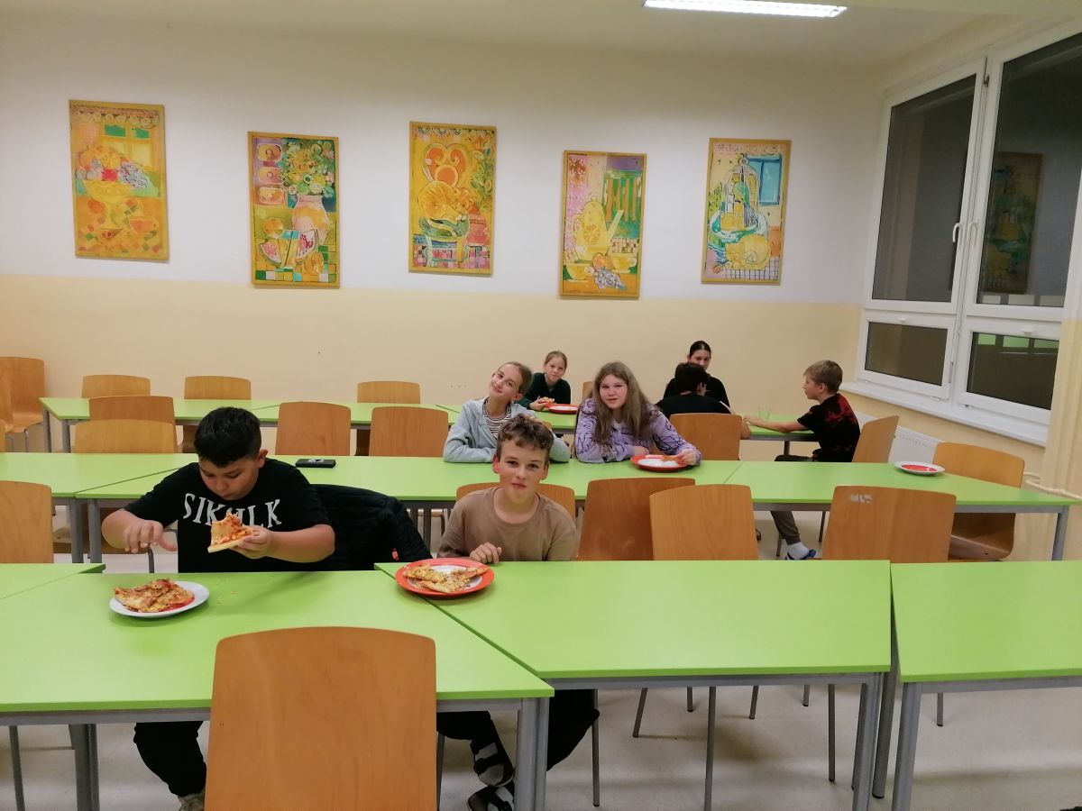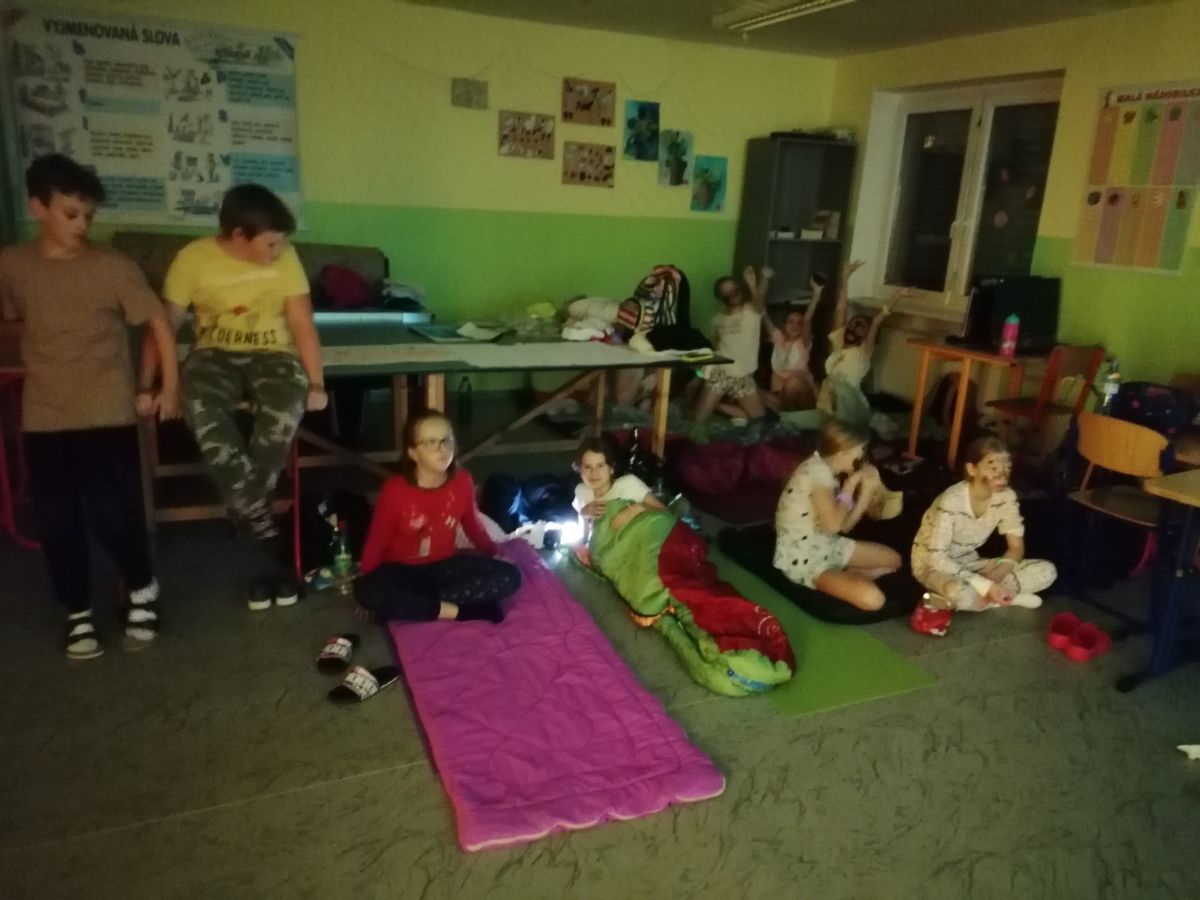 Program pro děti VI. A a VI.B byl velmi pestrý. Úvodní okénko strávili žáci s třídními učitelkami, poté se obě třídy postupně střídaly při různých aktivitkách (lezení na umělé lezecké stěně, příprava vynikající domácí pizzy). Zlatým hřebem večera byla tajemná noční stezka odvahy.