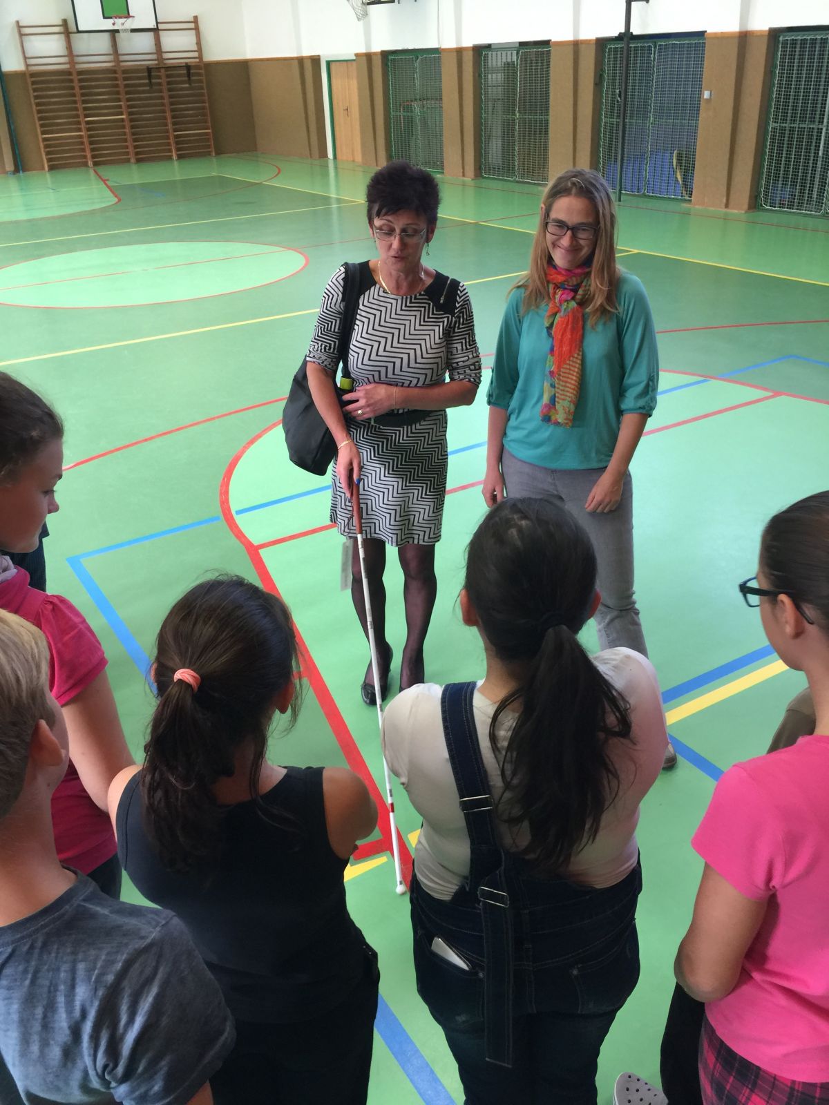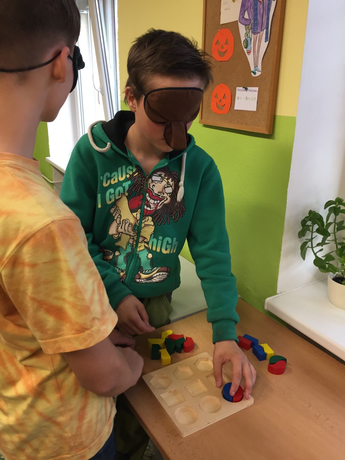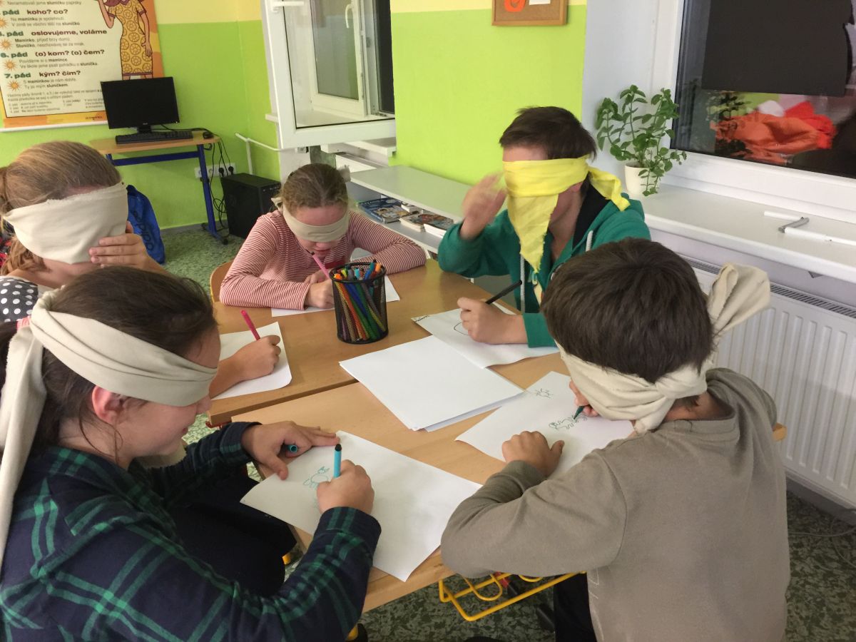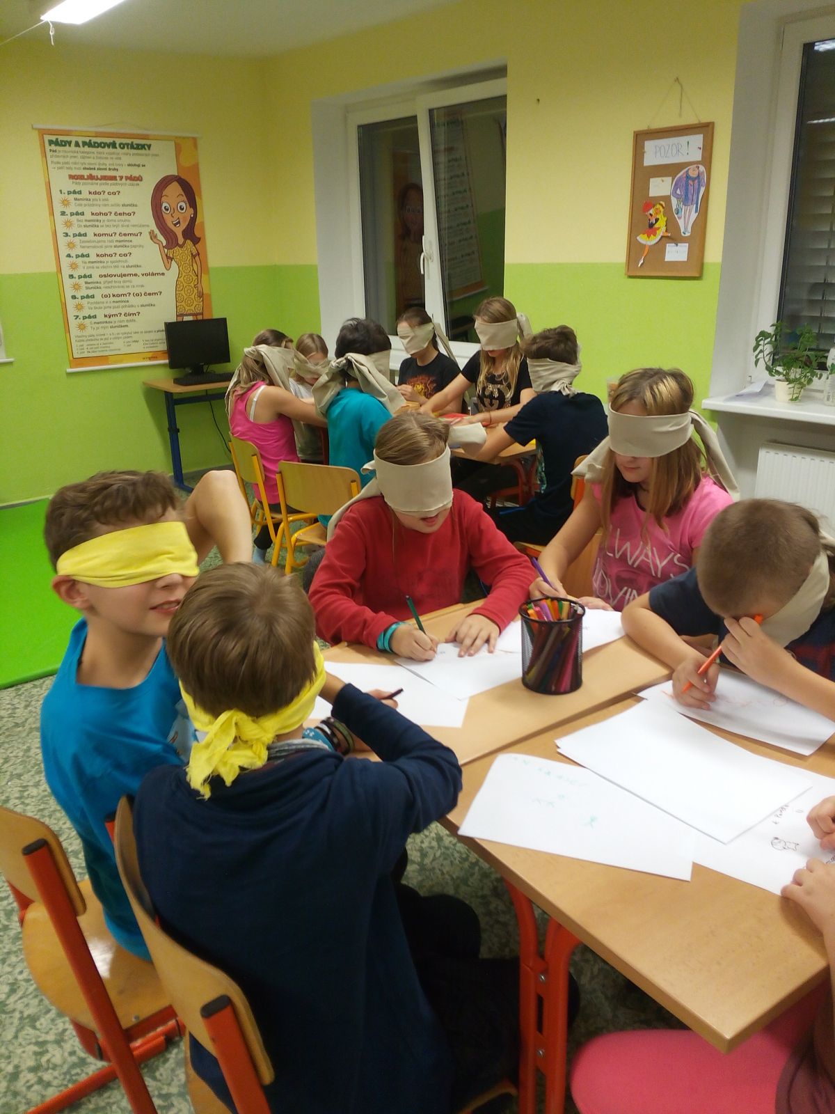 Díky návštěvě paní Ludmily Pavelkové ze Sjednocené organizace nevidomých a slabozrakých (SONS) si žáci VI.A mohli vyzkoušet chůzi za pomoci slepecké hole. Při této činnosti měli zavázané oči. Úkolem žáků bylo zdolat několik překážek, které jim křižovaly cestu. Žáci také měli možnost vyzkoušet si speciální brýle, které simulují různé stupně zrakového postižení, mohli si zahrát pexeso „pro uši“, seznámit se s Braillovým písmem, vyzkoušet si psaní na Pichtově psacím stroji, jíst i malovat se zavázanýma očima a spoustu dalšího.