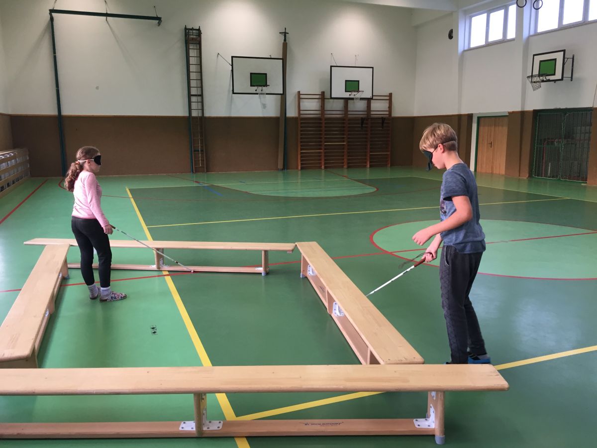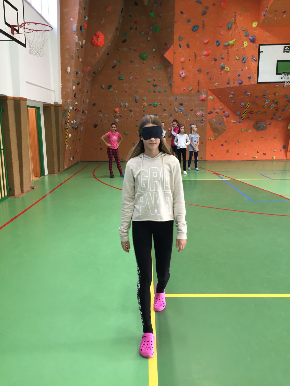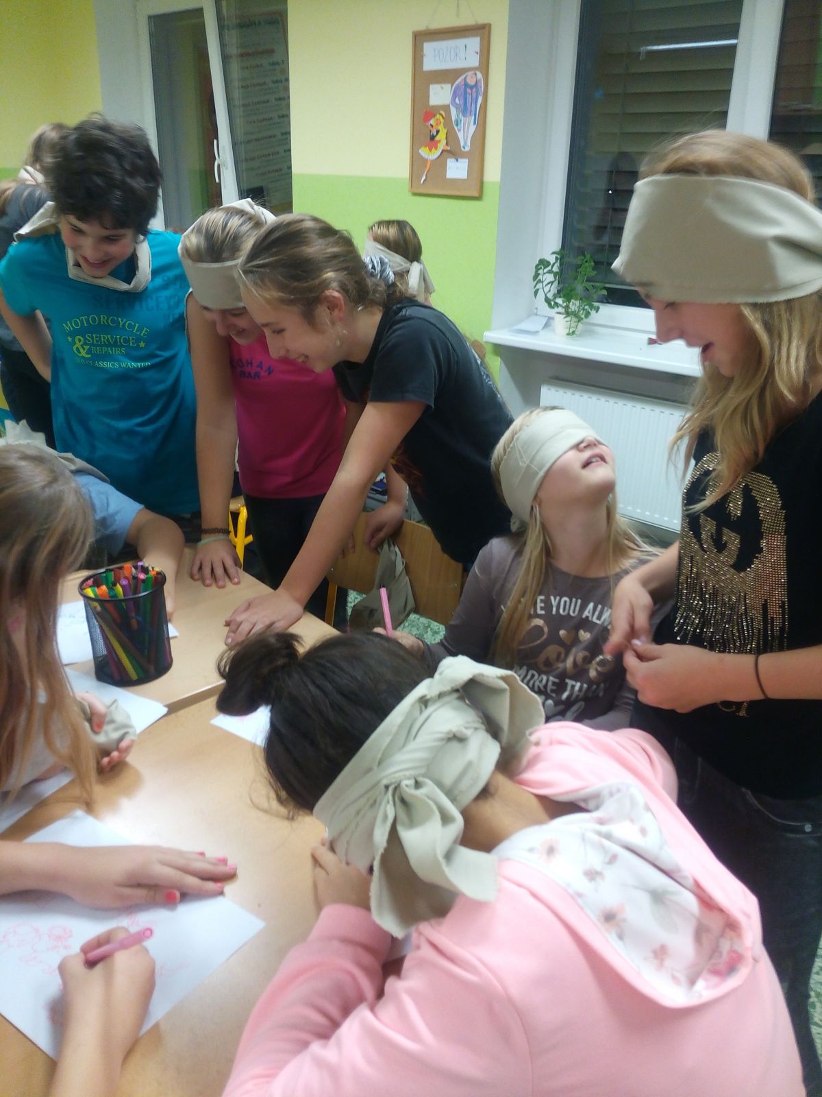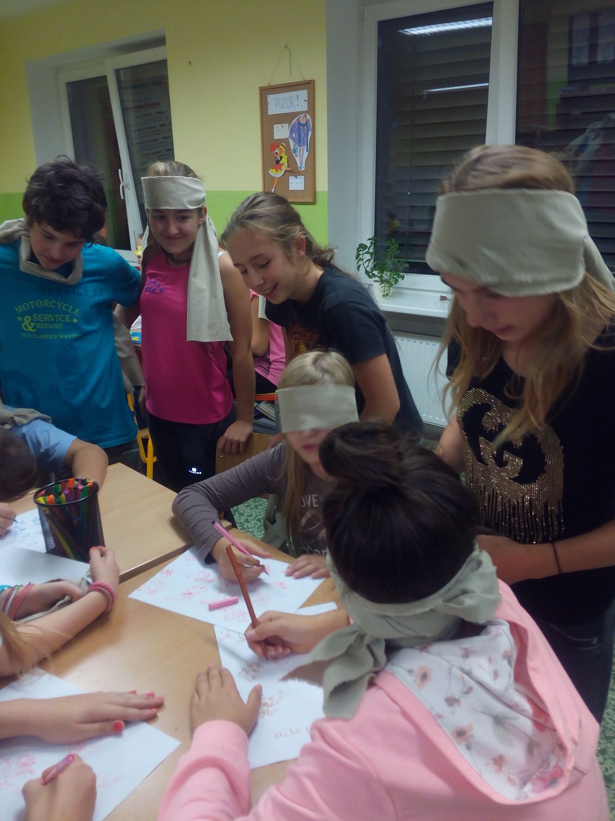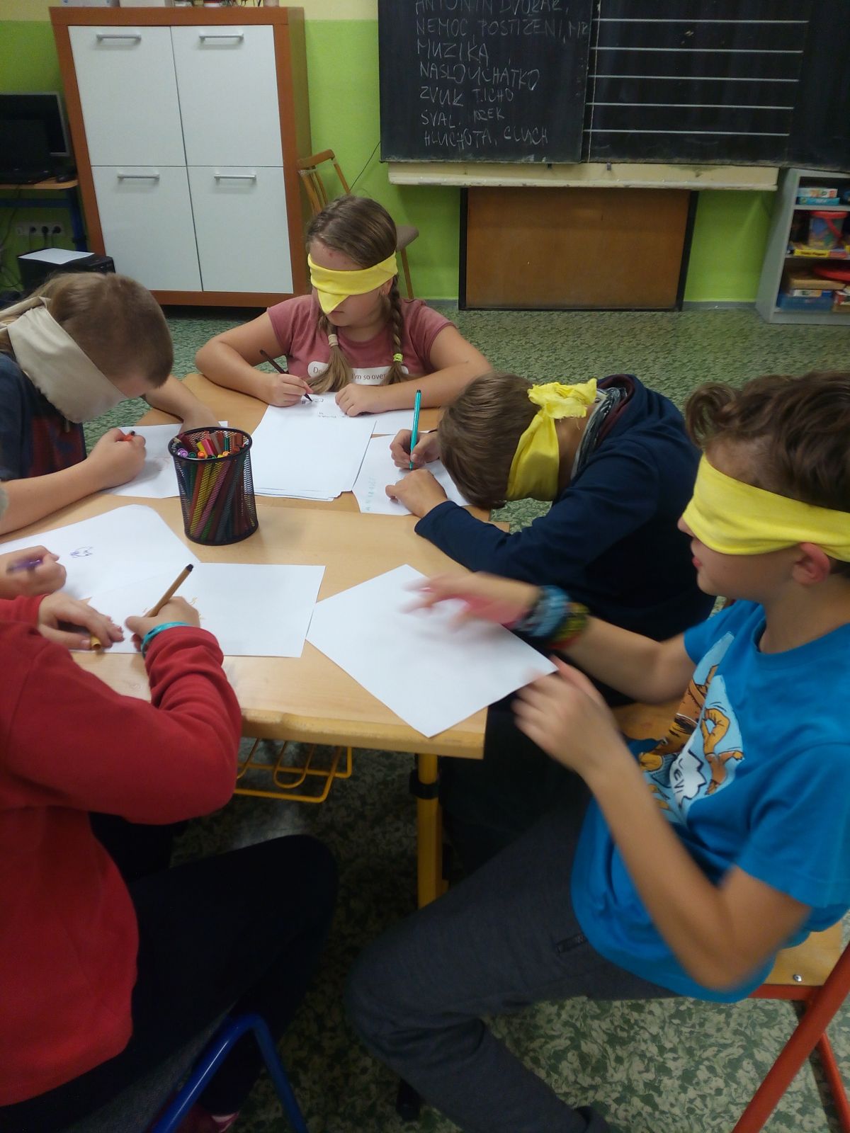 Díky návštěvě paní Ludmily Pavelkové ze Sjednocené organizace nevidomých a slabozrakých (SONS) si žáci VI.A mohli vyzkoušet chůzi za pomoci slepecké hole. Při této činnosti měli zavázané oči. Úkolem žáků bylo zdolat několik překážek, které jim křižovaly cestu. Žáci také měli možnost vyzkoušet si speciální brýle, které simulují různé stupně zrakového postižení, mohli si zahrát pexeso „pro uši“, seznámit se s Braillovým písmem, vyzkoušet si psaní na Pichtově psacím stroji, jíst i malovat se zavázanýma očima a spoustu dalšího.