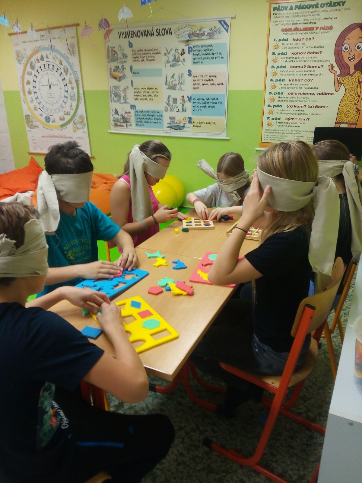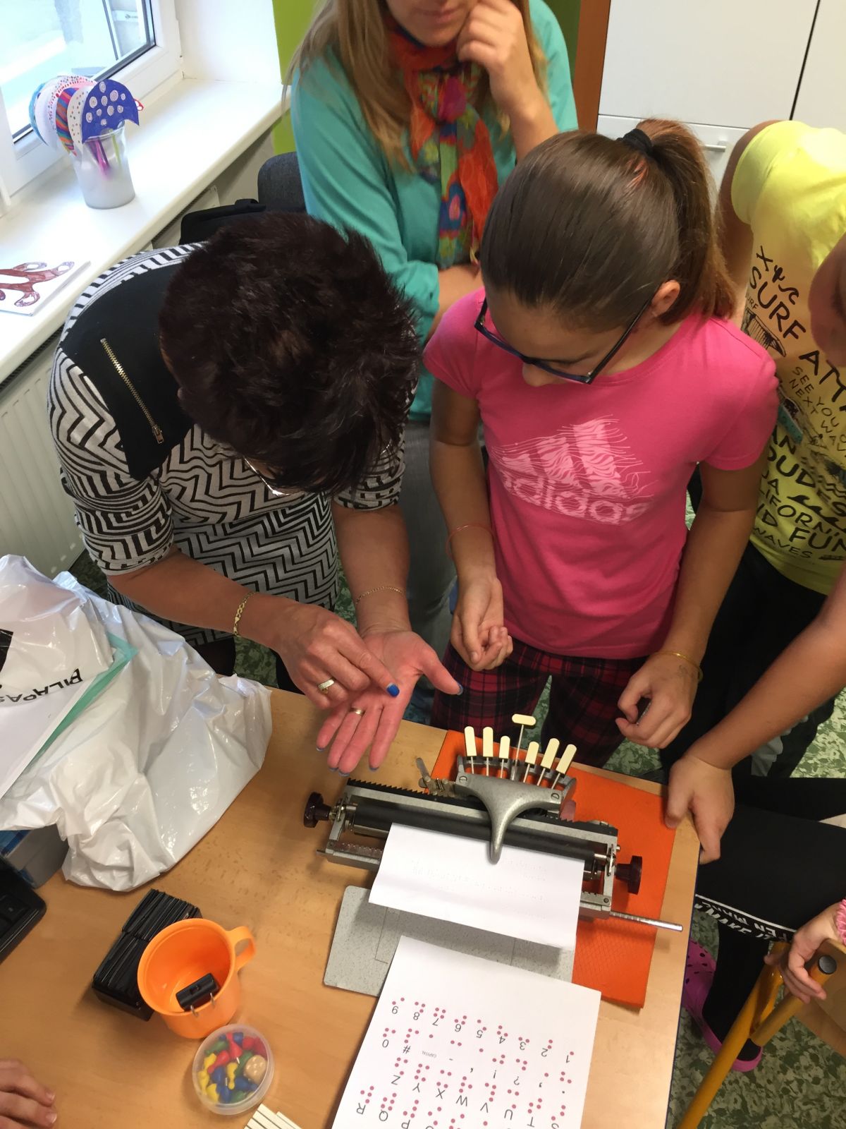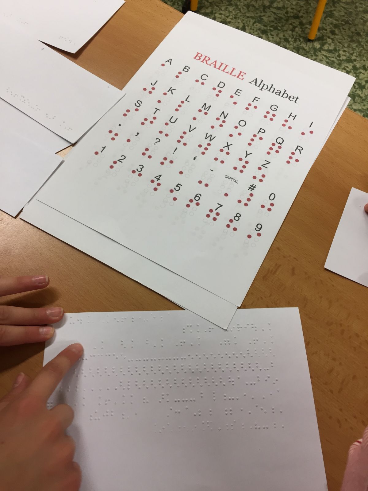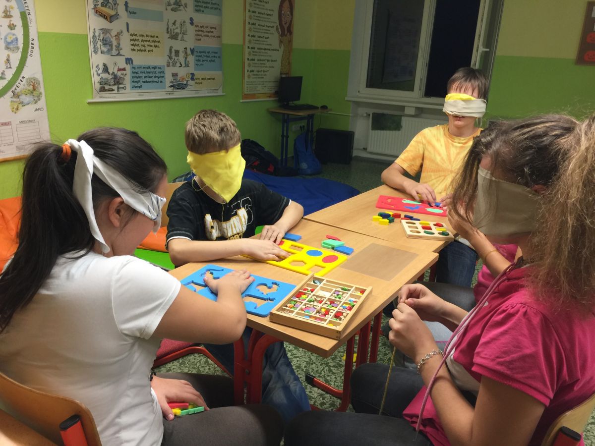 Díky návštěvě paní Ludmily Pavelkové ze Sjednocené organizace nevidomých a slabozrakých (SONS) si žáci VI.A mohli vyzkoušet chůzi za pomoci slepecké hole. Při této činnosti měli zavázané oči. Úkolem žáků bylo zdolat několik překážek, které jim křižovaly cestu. Žáci také měli možnost vyzkoušet si speciální brýle, které simulují různé stupně zrakového postižení, mohli si zahrát pexeso „pro uši“, seznámit se s Braillovým písmem, vyzkoušet si psaní na Pichtově psacím stroji, jíst i malovat se zavázanýma očima a spoustu dalšího.