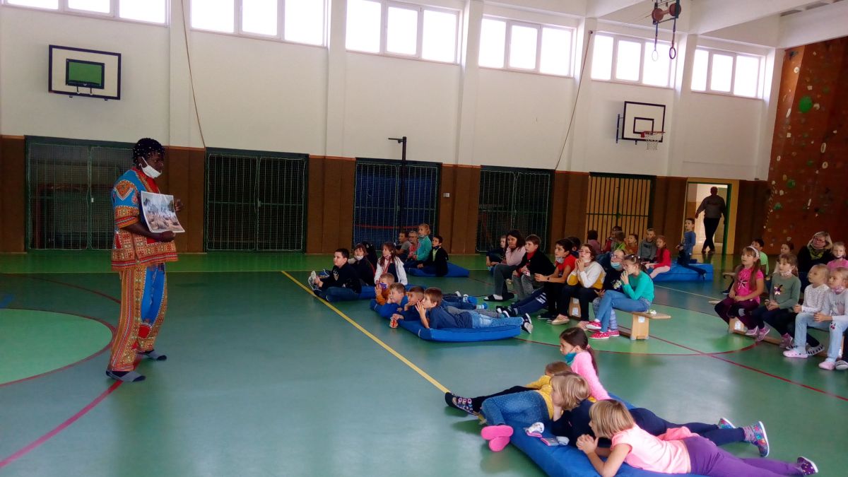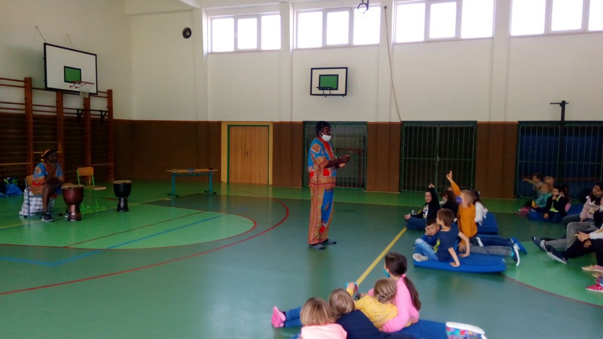 Děti ze všech oddělení školní družiny se sešly v tělocvičně, kde s nadšením očekávaly program o Africe v podání netradičních hostů. V úvodu jsme se dozvěděli o africké zemi Kongo a o životě a zvycích této vzdálené země. Na obrázcích děti sledovaly jak vypadá africká škola, africké vesnice a města. V neposlední řadě poznávaly zvířata vyskytující se ve volné přírodě. Do vyprávění se zapojily i naše děti, a tak mohly ukázat své znalosti.