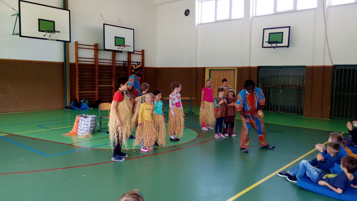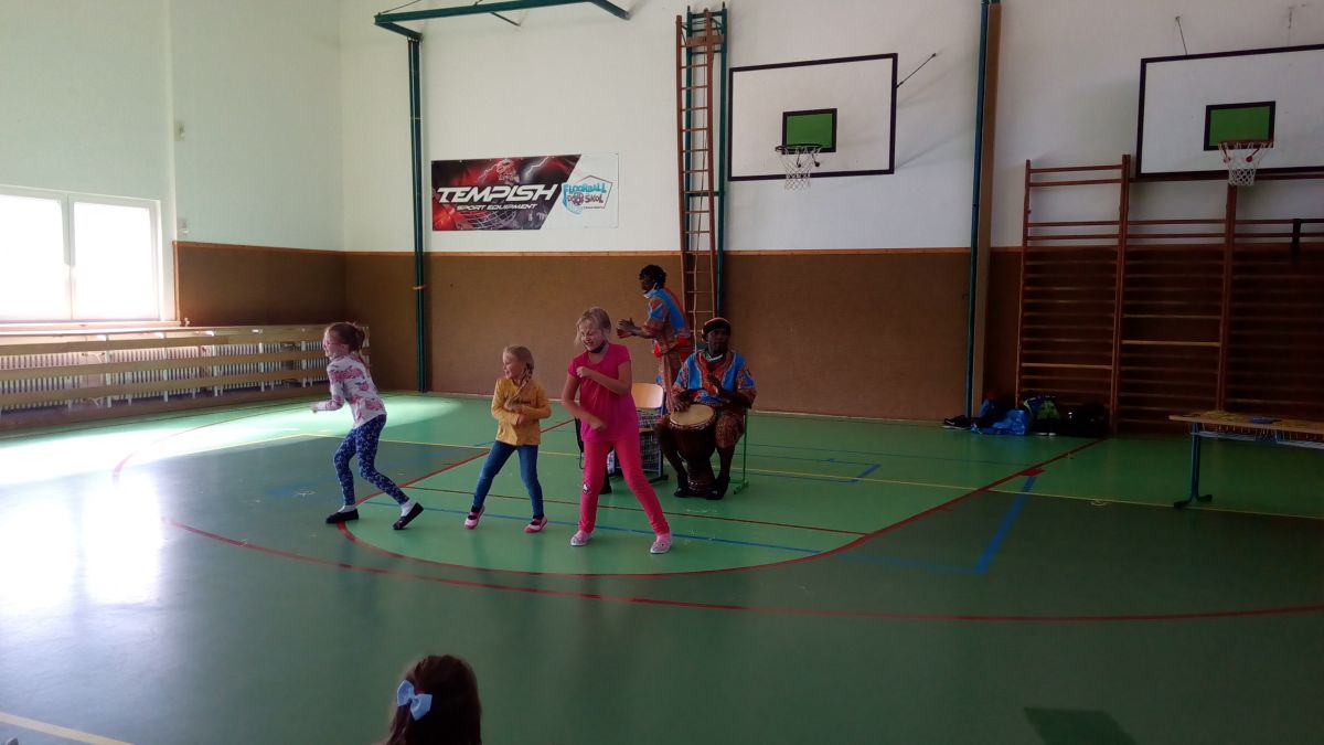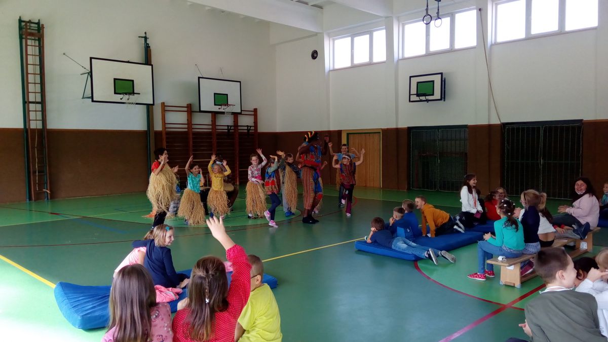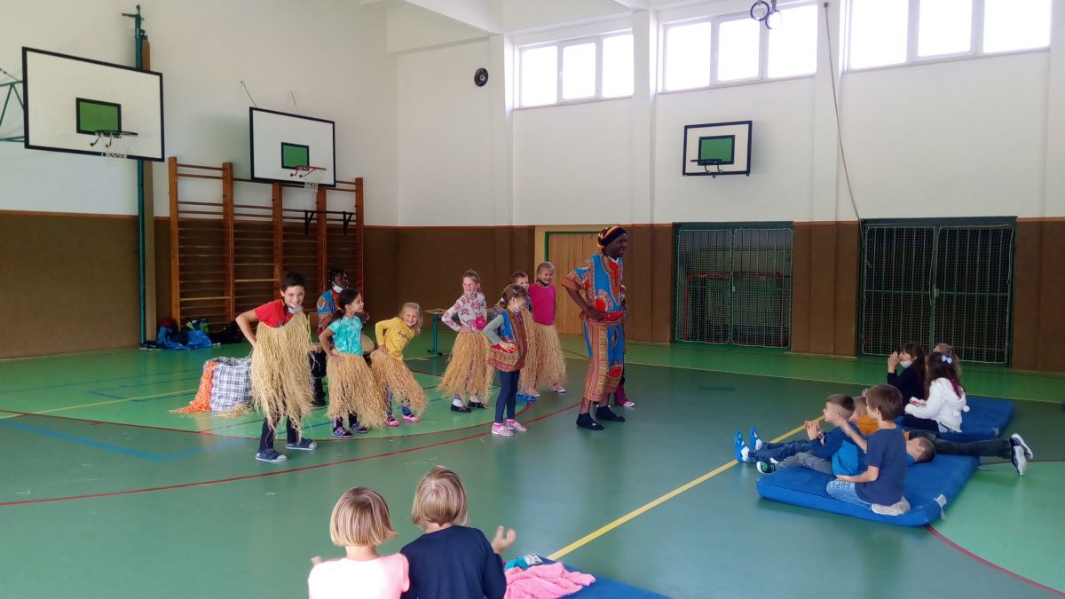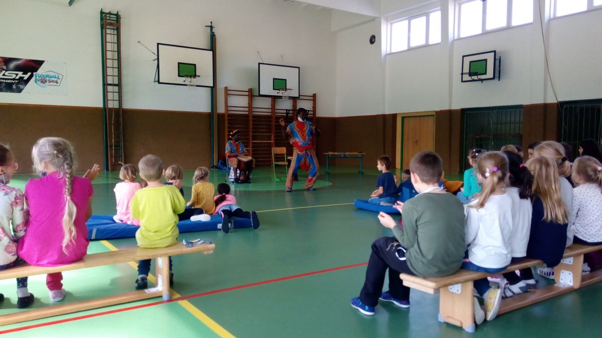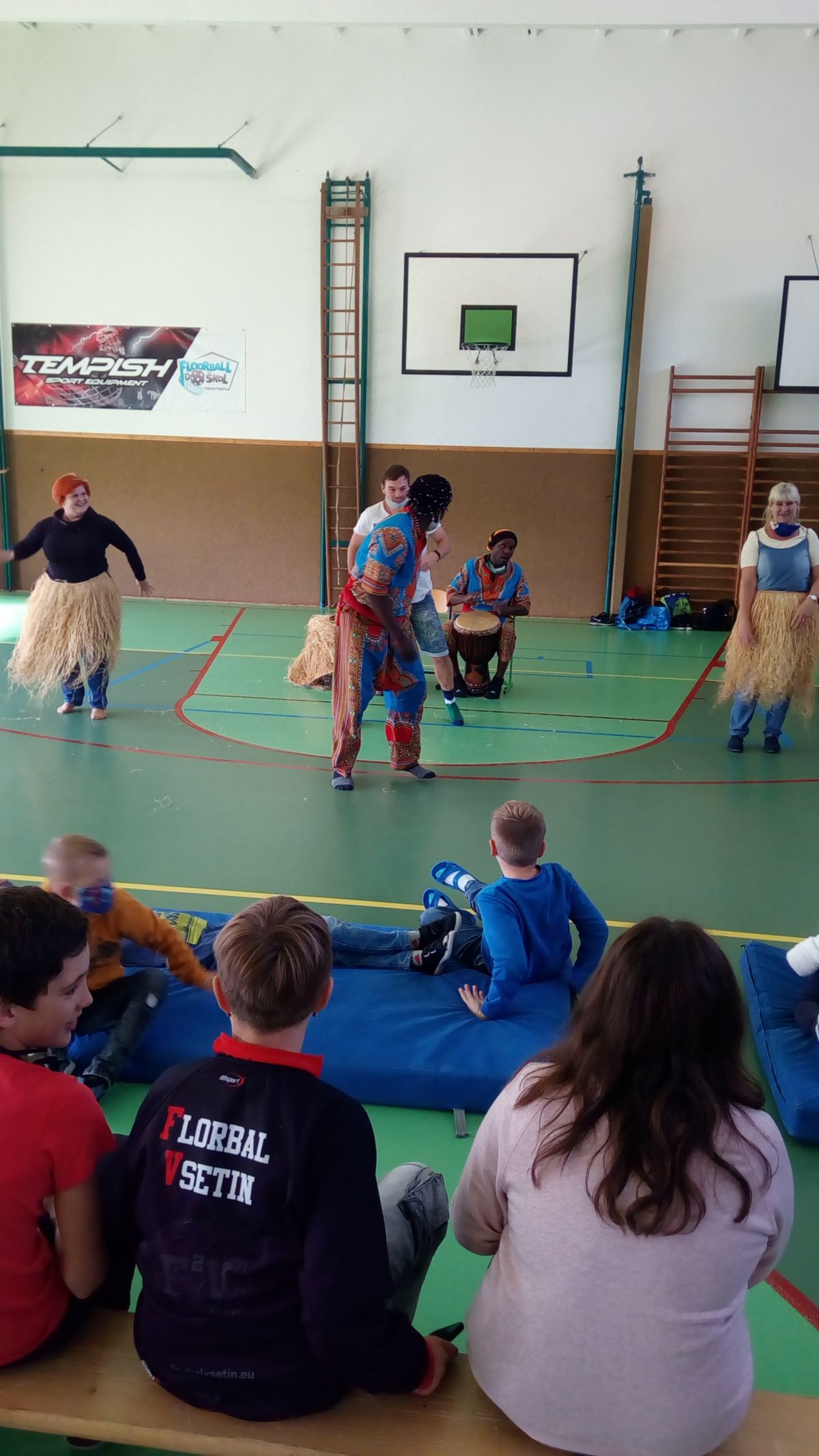 Poté předvedli hudebníci africký folklor-bubenické, pěvecké i taneční umění. Do zpěvu a tance byli zapojeni všichni přítomní. Zvláště tanec zvedl děti z laviček a po celé tělocvičně se tančila zumba. Po programu si děti zakoupily náramky a náhrdelníky z afrických korálků jako suvenýr na nezapomenutelný zážitek.