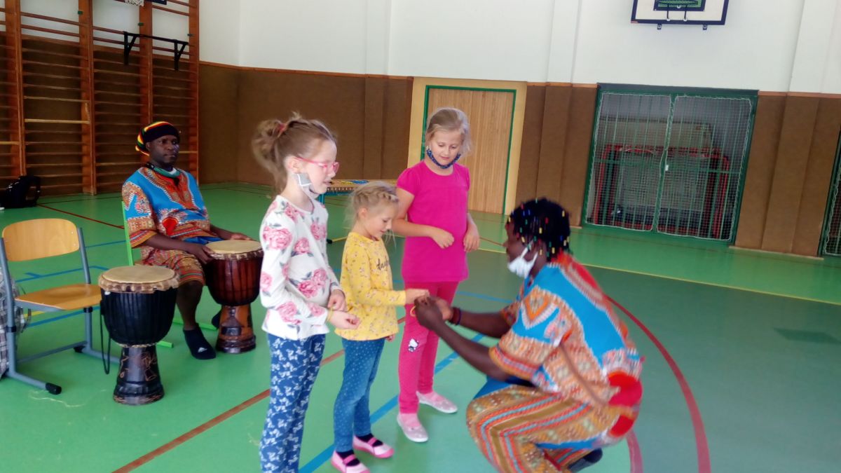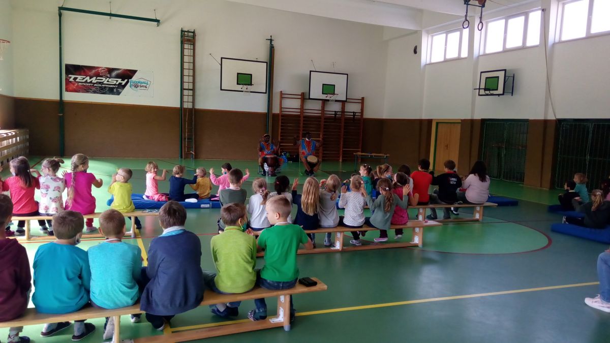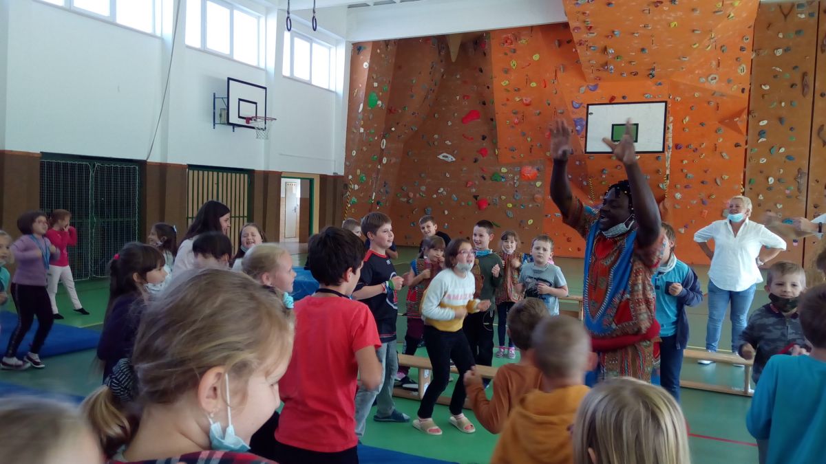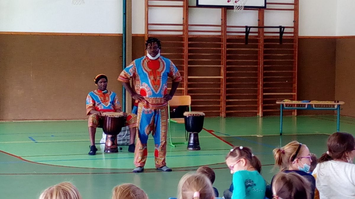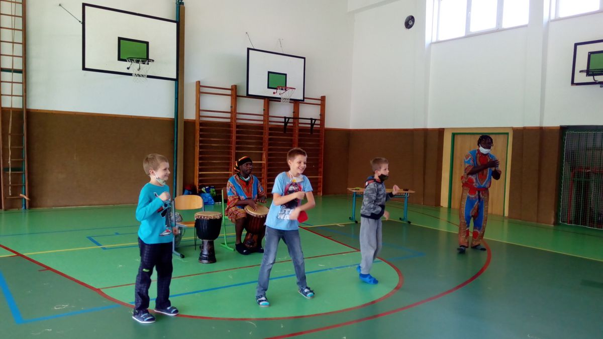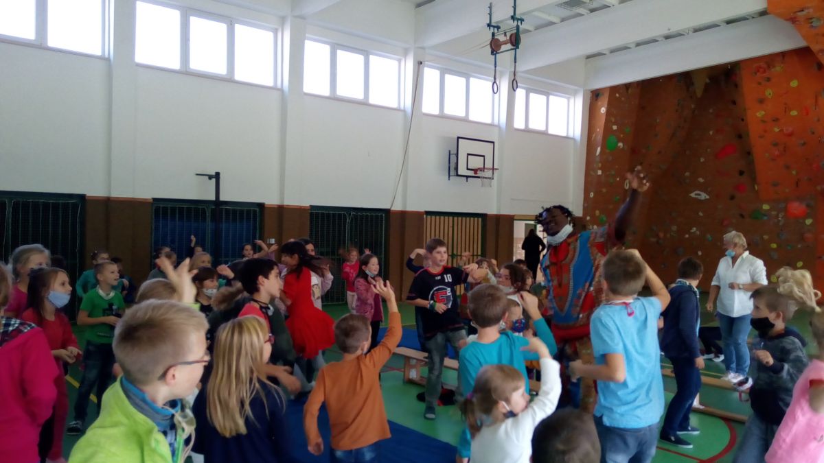 Poté předvedli hudebníci africký folklor-bubenické, pěvecké i taneční umění. Do zpěvu a tance byli zapojeni všichni přítomní. Zvláště tanec zvedl děti z laviček a po celé tělocvičně se tančila zumba. Po programu si děti zakoupily náramky a náhrdelníky z afrických korálků jako suvenýr na nezapomenutelný zážitek.