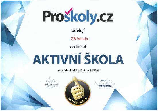 Proškoly.cz uděluje naší škole certifikát AKTIVNÍ ŠKOLA.