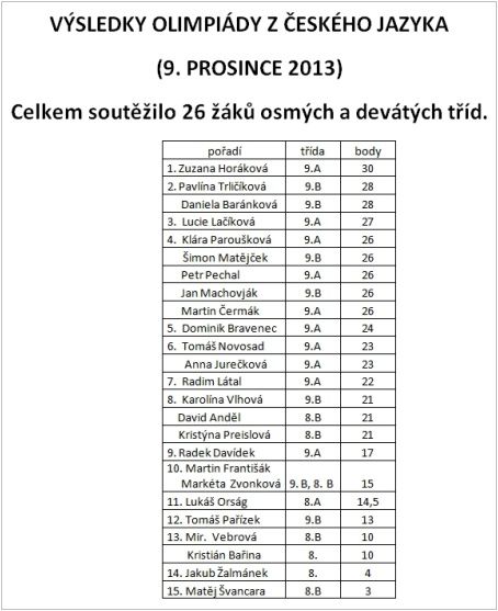 Byli naladěni protestně (většina z nich obléknutá do sportovního úboru nejčastěji označovaného jako tepláky) i zvědavě (co se to zas bude dít). Neměli v úmyslu čekat na výdej obědů, jak by se podle místa mohlo zdát, ale na výdej soutěžních úkolů Olympiády z českého jazyka, který měl prověřit jejich interakci s předmětem český jazyk. Zadání bylo nejlepší možné – hrátky s významy, tedy se předvádělo, do jaké hloubky jsou soutěžící schopni promýšlet mateřský jazyk. Tlak byl vyvíjen i na vlastní tvůrčí činnost – tím nenarážím jen na sloh, ale zejména na schopnost si s jazykem tvořivým způsobem pohrát. Když se překonaly počáteční rozpaky a údiv, vznikly na soutěžních listech neuvěřitelně krásná, zbrusu nová česká slova – není třeba nazývat tele teletem, narodilo se nám i nové pojmenování – mikrotele, stejně tak nudné označení pro dveře lze nahradit slovy vchodovstup, otvírač, klikozmáč apod. A poznáte, jakým slovotvorným postupem tato slova vznikla? Soutěžící ve velké většině naprosto suverénně! A protože je v češtině nezbytné být stále ve střehu, někde se do textu vloudila gramatická chyba. Kdo ji odhalí, může si přijít k p. uč. Chrobákové pro véééééélkoooou odměnu!