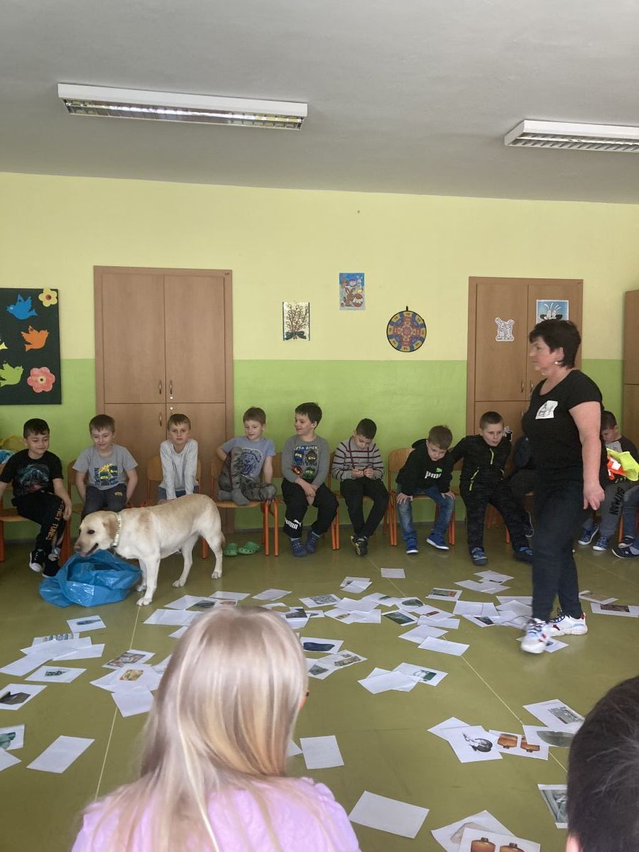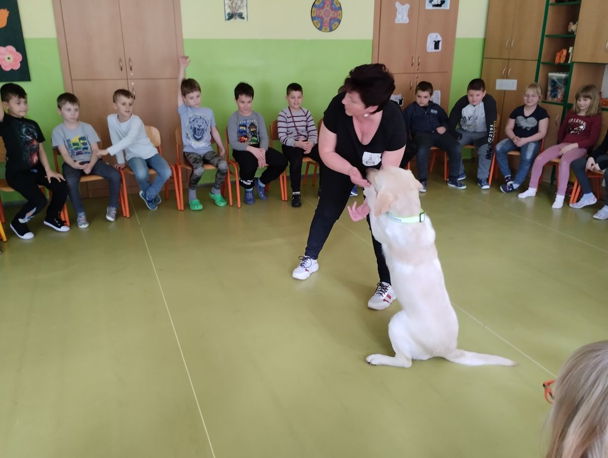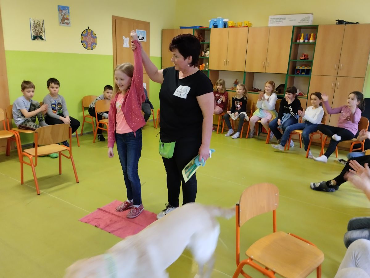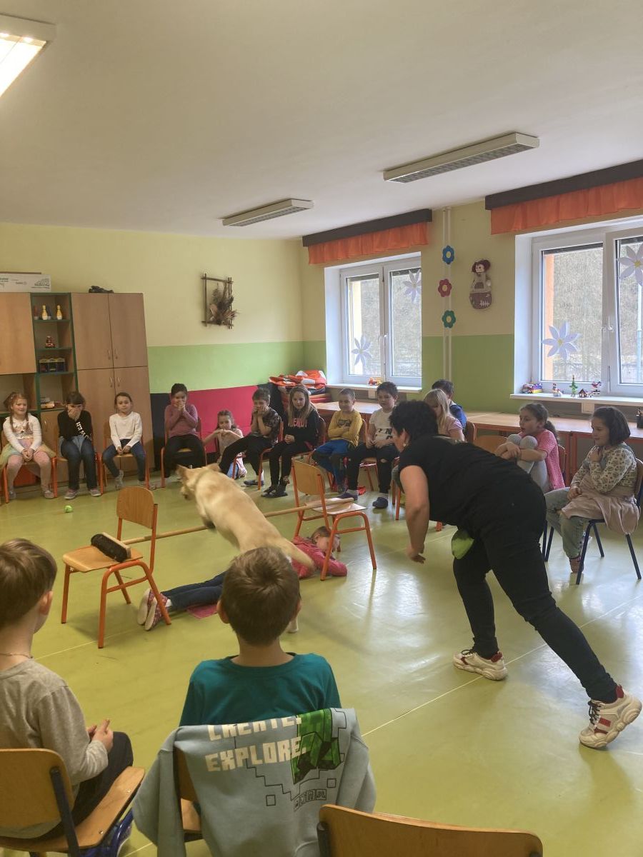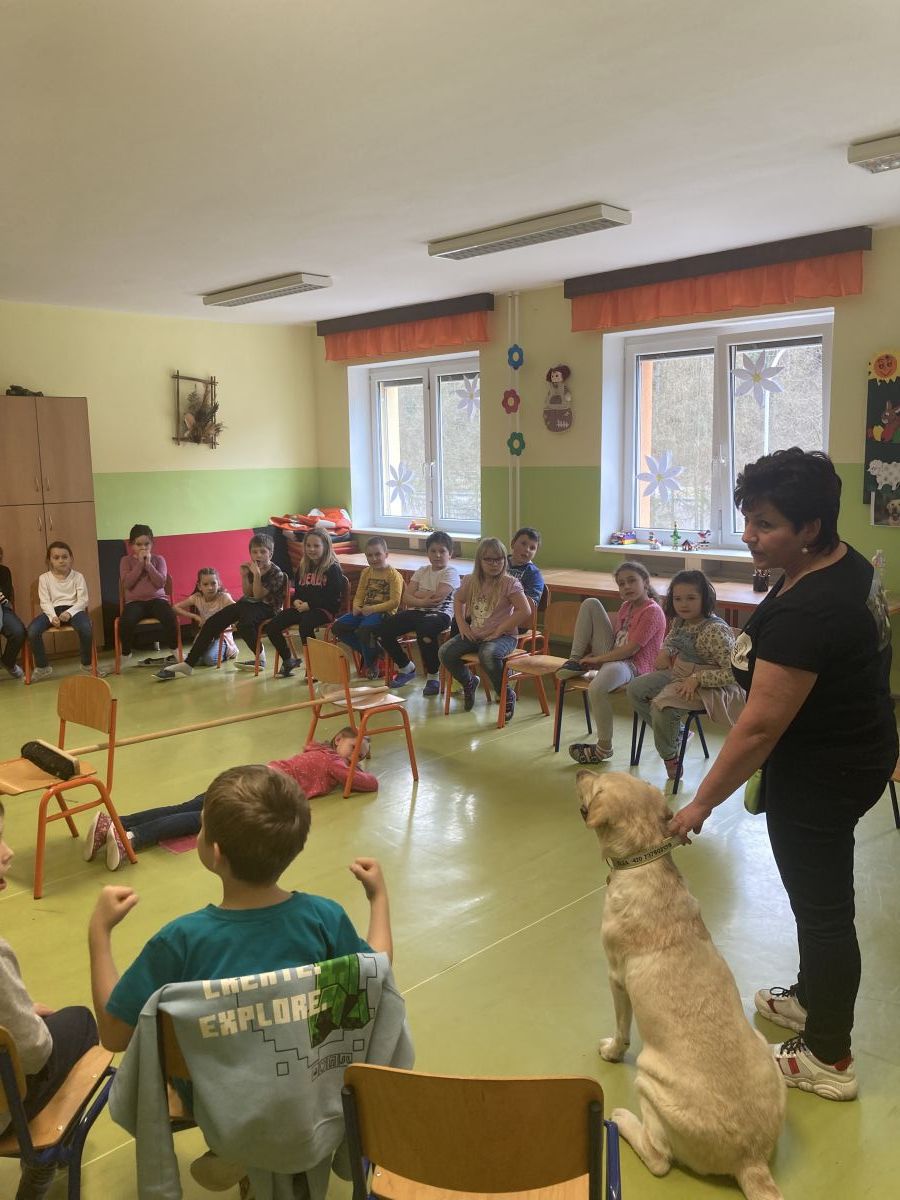 V minulém týdnu přišla do školní družiny velká návštěva. Byla to fenečka Elza se svojí paničkou – vedoucí lektorkou canisterapeutického týmu – Pavlínou Dujkovou. Elza se velmi rychle spřátelila s dětmi, předvedla, co všechno umí. Například jak se dokáže starat o nemocného, nosit předměty a výborně reagovat na povely své paničky.