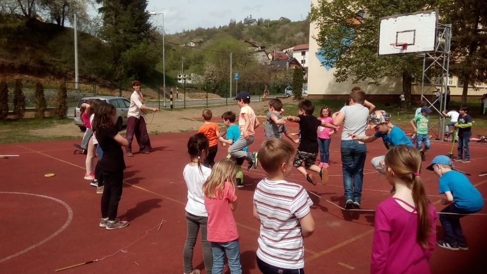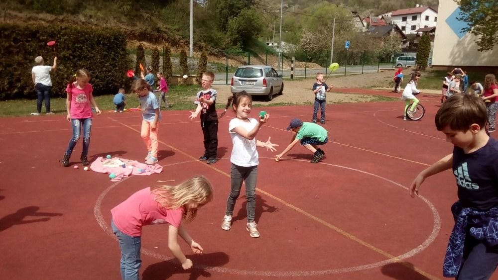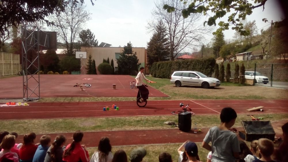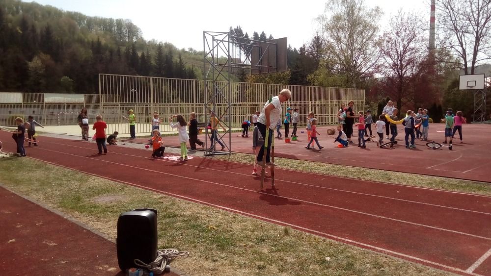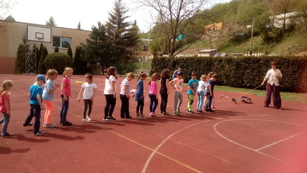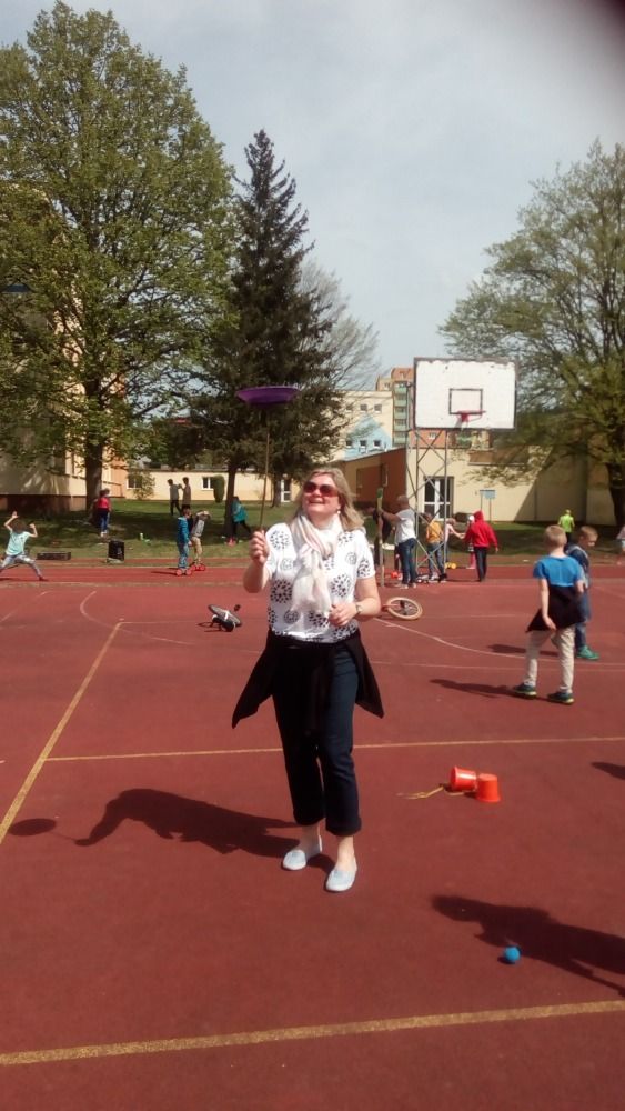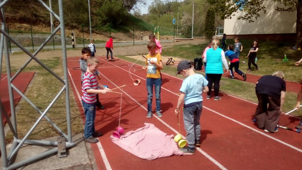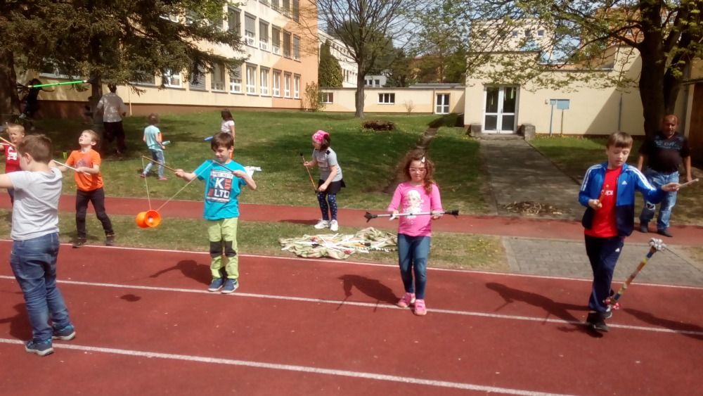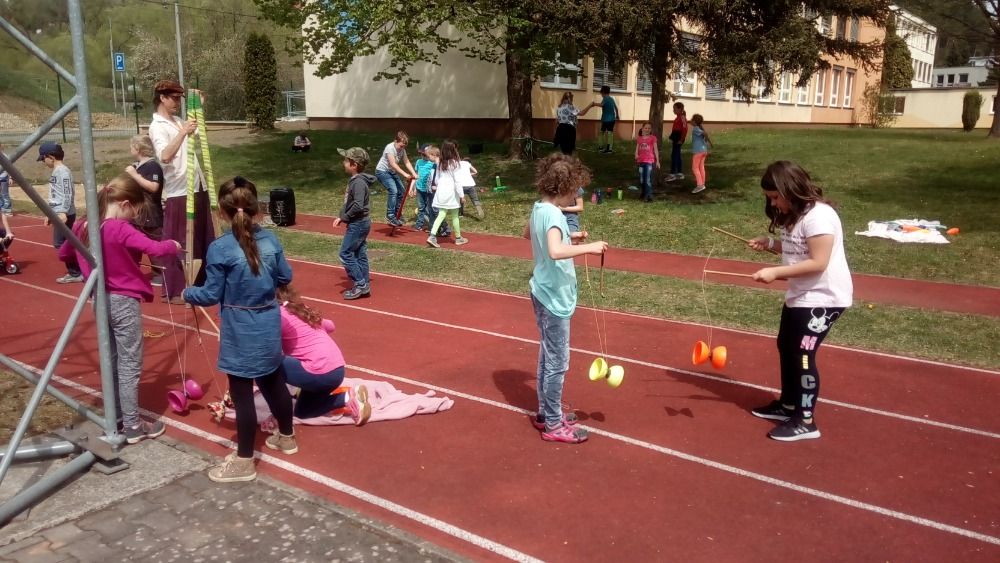 Školní hřiště ZŠ VSETÍN, LUH bylo zaplaveno množstvím pomůcek – kruhy, míčky, šátky, talíři, diaboly, flowersticks, trubky. Udržení rovnováhy trénovaly děti na mini tříkolce, jednokole, skákací tyči či pedalu. Neodolaly ani paní vychovatelky a s elánem se zapojily do nácviku.