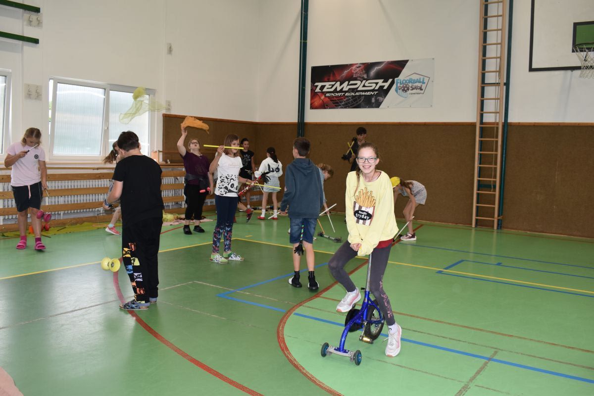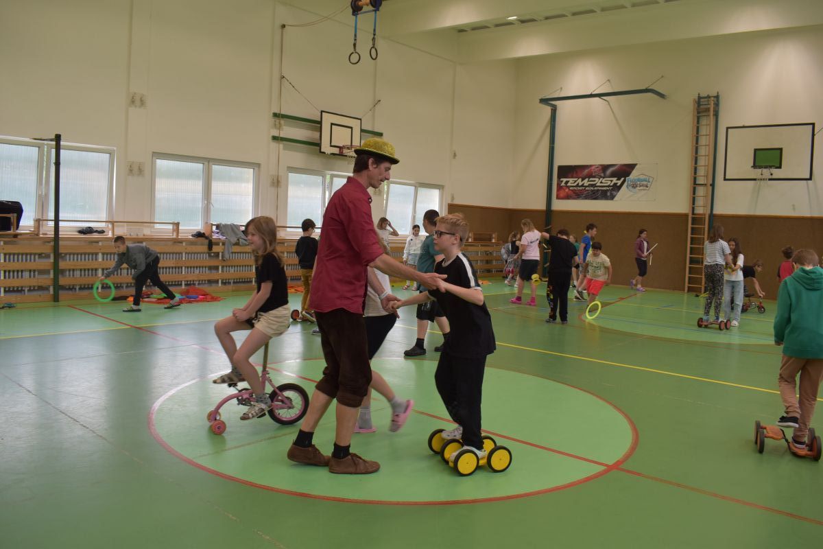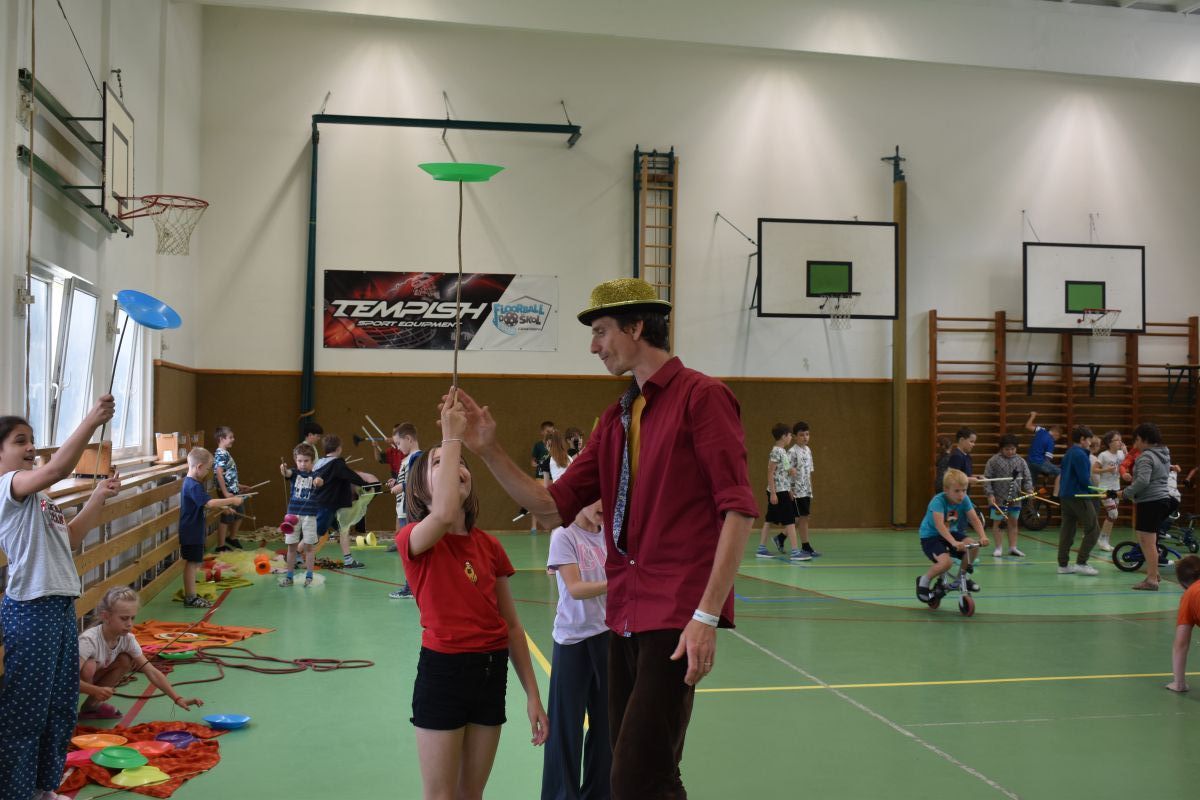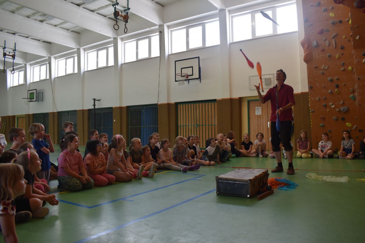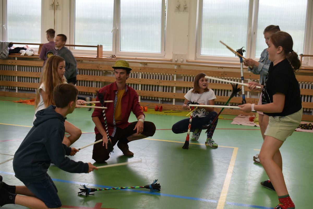 Po úvodním seznámení s dětmi a společné pohybové aktivitě vystoupil lektor s ukázkami všech pomůcek s vysvětlením principů. Na rozložených stanovištích si žáci vyzkoušeli jednotlivé cirkusové pomůcky, kde byl lektor k dispozici v pomoci, vysvětlení a nácviku. Jak se dětem cirkusové kousky dařily se můžete podívat na pořízených fotografiích.