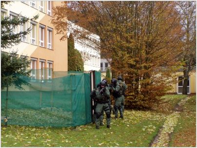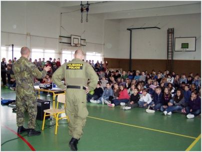 Zvláštní pozornost pak vyvolala přítomnost několika maskovaných mužů u vchodu školy. Přítomnost příslušníků vojenské policie si vyžádal nácvik funkčnosti systému civilní ochrany v rámci ochrany života při mimořádných událostech. Do pohotovosti byl uveden systém krizového řízení školy, došlo k prověření únikových cest. Další část programu navazovala na výuku. Žákům byly předvedeny ukázky ze zásahu speciální jednotky, výcviku psů. V besedě došlo na vysvětlení významu mezinárodních vojenských misí a úlohu ČR v tomto systému.