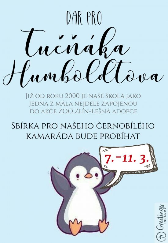 Každoročně na naší škole probíhá sbírka na našeho adoptovaného kamaráda ze Zoo Zlín - Tučňáka Humboldtova, kterého jsme si adoptovali. Už v počátcích jejich chovu v roce 1997 jsme se rozhodli přispívat drobným finančním darem, aby se těmto krásným, v našich klimatických podmínkách nezvyklým tvorům, dařilo co nejlépe. K podpoře Zoo se můžete přidat od 7.- 11.3. Minimální částka je 10 Kč.