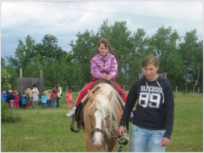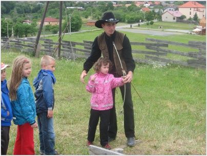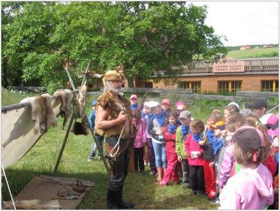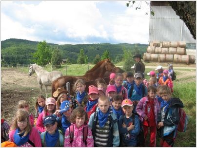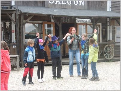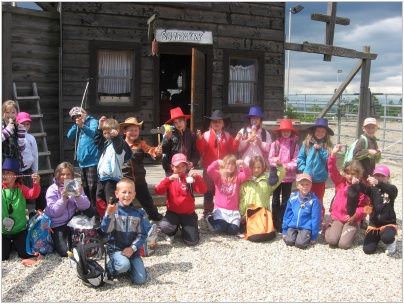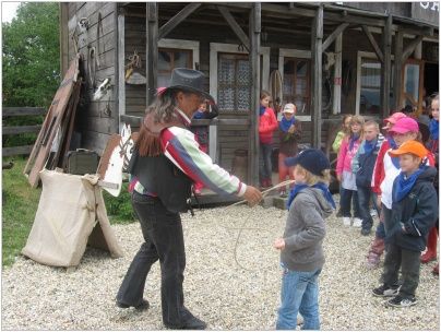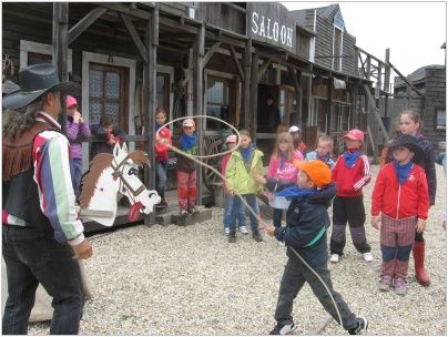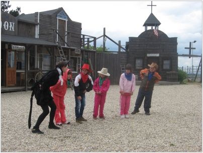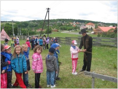 Při prohlídce areálu westernového městečka nám místní šerif ukázal vše, co k dobrému westernu patří – Saloon, banku, úřad šerifa a kostelík s hřbitovem. Navštívili jsme indiánskou vesnici, prohlédli si teepee a poznávali život původních obyvatel Ameriky. Zastavili jsme se také u trapera, lovce kožešin. Během programu měly děti jedinečnou možnost vyzkoušet si střelbu lukem, házení lasem a tomahavkem, což jsou způsoby lovu a boje „divokého západu“. Nejlákavější pro všechny byla jízda na koních.