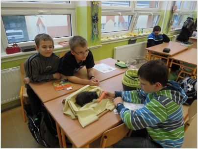 Na Den mazlíčků, kdy stráví vyučování se svými zvířátky, se všichni moc těšili. Rozmanitost předčila naše očekávání- křečci, morčátka, králíčci, 2 kočičky, potkan, andulky, pavouk...Žáci si na úvod velmi pěkně připravili krátké povídání o svém zvířátku, které doplnil o odborný komentář pan veterinář.