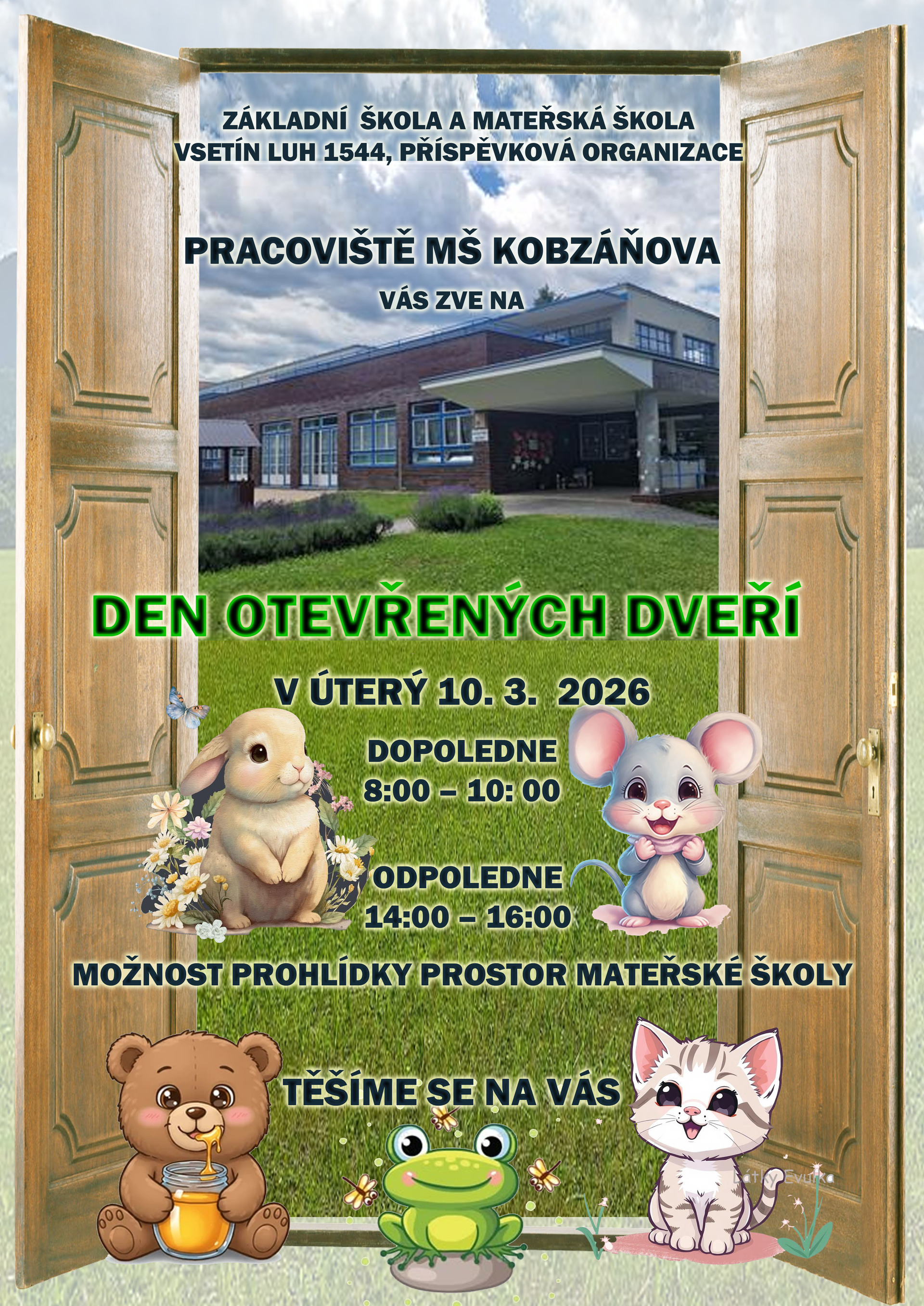 Vážení rodiče a milé děti, mateřská škola Kobzáňova vás srdečně zve na DEN OTEVŘENÝCH DVEŘÍ, který proběhne v úterý 10.3.2026 dopoledne od 8:00 do 10:00 a odpoledne od 14:00 do 16:00. Přijďte se seznámit s pedagogy a s prostředím naší školy. Těšíme se na vás!