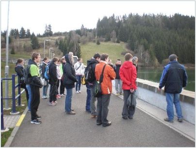 Po příjezdu se třídy rozdělily. 8. A šla nejprve na úpravnu vod, kdežto 8. B na přehradu. Když jsme došli na přehradu, museli jsme chvíli čekat na našeho průvodce, pana hrázného. Poté následovala procházka po 390 m dlouhé přehradě, kde nám pan hrázný sdělil několik informací o historii této přehrady. Jelikož jsme při čekání na našeho průvodce pěkně vymrzli, tak jsme se zahřáli rychlým sestupem dolů po dlouhých schodech ke strojovně. Když jsme došli do strojovny, zavedl nás pan hrázný k velkým pancéřovým dveřím, které otevíraly tunel pod přehradou vedoucí do řídící věže. S křikem jsme prošli temným tunelem, až jsme se dostali na místo určení. Nad hlavami jsme měli 15 m vysoký strop. Všude byla spousta trubek a různých zařízení. Zde nám pan hrázný povídal o řídící věži. Cesta zpátky tunelem už byla lepší. Po rozloučení s průvodcem jsme došli k úpravně vod a posvačili.