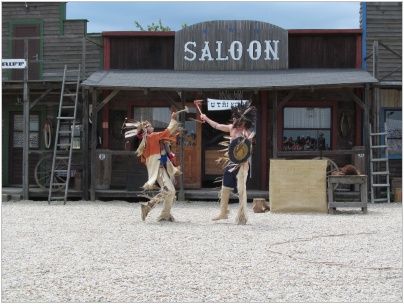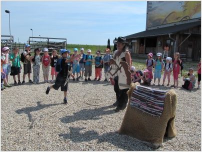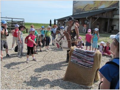 Na rodeo aréně jsme shlédli ukázku westernového a indiánského ježdění, drezuru koní a show na koni s ukázkami střeleckého umění místního indiána. V amfiteátru jsme si vychutnali scénku - přestřelku na Divokém západě s bandity. Děti se zapojily do hry "Lov bizona" a zůčastnily se také soutěže v hodu podkovou.
