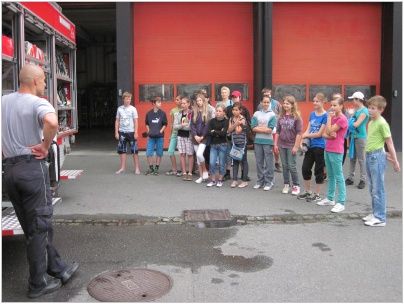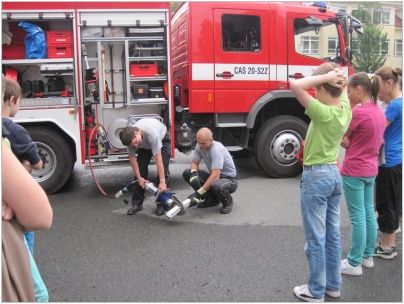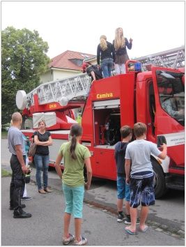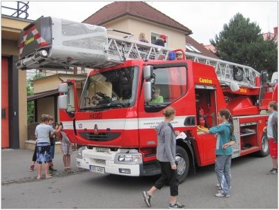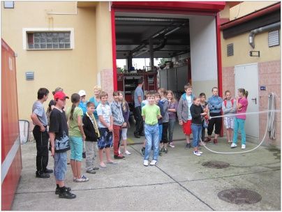 Prohlídkou nás prováděli hasiči Martin a Rosťa. Nejdříve jsme si prohlíželi hasičské nářadí a pak určovali jejich názvy. Dokonce jsme vylezli na střechu hasičského auta, ze kterého šla krásně vidět další technika – auto s 30 m dlouhým vysunovacím žebříkem. Všichni si postupně prohlédli interiér obou vozidel. Poté následovala projížďka kolem místního gymnázia. Po zaparkování vozidel jsme se odebrali na dvůr, kde jsme si mohli vyzkoušet vodní střelbu na cíl pomocí proudnice. Exkurzi jsme zakončili dotazy na jejich práci. Plní zážitků a adrenalinu jsme se odebrali zpět do školy. Prohlídka byla velice zajímavá a zábavná, všichni jsme si ji náramně užili.
