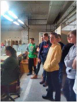 Paní průvodkyně nás seznámila s historií firmy a provedla provozem: foukárnou, kde žáci mohli vidět zrod baněk přímo pod rukama zkušených „foukačů a foukaček“. Mohli si také sami vyzkoušet baňku vyfouknout a přitom zjistit, že to zdaleka není tak lehká věc: nedofoukneš -špatně, přefoukneš - taky špatně?. „Holt, chce to trpělivost a zkušenost, žádná sranda “, jak zmínili někteří odvážlivci. Dále jsme se podívali do stříbřírny baněk a barvírny, kde žáci mohli vidět v provozu, jak se barva na baňce zapéká a následně suší. Poté přišla třešinka na dortu – malírna. Bylo nádherné sledovat, jaké ornamenty jsou schopné zkušené malířky vyčarovat. Opravdu pastva pro oči.:-)