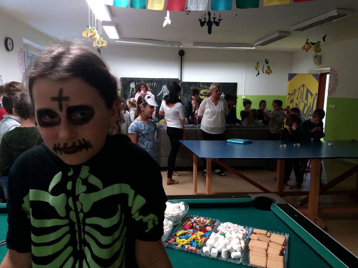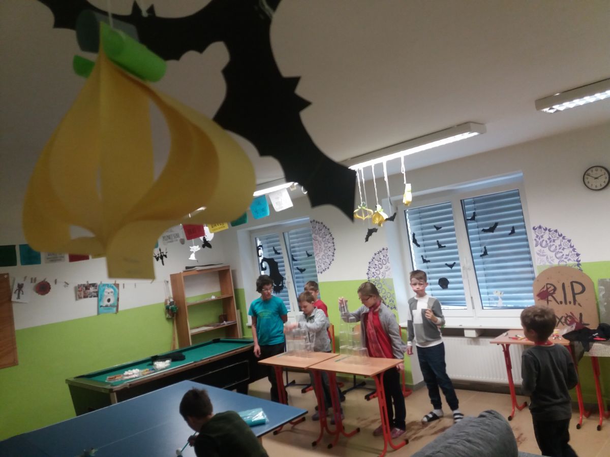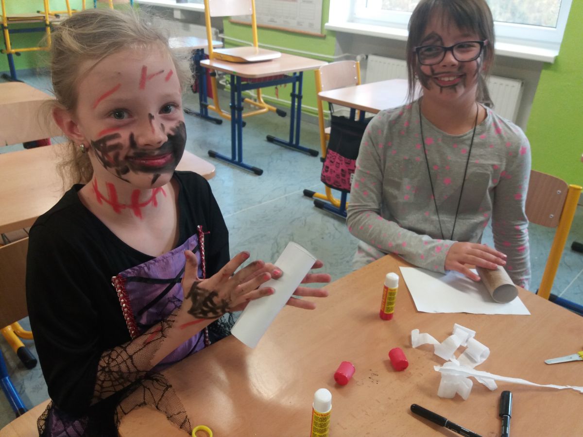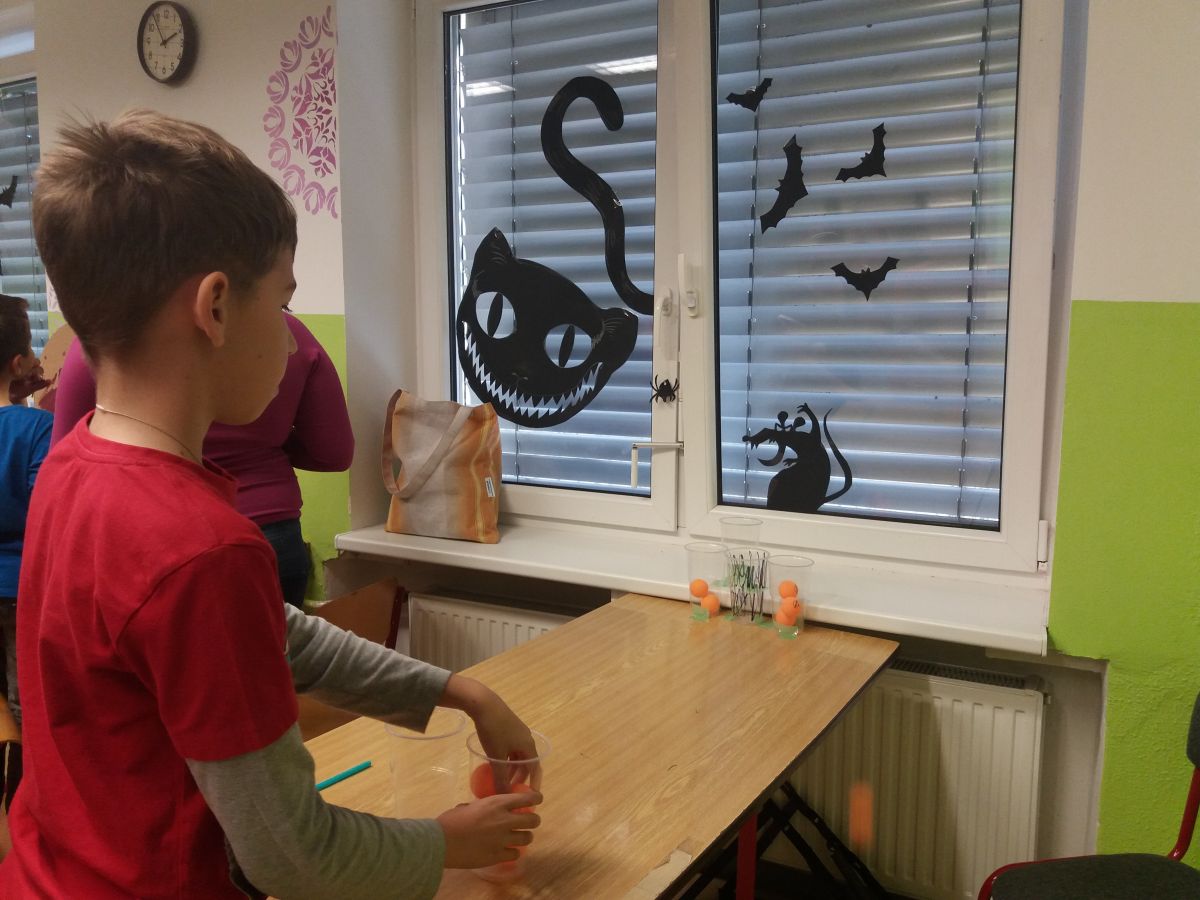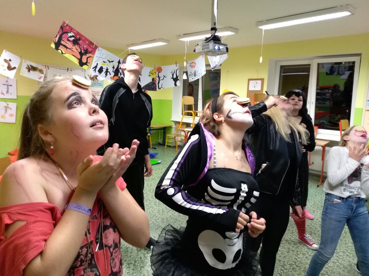 V pondělí soutěžily o sladkosti děti ze školní družiny a z klubu. Každý si mohl vyzkoušet připravené disciplíny, nebo si vyrobit papírovou halloweenskou ozdobu. Nechyběla ani strašidelná muzika a tancování.