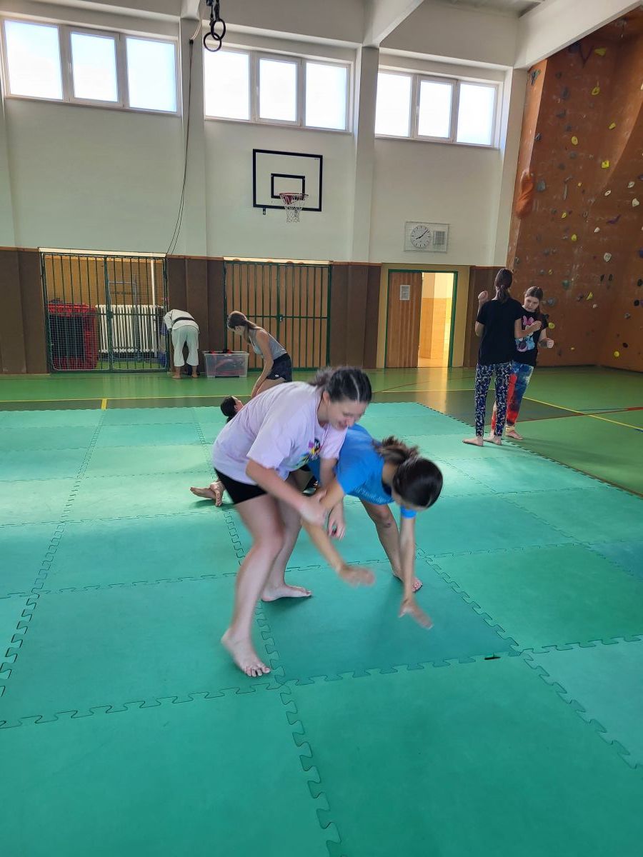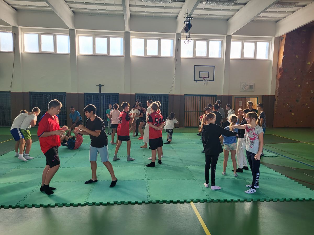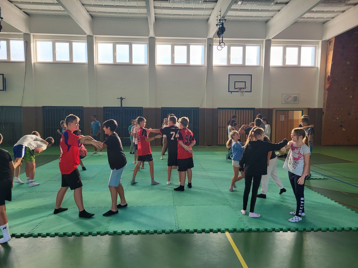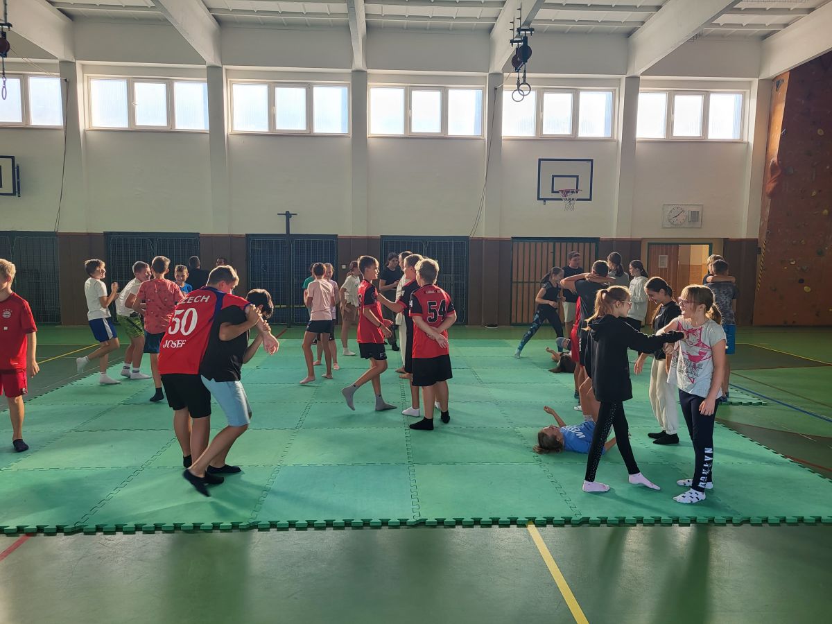 Na druhém stupni máme v hodinách tělesné výchovy skvělé zpestření! Pravidelně nás navštěvují zkušení trenéři Radek Kleibl a Jan Tichý, kteří holky a kluky zasvěcují do prvků sebeobrany a ju-jitsu. Cvičení je zábavné, ale především může v případě potřeby posloužit každému, kdo se ocitne v nesnázích. Mgr. Zuzana Šerá
