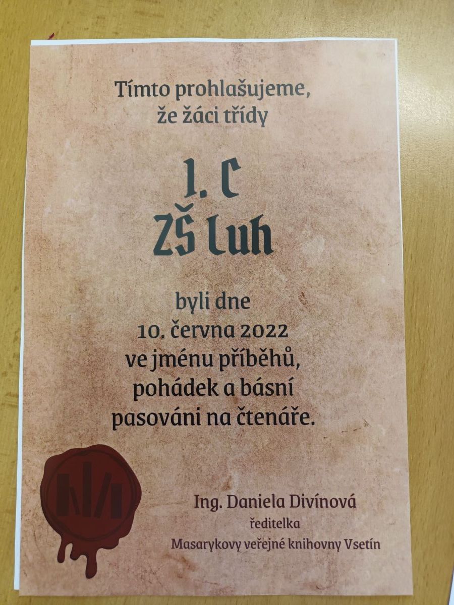 Dnes byla třída 1.C v knihovně v Luhu na slavnostním pasování prvňáků na čtenáře. Děti byly spokojené a dokonce dostaly dárek knížku Dubánek a tajný vzkaz, který si již umí přečíst. Gratulujeme!