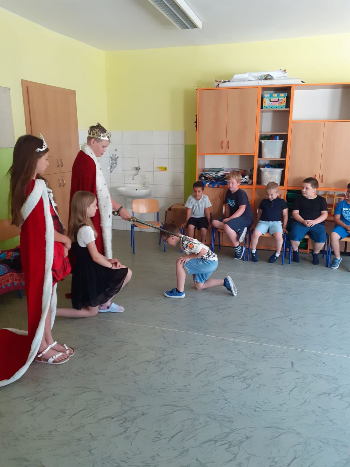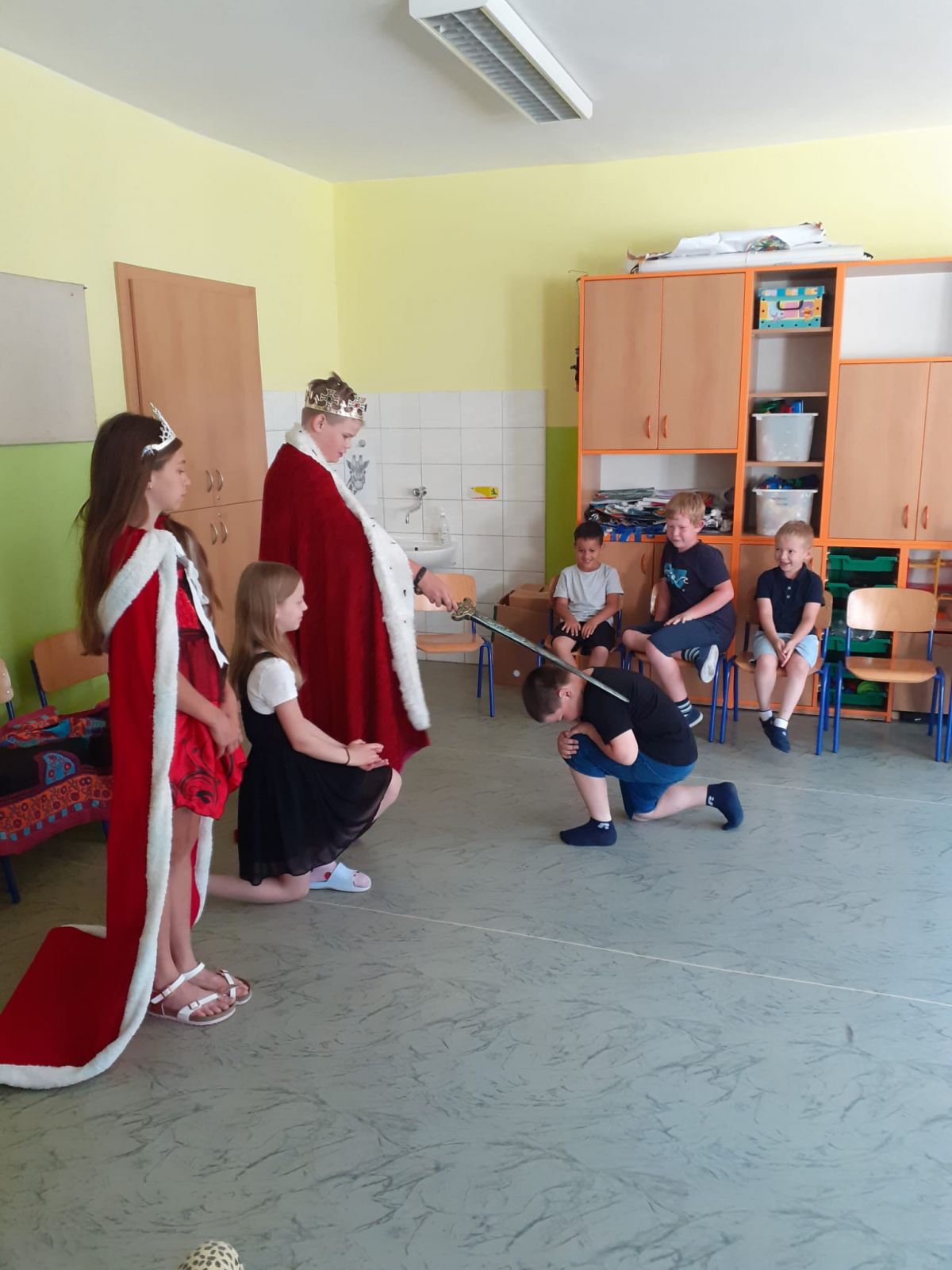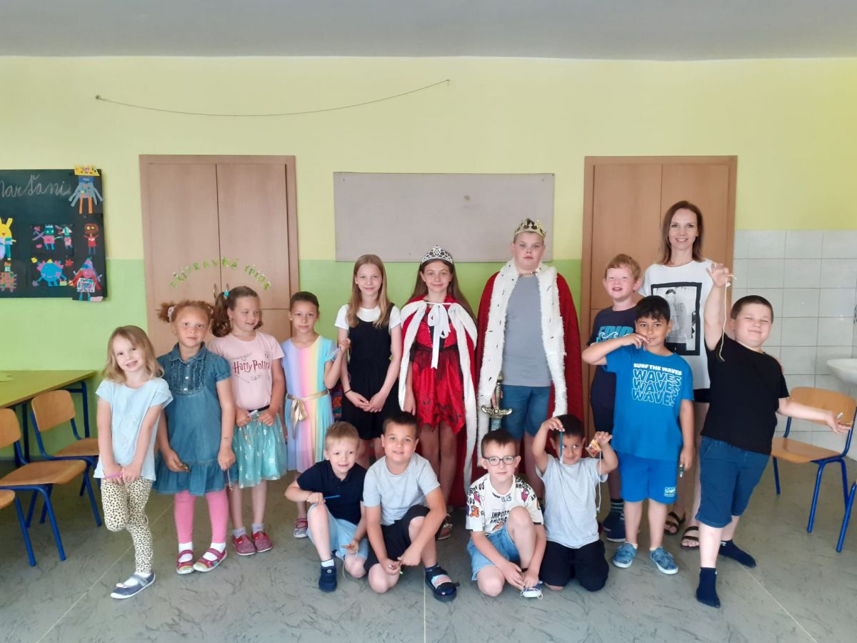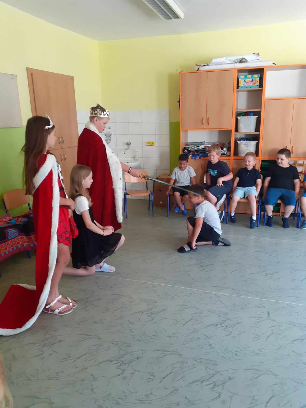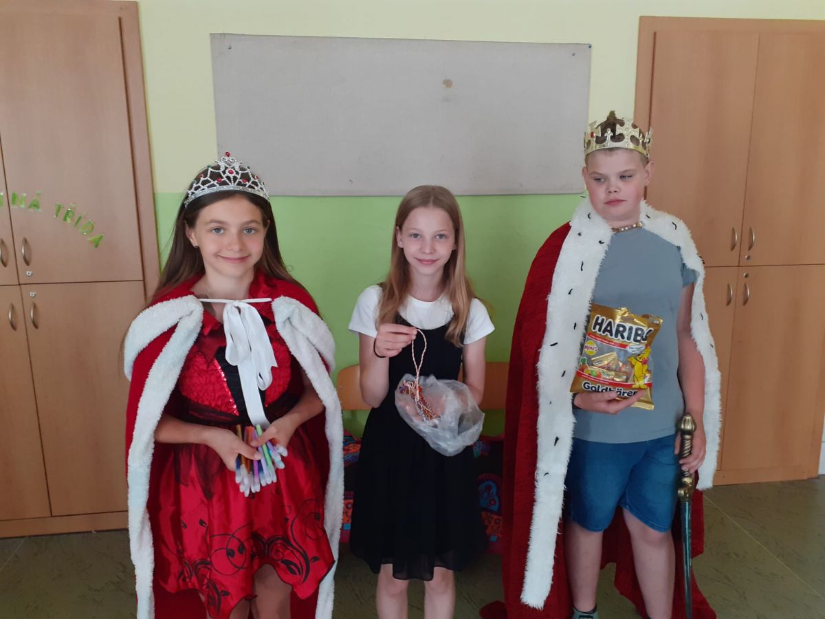 V pondělí 26. 6. byl velký den! Měli jsme u nás ve třídě vzácnou návštěvu. Přišli starší spolužáci – šesťáci v převleku za krále a královnu. Připravili jsme si pro ně program na celou vyučovací hodinu. To aby viděli, jak dlouho se dokážeme plně soustředit. Moudře pozorovali a pokyvovali, co všechno jsme se v tomto školním roce naučili. Nakonec… Nás holky pasovala královna a nás kluky pasoval král na školáky. Byl to rituál. Slavnost. Bylo to dojemné. Děkujeme. Jana Olšáková, třídní učitelka přípravné třídy