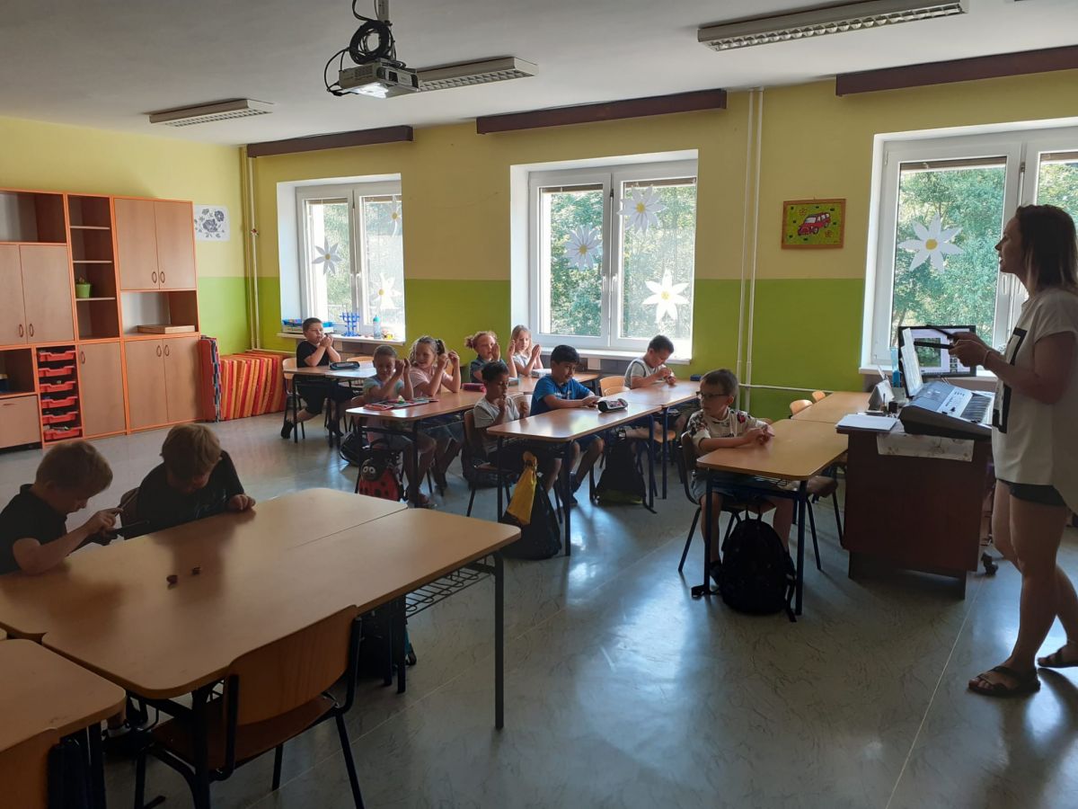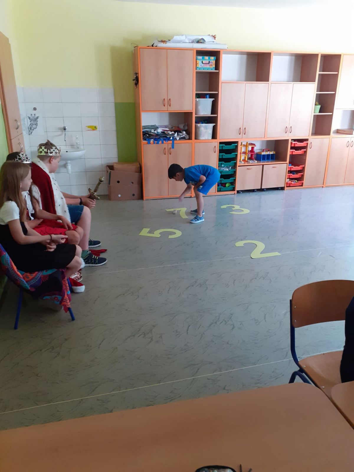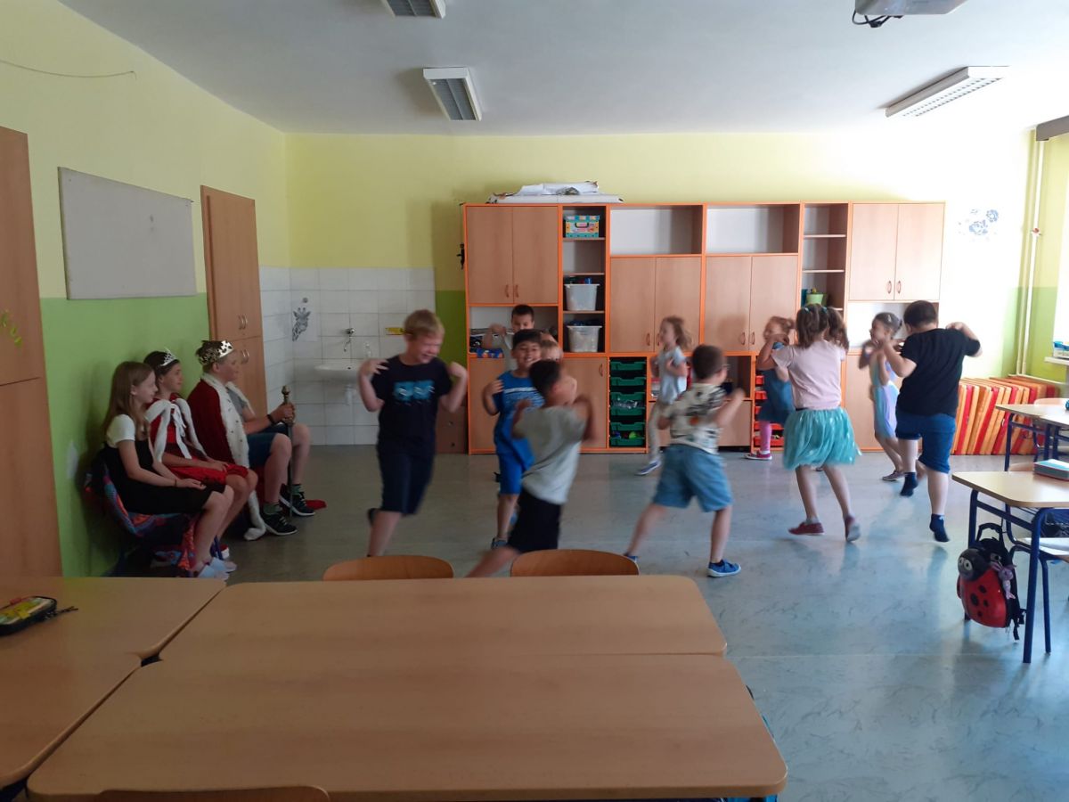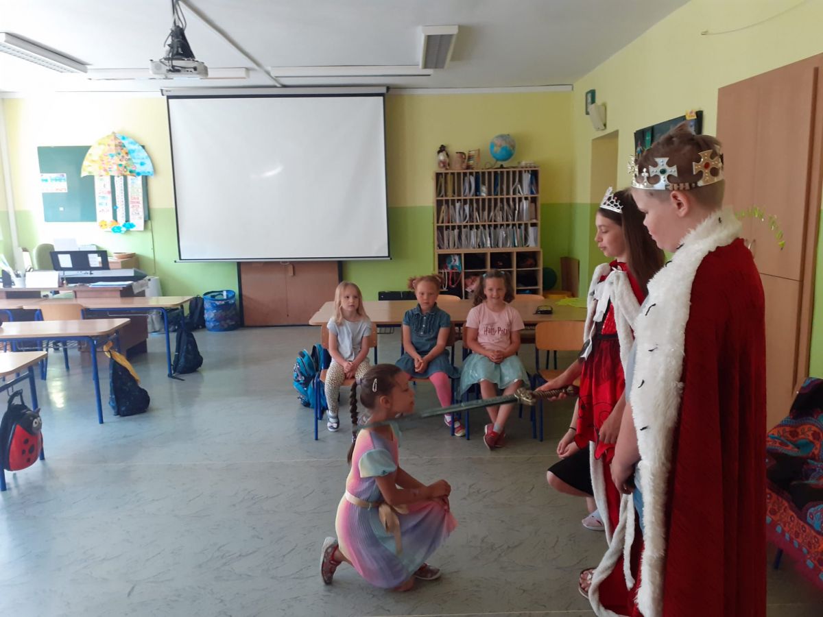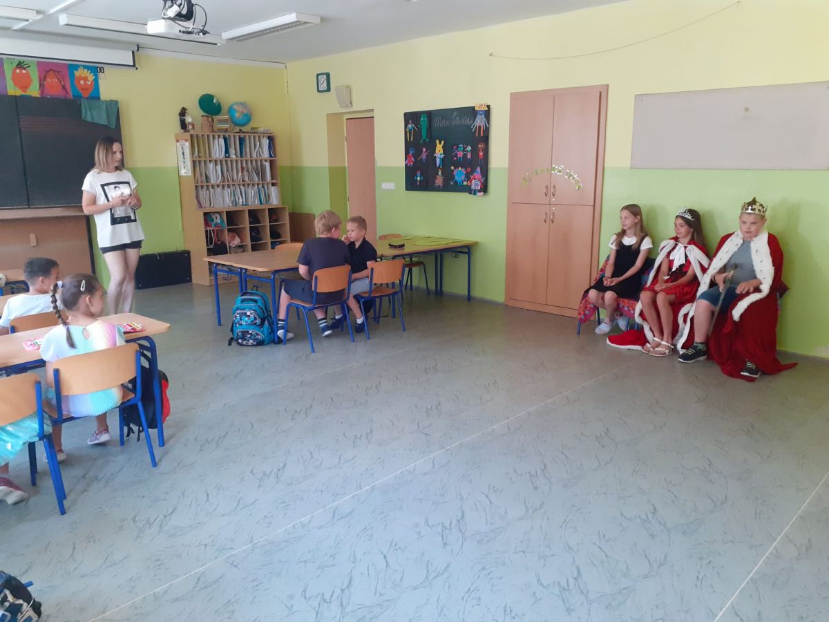 V pondělí 26. 6. byl velký den! Měli jsme u nás ve třídě vzácnou návštěvu. Přišli starší spolužáci – šesťáci v převleku za krále a královnu. Připravili jsme si pro ně program na celou vyučovací hodinu. To aby viděli, jak dlouho se dokážeme plně soustředit. Moudře pozorovali a pokyvovali, co všechno jsme se v tomto školním roce naučili. Nakonec… Nás holky pasovala královna a nás kluky pasoval král na školáky. Byl to rituál. Slavnost. Bylo to dojemné. Děkujeme. Jana Olšáková, třídní učitelka přípravné třídy