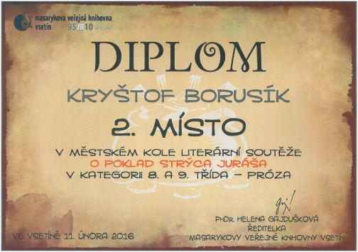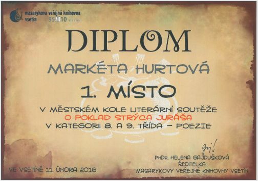Konkurence letos, jakož i v jiných ročnících, byla značná, a proto naši školu velmi potěšilo, když Kryštof Borusík z 9.A získal 2. místo v kategorii 8.a 9. tříd za prózu a Markéta Hurtová z 9.B dokonce 1. místo za poezii v téže kategorii.