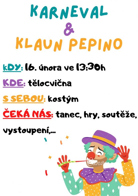 Karneval 2024 je tady! Převleč se do kostýmu a přijď s námi tančit a soutěžit! Těšit se můžeš na skvělé vystoupení Klauna Pepina.