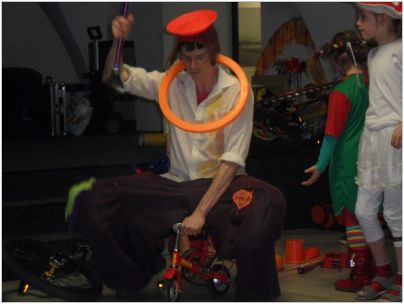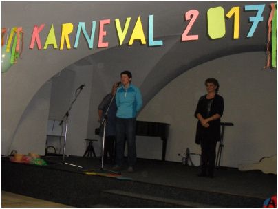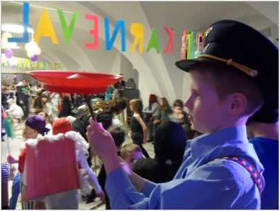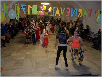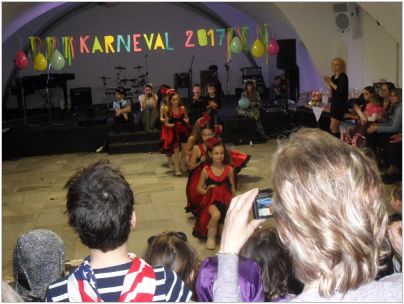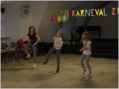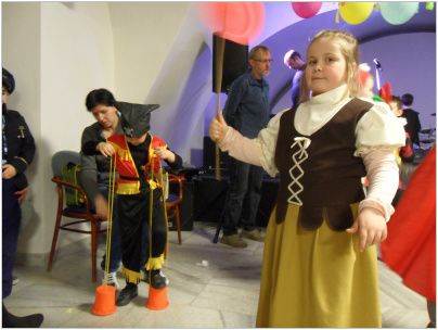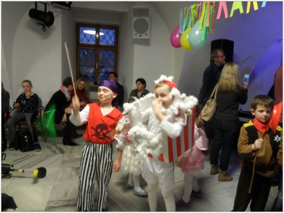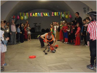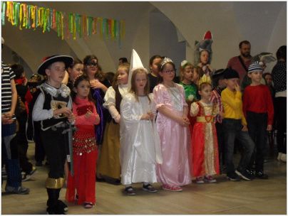 Karneval se odehrával v cirkusovém duchu s bavičem žonglérem a jeho žonglérskými dílnami. Maškarní „šou“ vyplňovaly zábavné soutěže a tancování. V předsálí nechyběl fotokoutek, skládanky a malování. Program vyplnily také taneční kroužky country a aerobiku naší školy, bohatá dětská tombola a také velmi lákavá prohlídka zámecké věže. Celý večer se o pestré občerstvení postaral tým rodičů. Tečkou maškarního reje a zároveň překvapení večera bylo hudební vystoupení dětské kapely Docela.