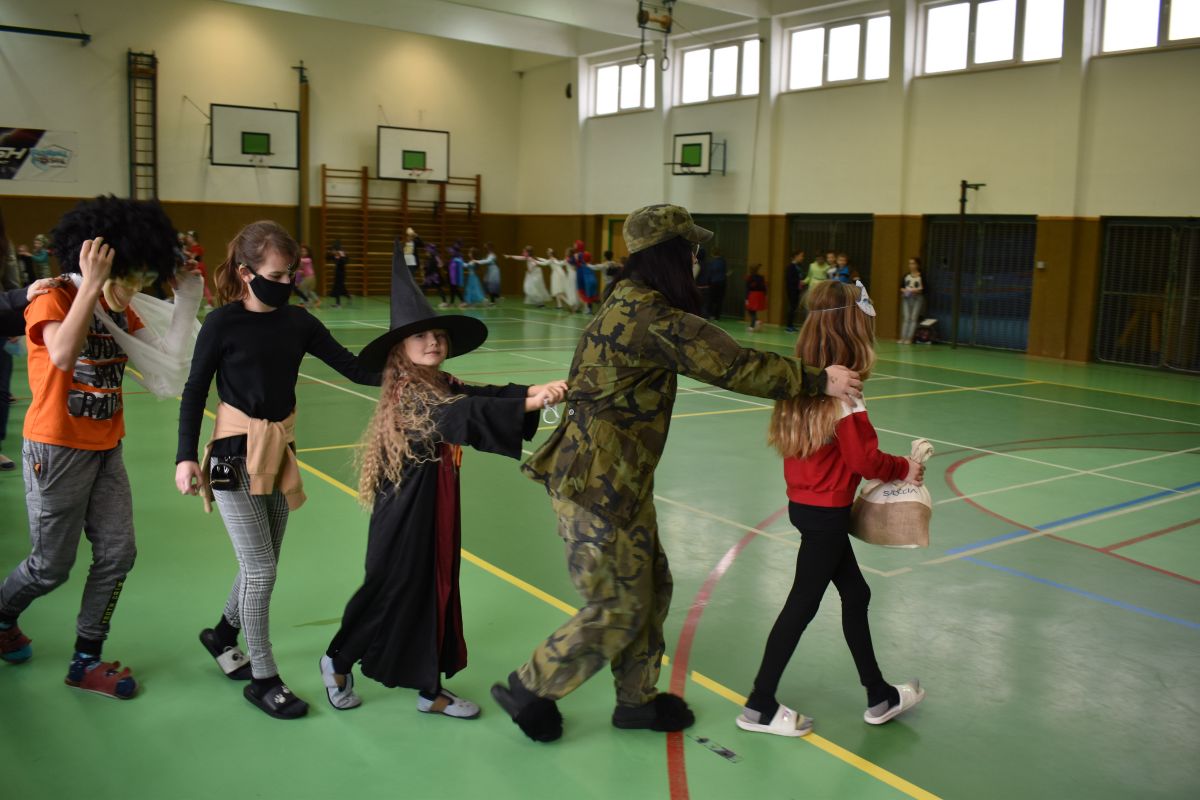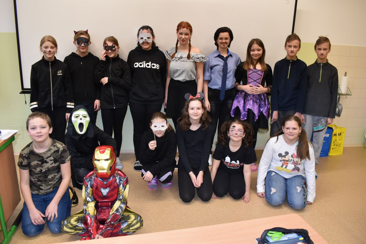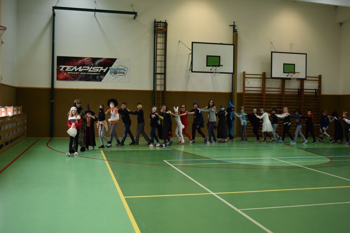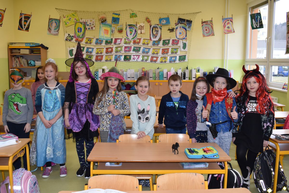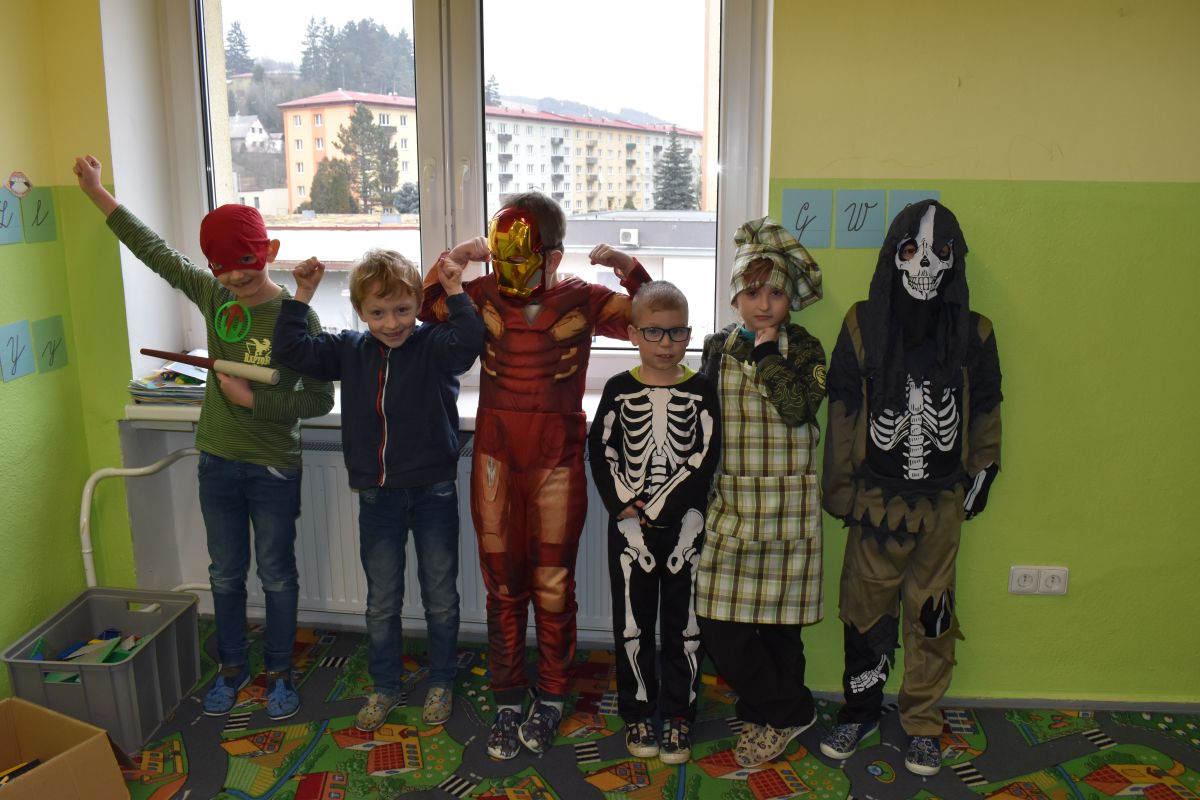 Ráno se ustrojili žáci spolu s učiteli do bytostí z pohádek, masek dětských příběhů a také obleků různých povolání, aby si užili netradiční vyučování.