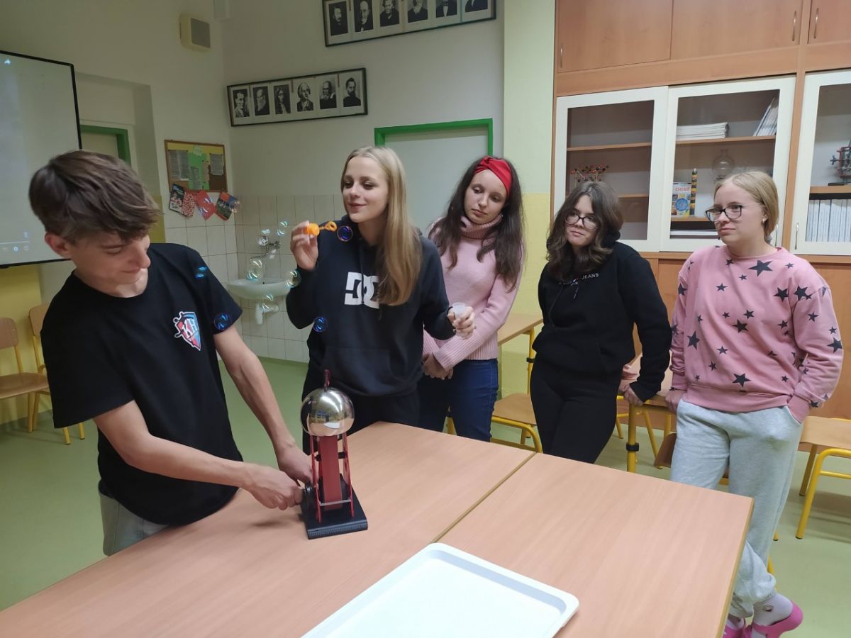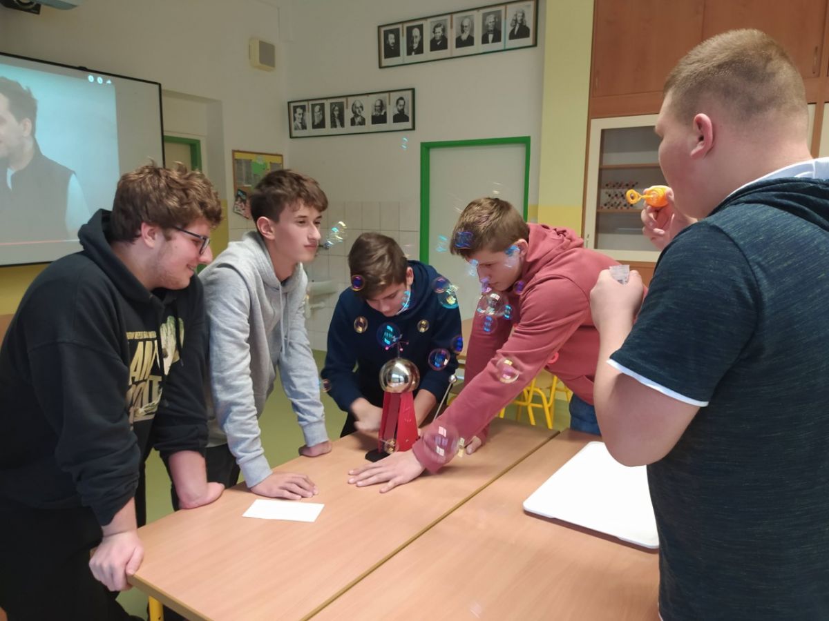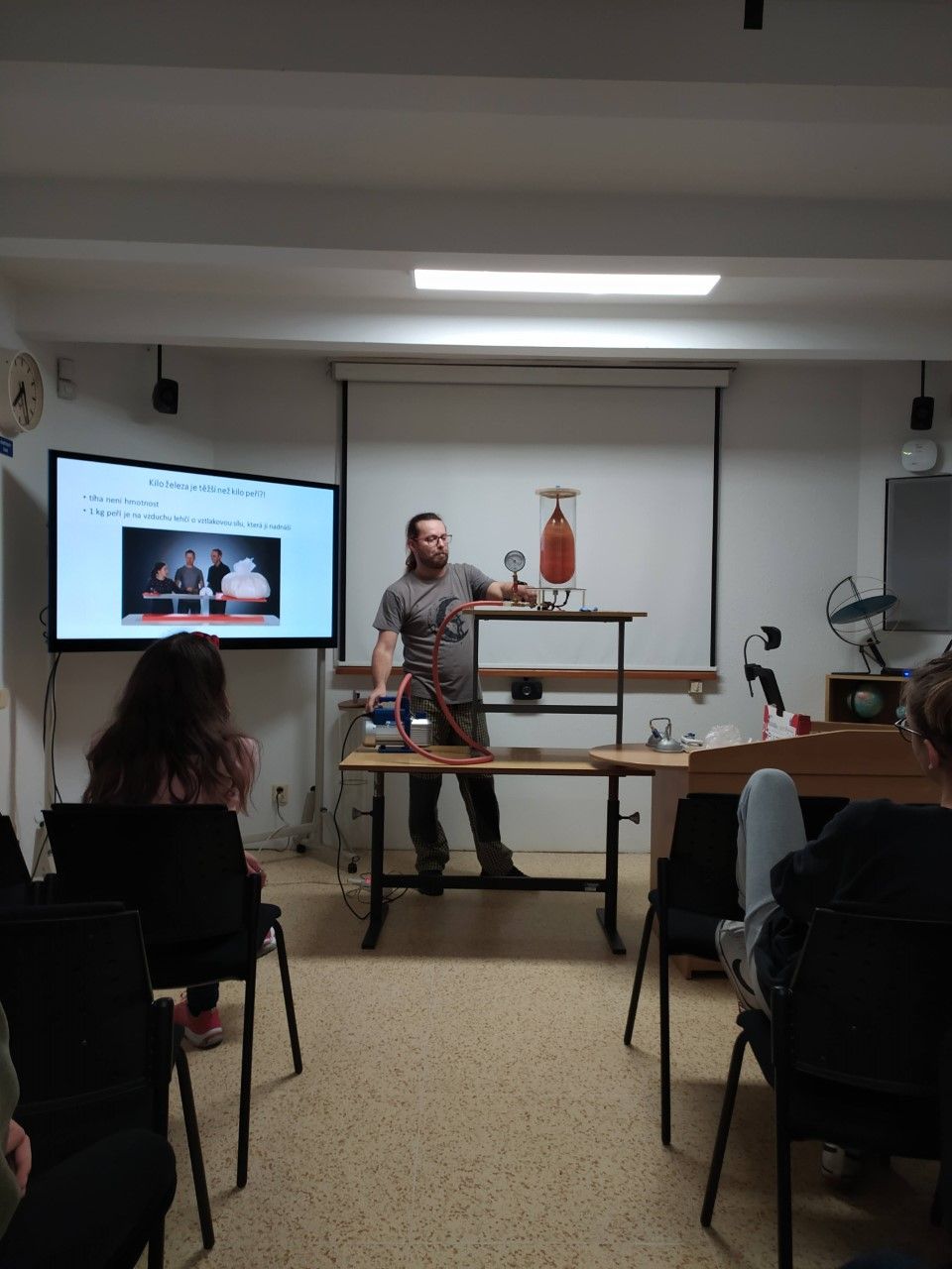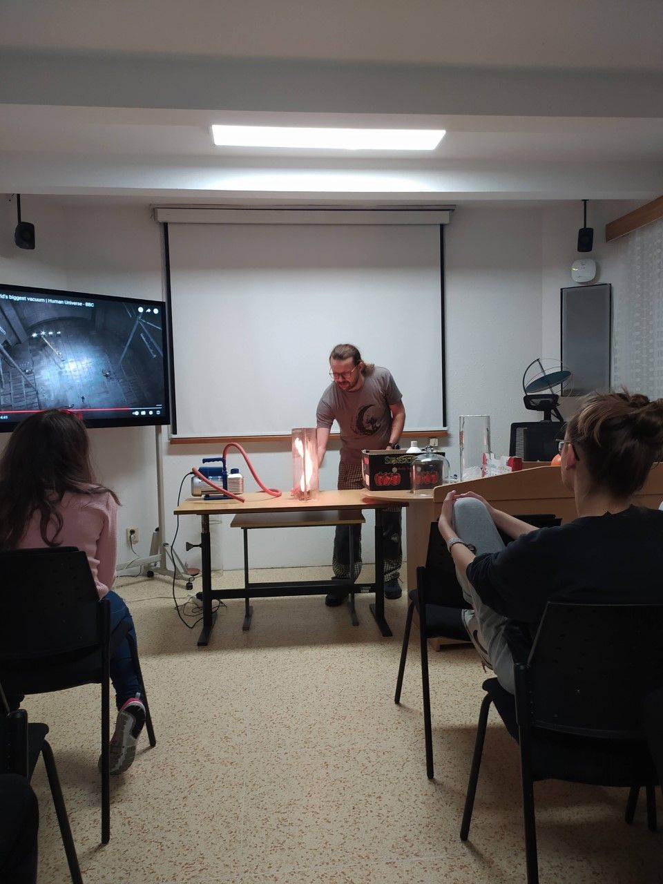 Večer se deváťáci se vydali na hvězdárnu, kde se seznámili s dalekohledem, který poskytuje až 500násobné zvětšení, a podívali na pokusy, tentokrát s vakuem.