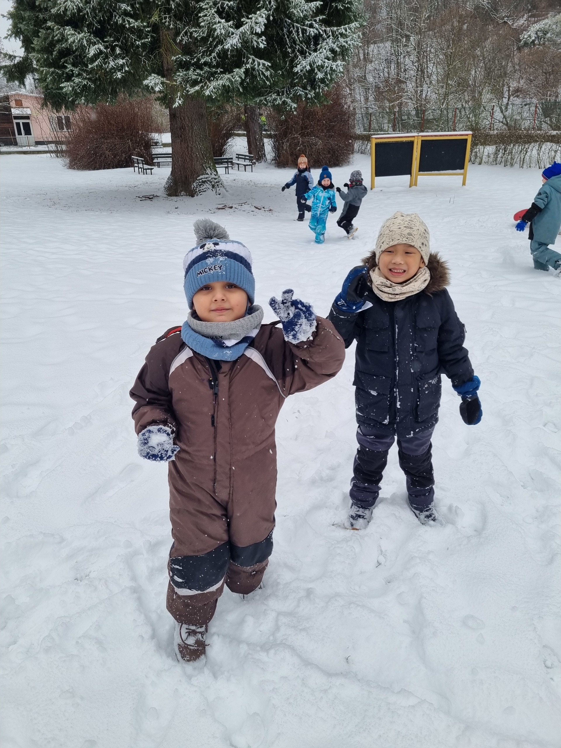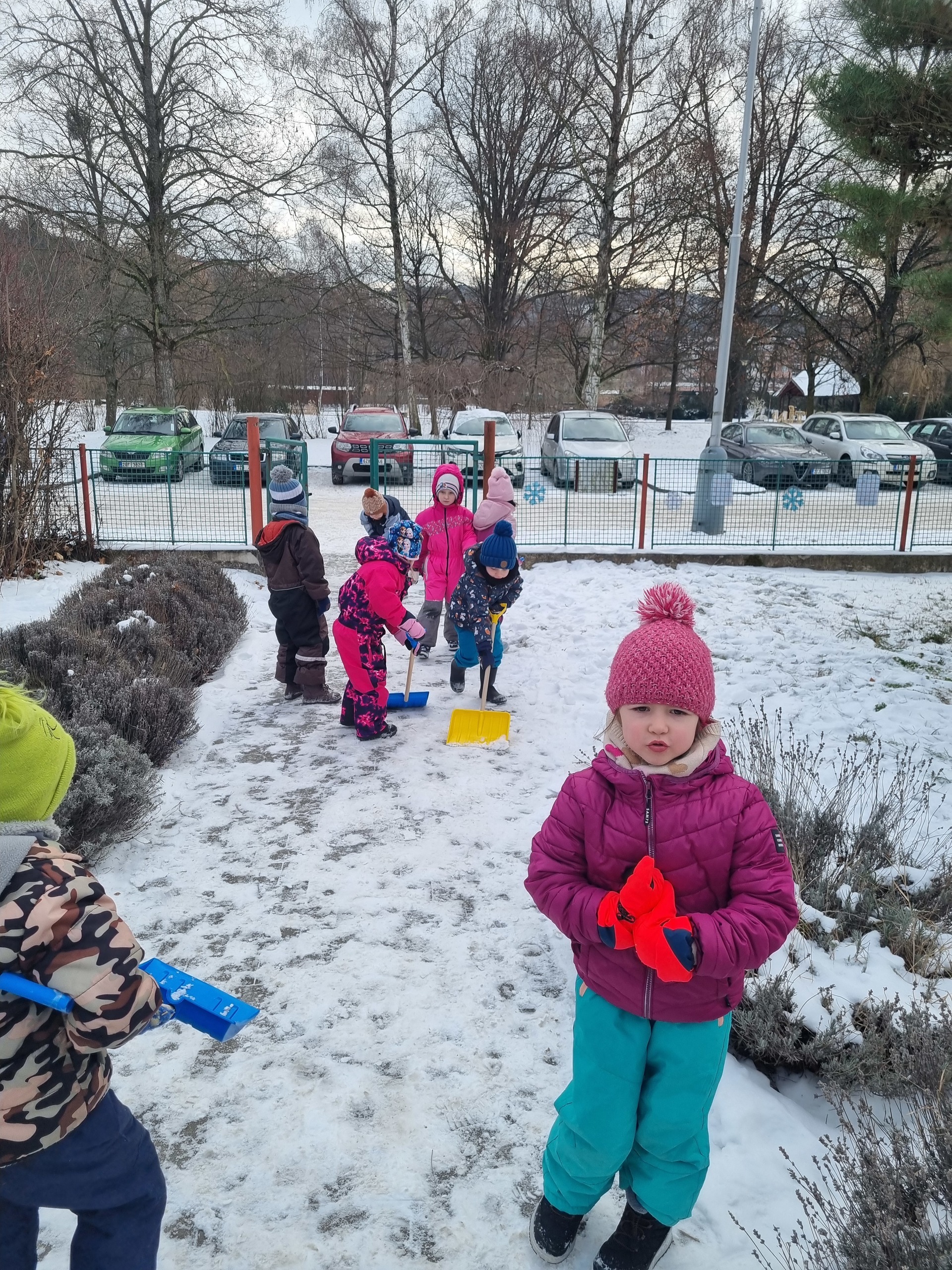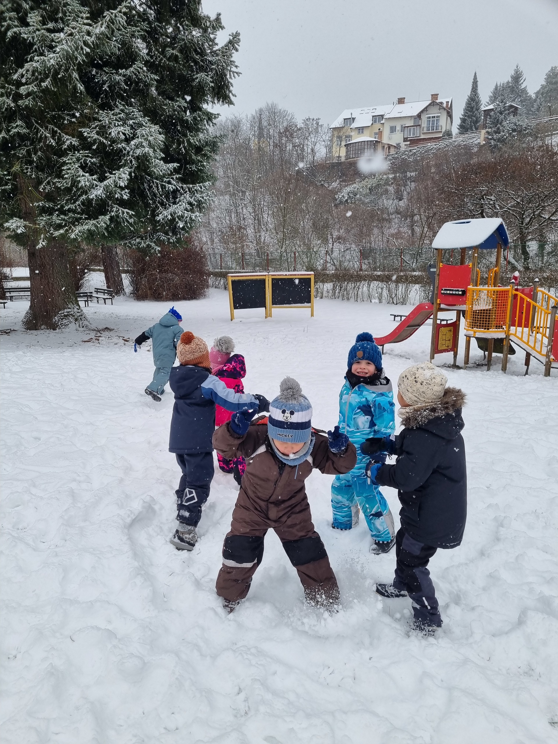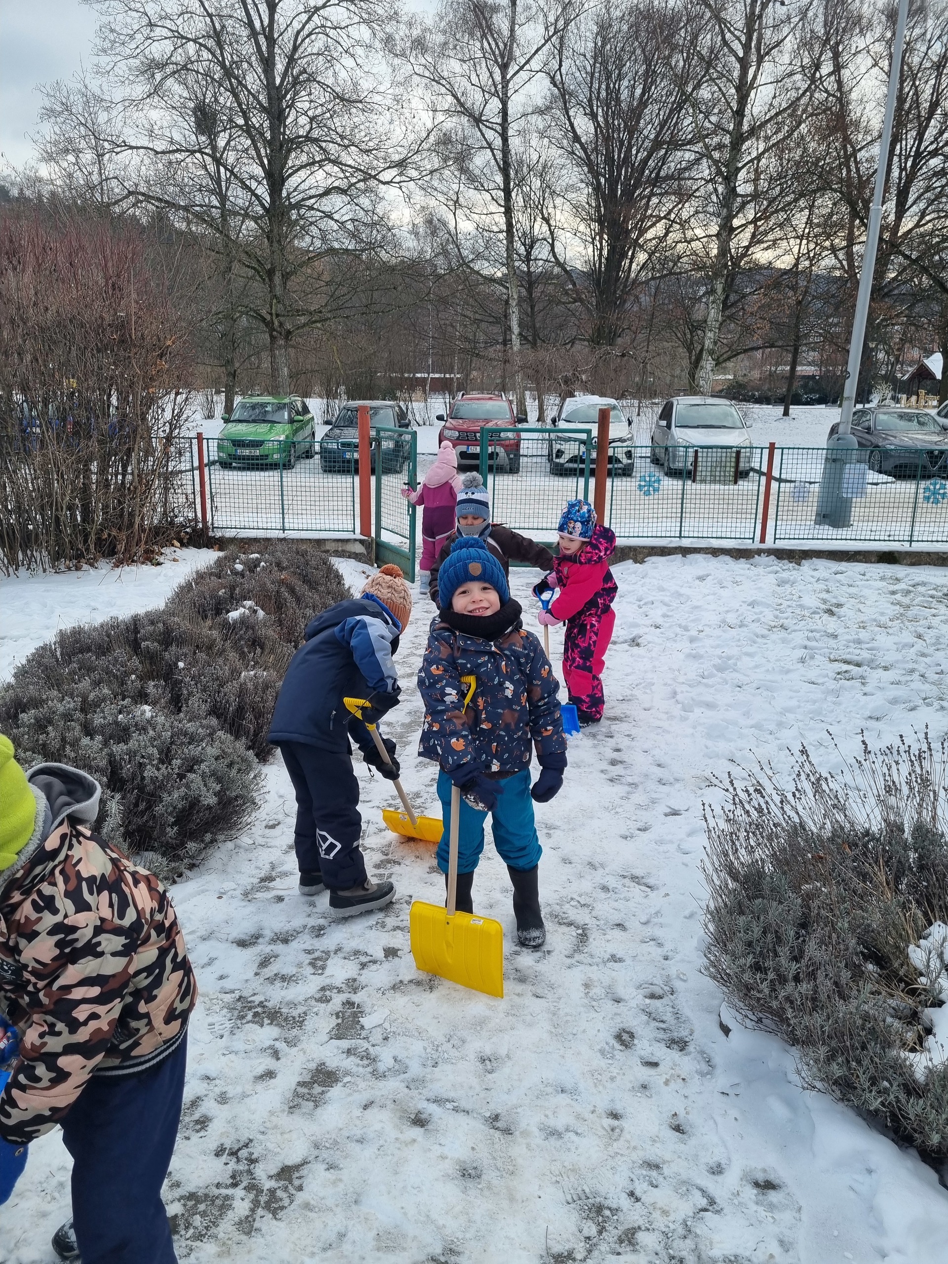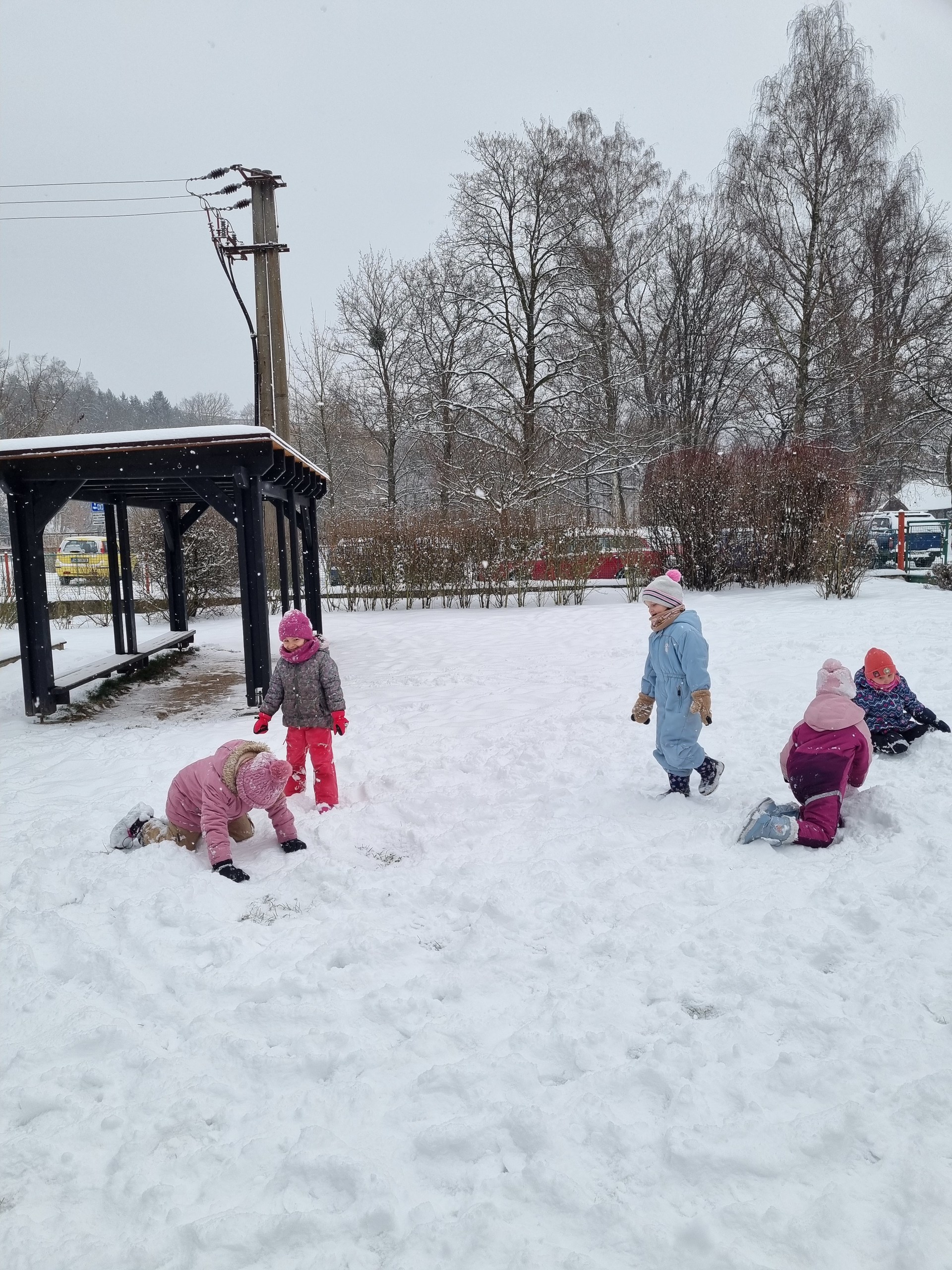 Teple se obléct, nasadit čepici, rukavice, a jde se na to! K maximálnímu využití sněhové pokrývky nám posloužila školní zahrada a příroda v okolí. Děti s radostí koulely sněhuláky, dělaly andělíčky, tvořily cestičky, vyzkoušely si malování barvičkami do sněhu a některé se dokonce chopily lopaty a zapojily své svaly během odklízení sněhu z chodníku. :-) Samozřejmě nechyběla ani jízda na lopatách, které si děti přinesly z domu a během níž jsme si užili spoustu legrace.