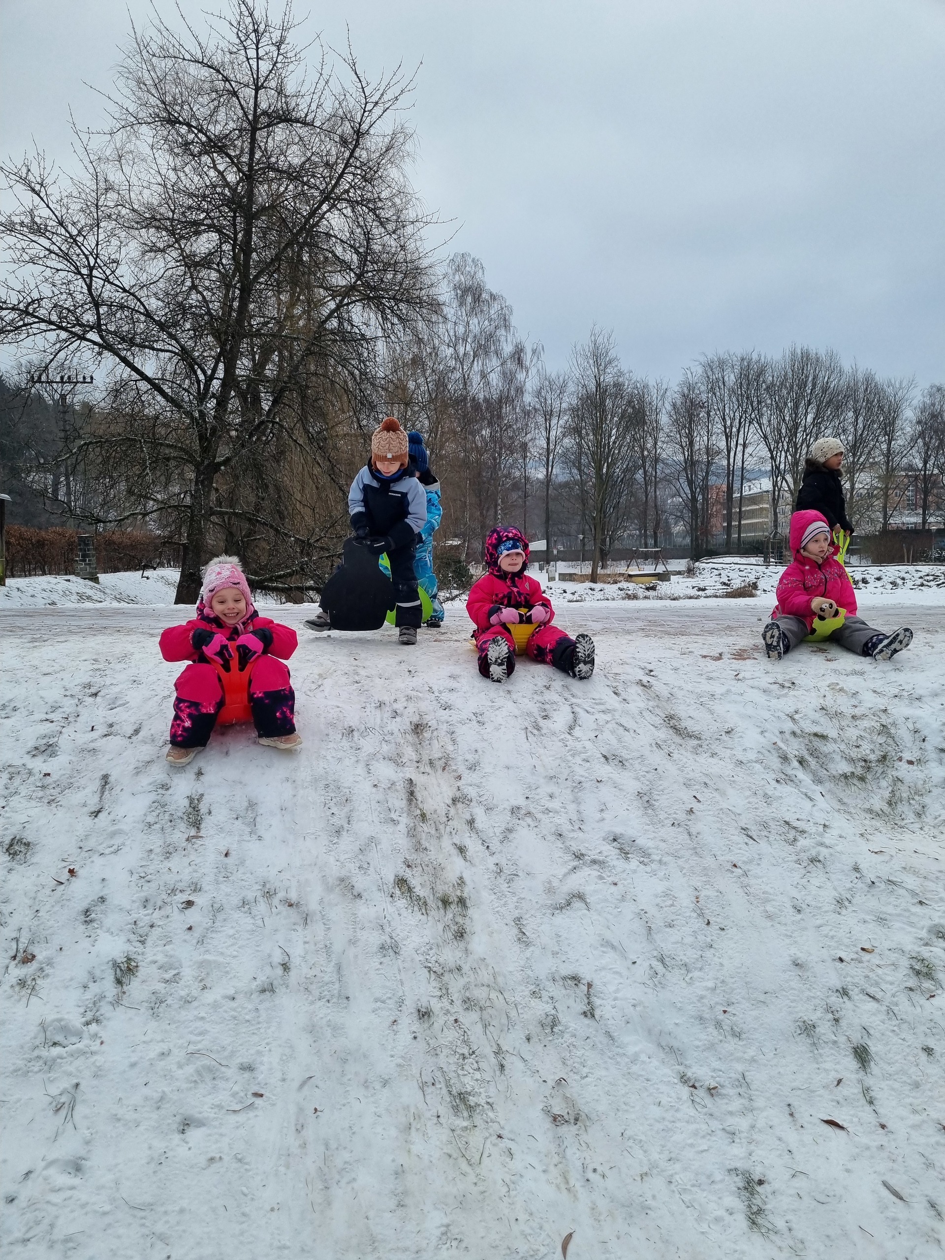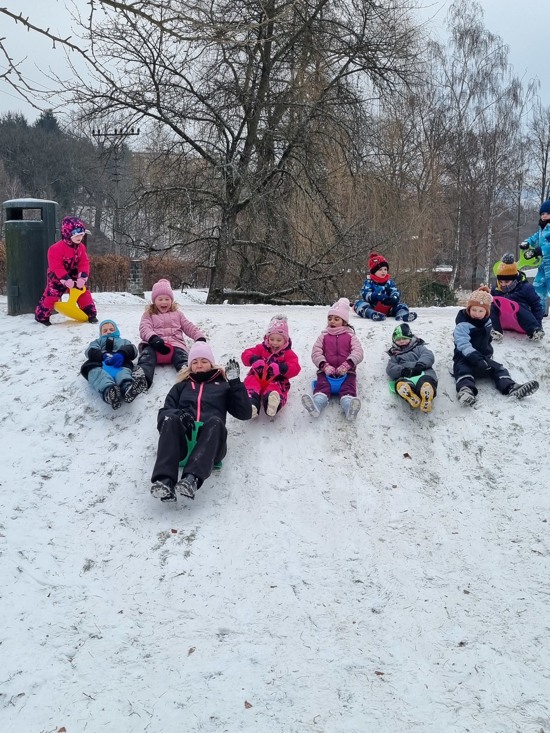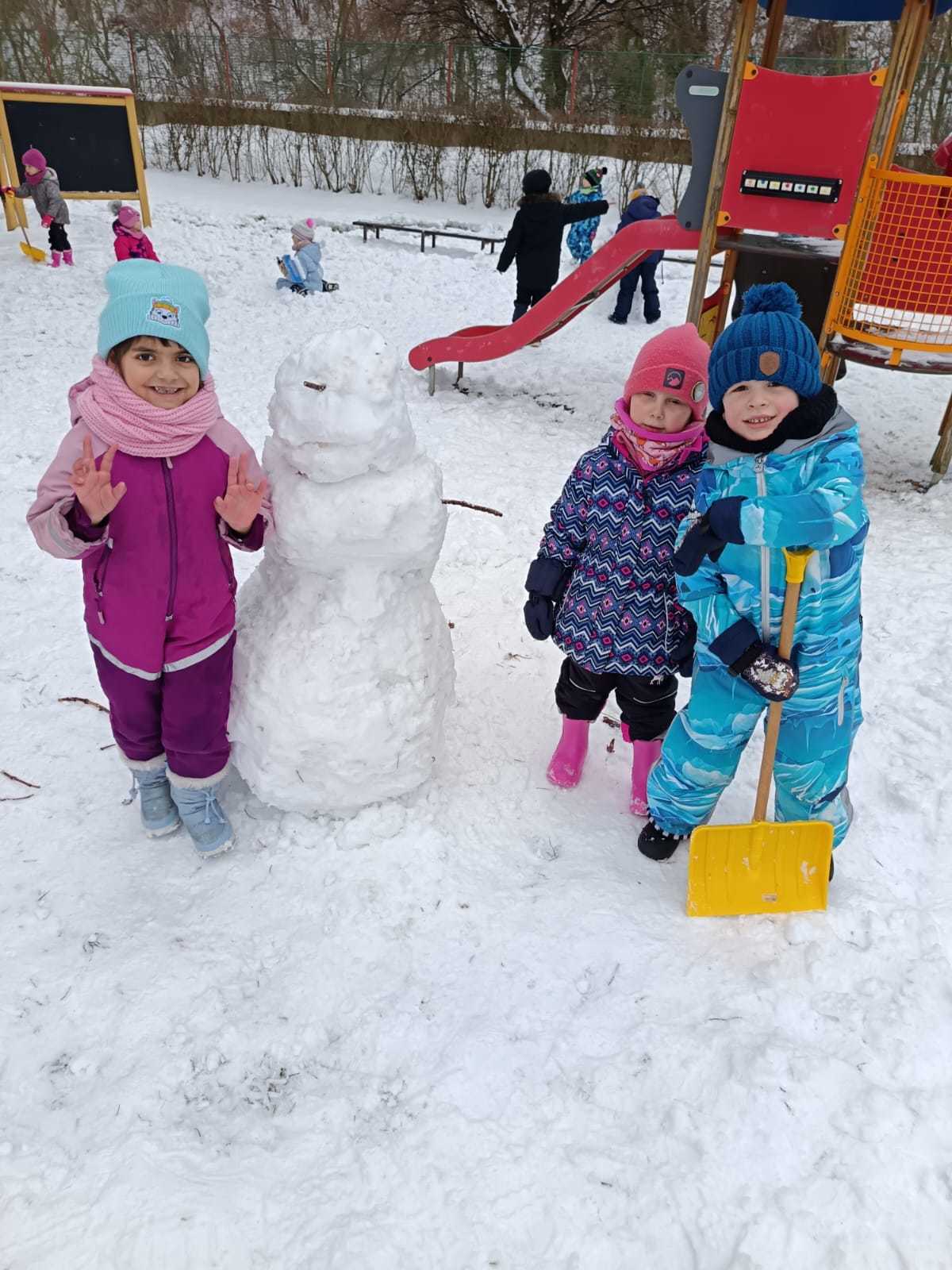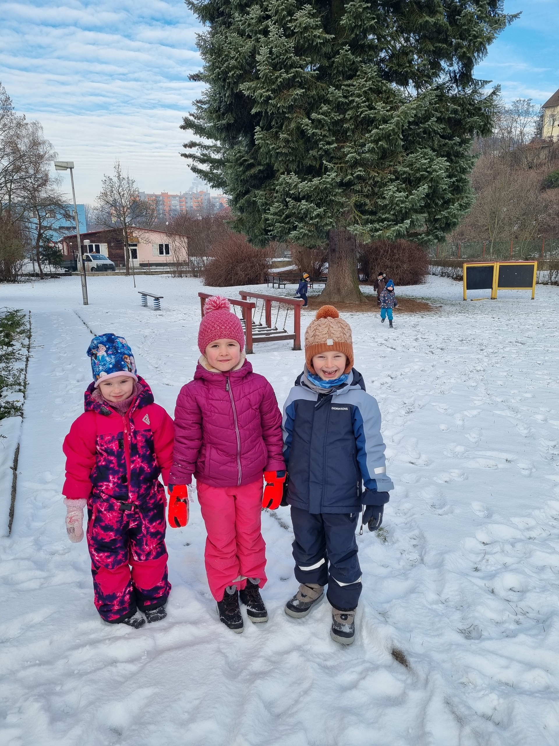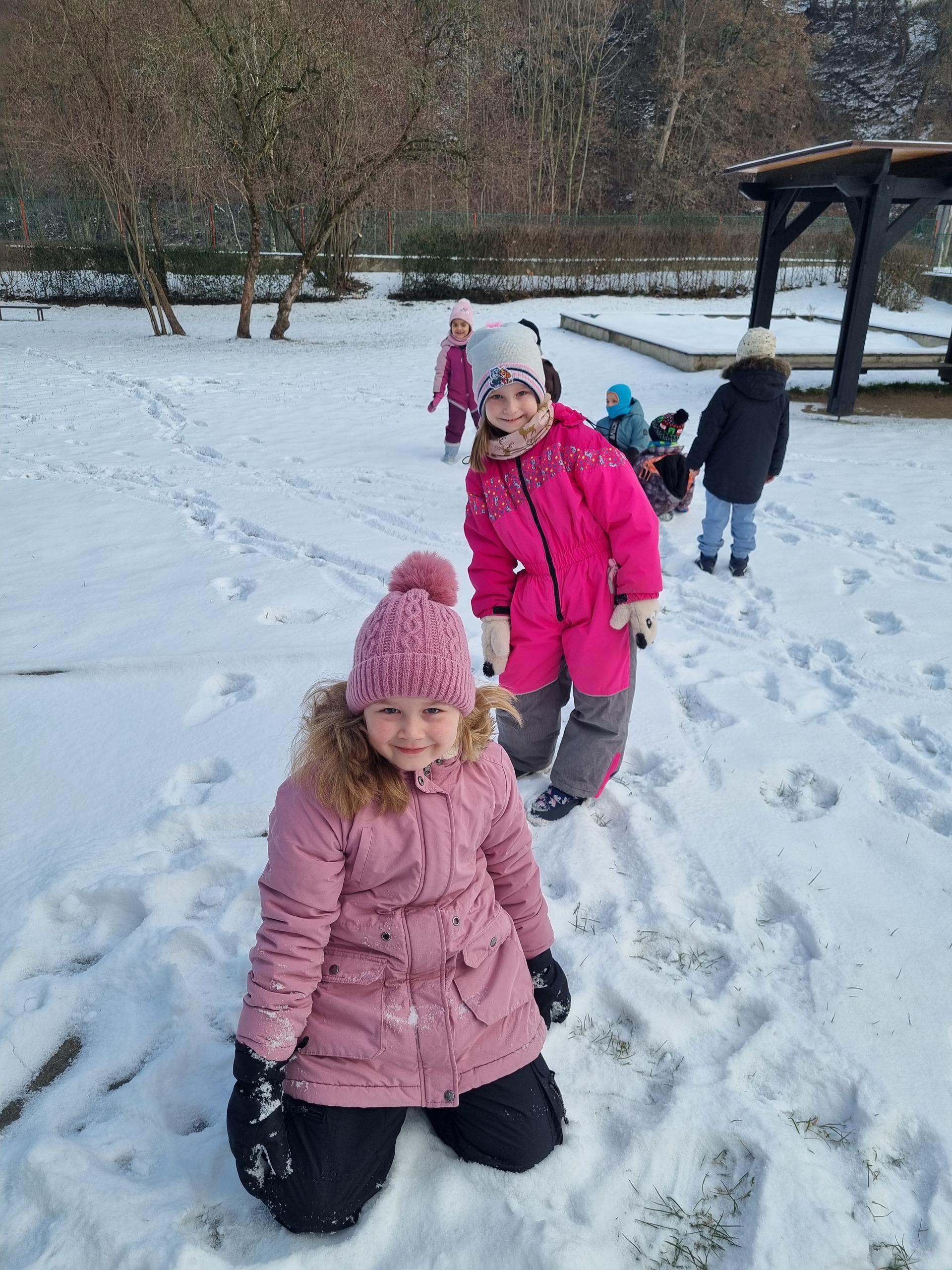 Teple se obléct, nasadit čepici, rukavice, a jde se na to! K maximálnímu využití sněhové pokrývky nám posloužila školní zahrada a příroda v okolí. Děti s radostí koulely sněhuláky, dělaly andělíčky, tvořily cestičky, vyzkoušely si malování barvičkami do sněhu a některé se dokonce chopily lopaty a zapojily své svaly během odklízení sněhu z chodníku. :-) Samozřejmě nechyběla ani jízda na lopatách, které si děti přinesly z domu a během níž jsme si užili spoustu legrace.