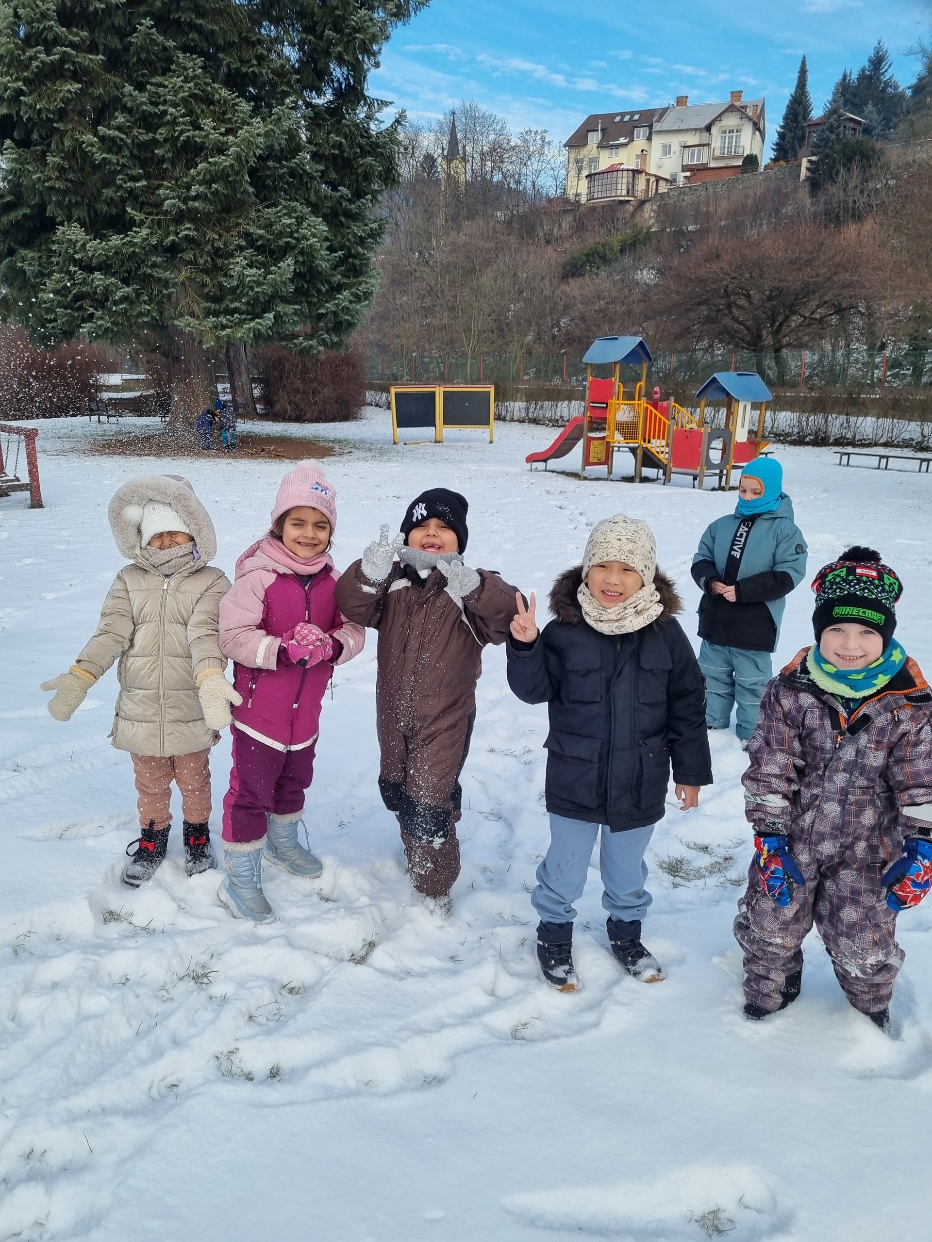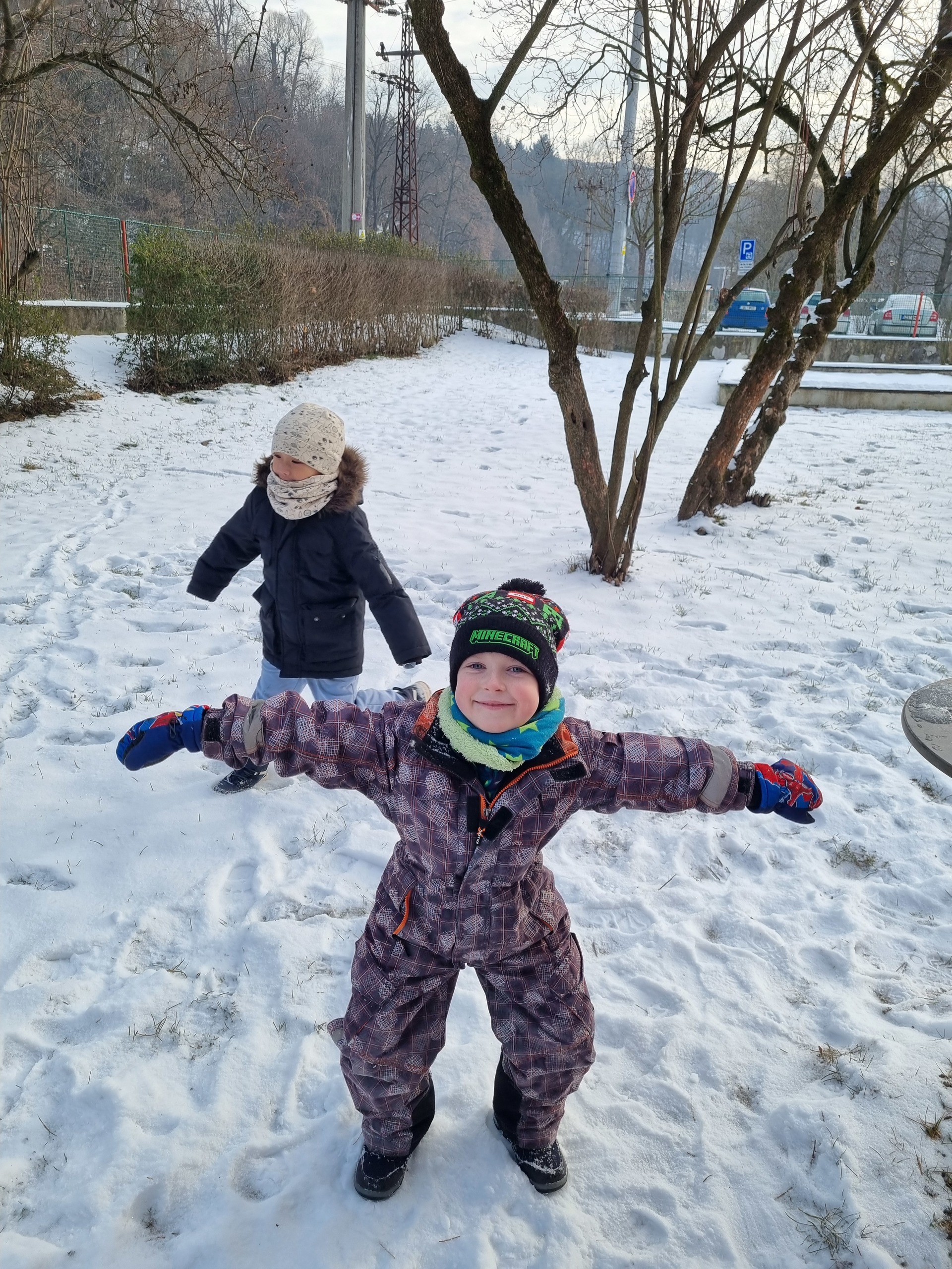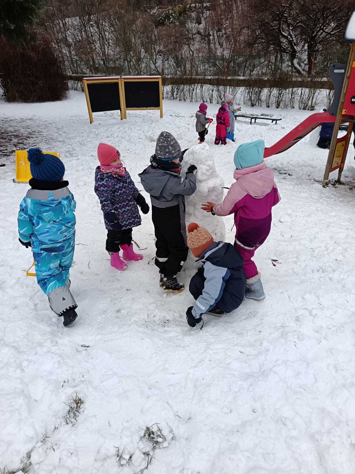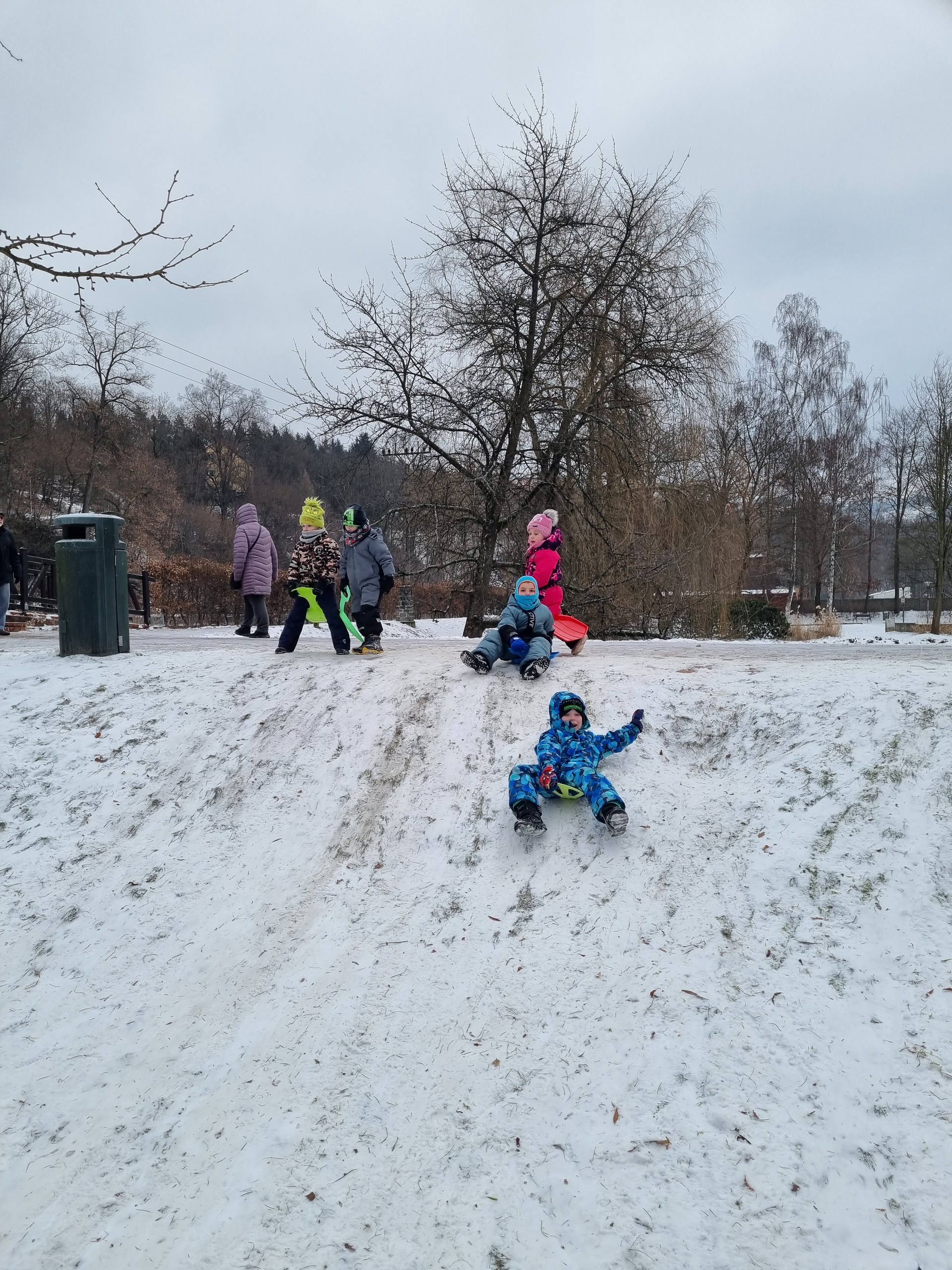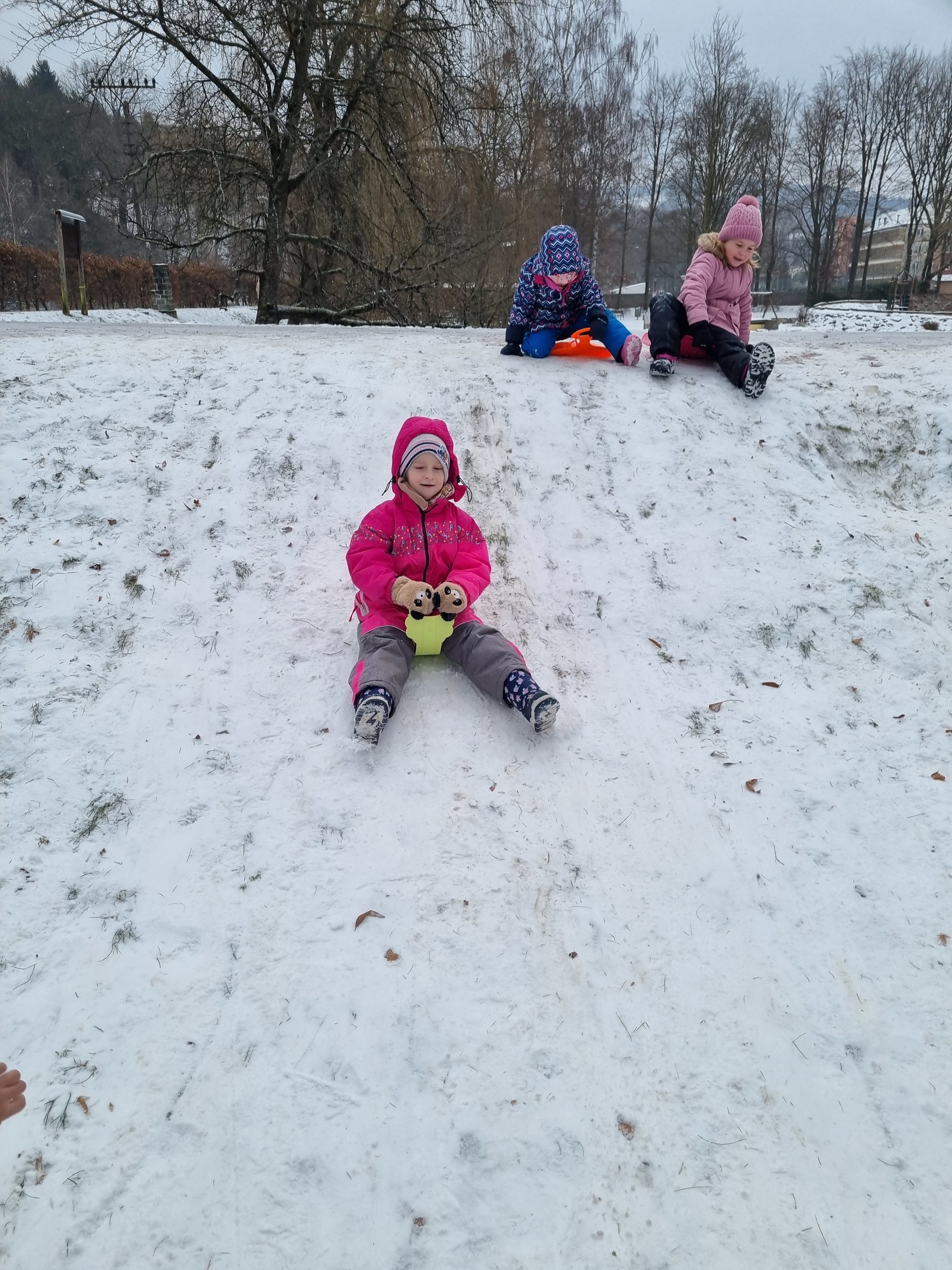 Teple se obléct, nasadit čepici, rukavice, a jde se na to! K maximálnímu využití sněhové pokrývky nám posloužila školní zahrada a příroda v okolí. Děti s radostí koulely sněhuláky, dělaly andělíčky, tvořily cestičky, vyzkoušely si malování barvičkami do sněhu a některé se dokonce chopily lopaty a zapojily své svaly během odklízení sněhu z chodníku. :-) Samozřejmě nechyběla ani jízda na lopatách, které si děti přinesly z domu a během níž jsme si užili spoustu legrace.
