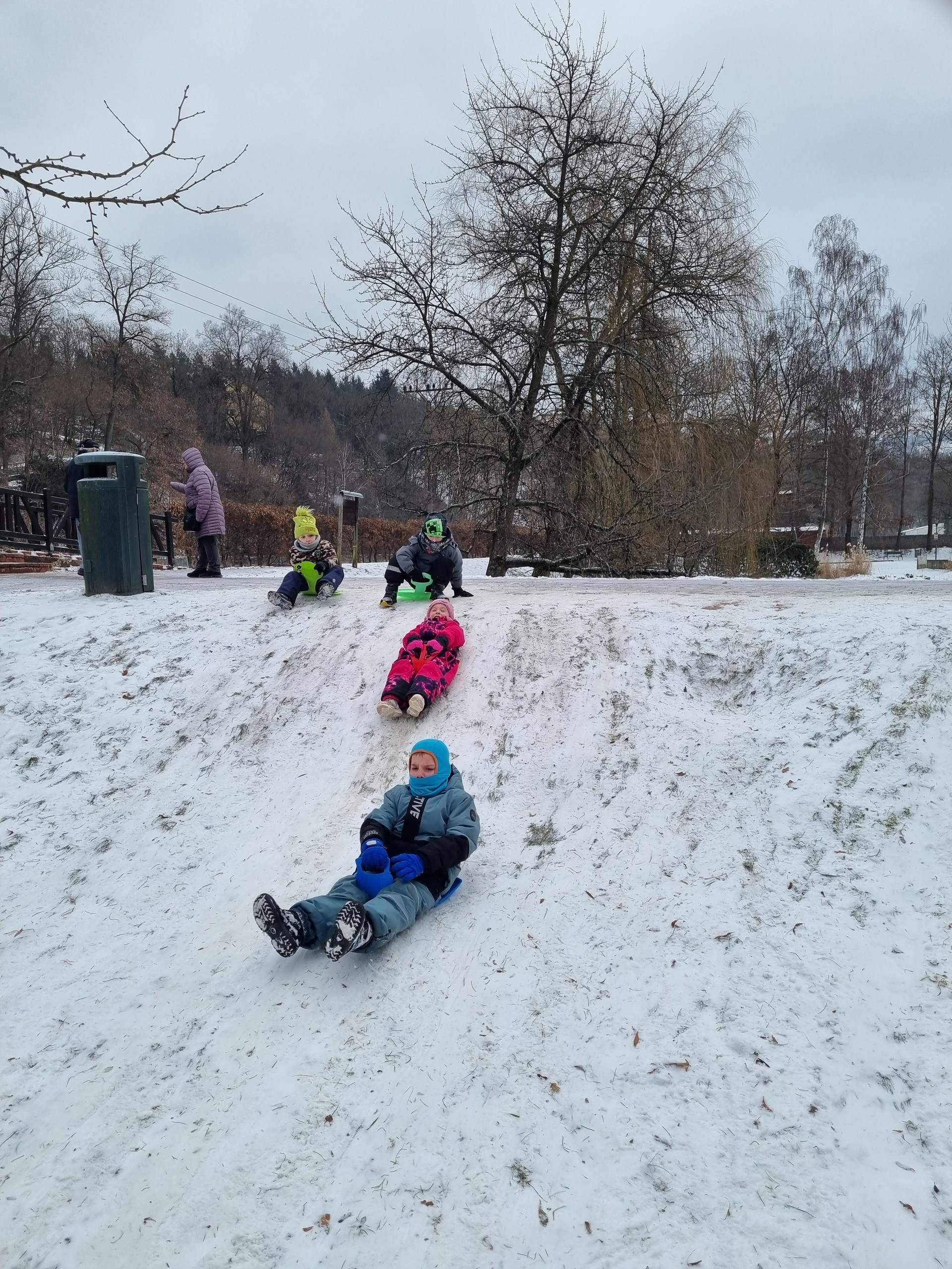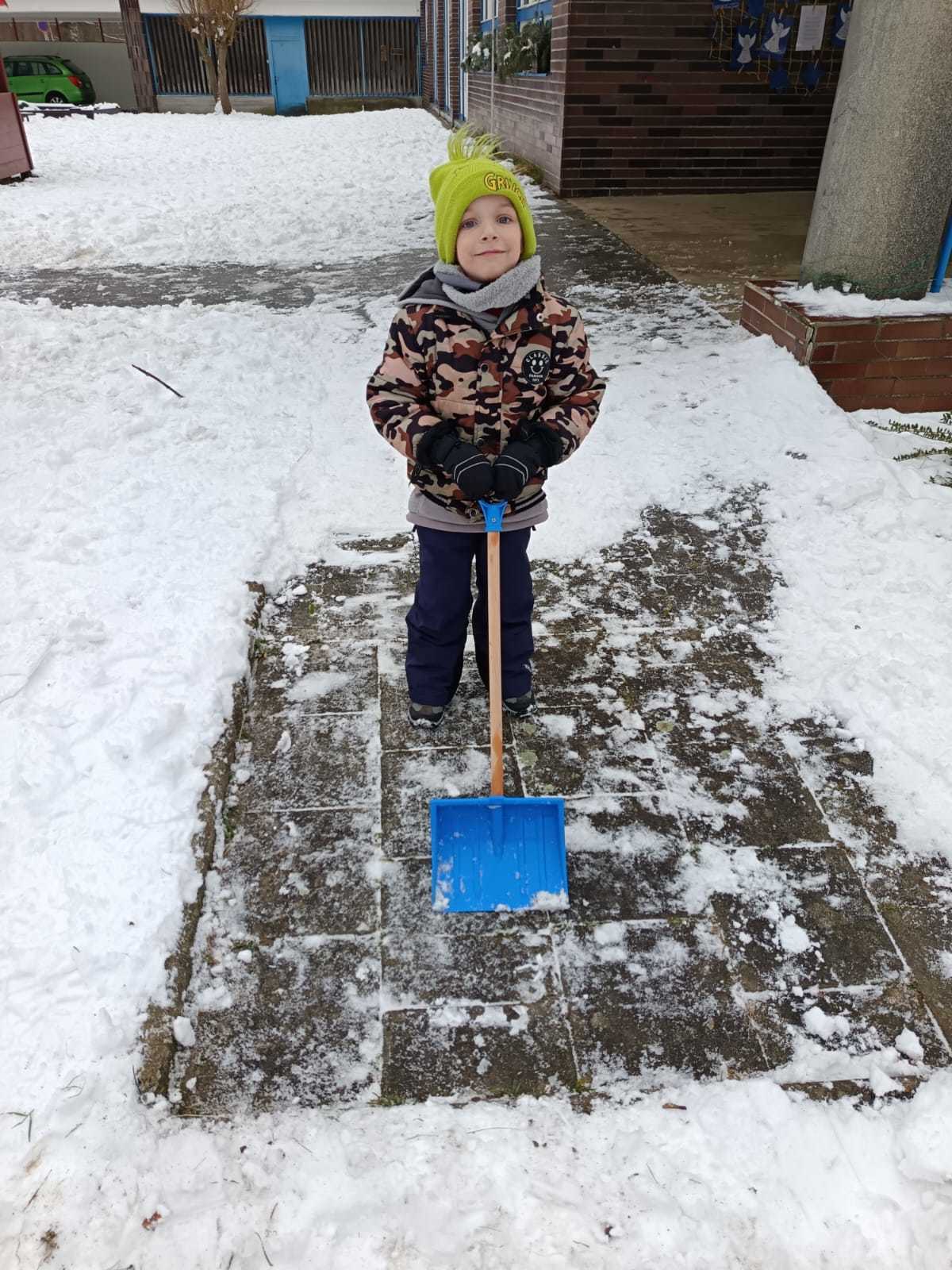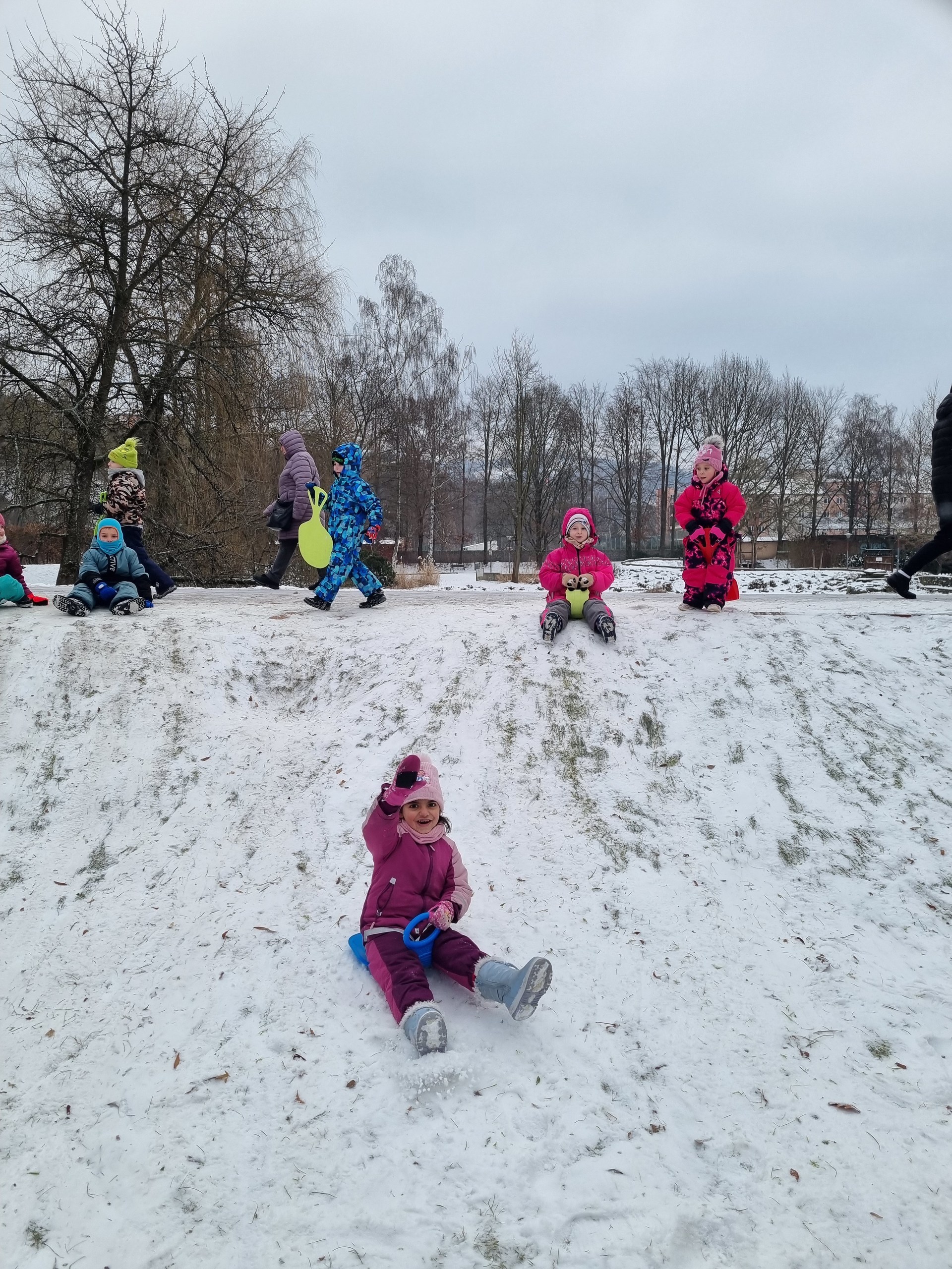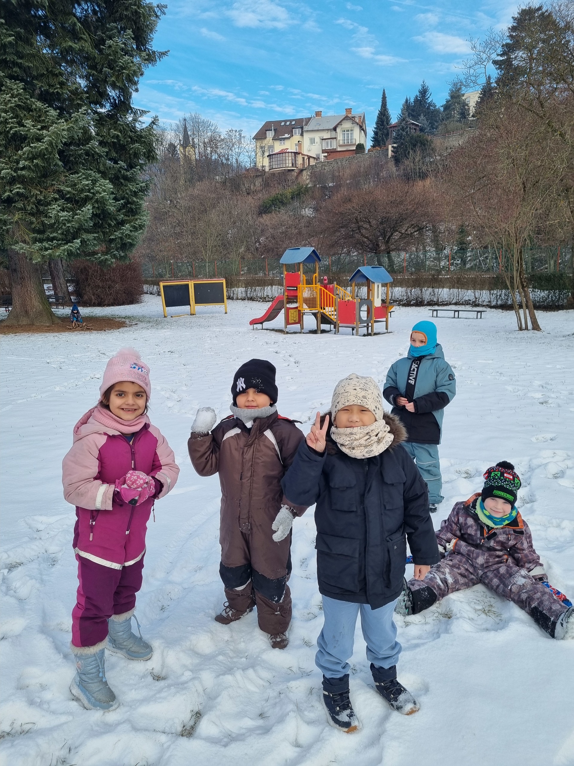 Teple se obléct, nasadit čepici, rukavice, a jde se na to! K maximálnímu využití sněhové pokrývky nám posloužila školní zahrada a příroda v okolí. Děti s radostí koulely sněhuláky, dělaly andělíčky, tvořily cestičky, vyzkoušely si malování barvičkami do sněhu a některé se dokonce chopily lopaty a zapojily své svaly během odklízení sněhu z chodníku. :-) Samozřejmě nechyběla ani jízda na lopatách, které si děti přinesly z domu a během níž jsme si užili spoustu legrace.