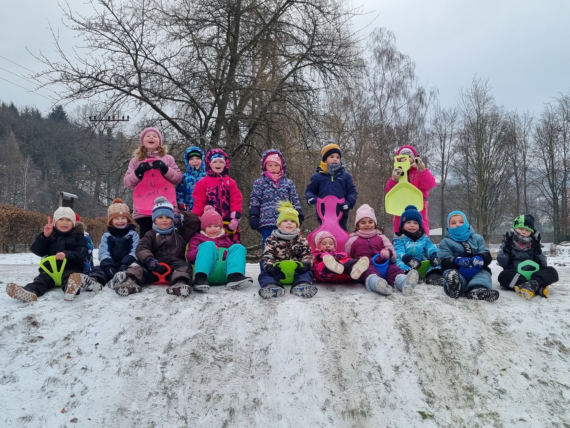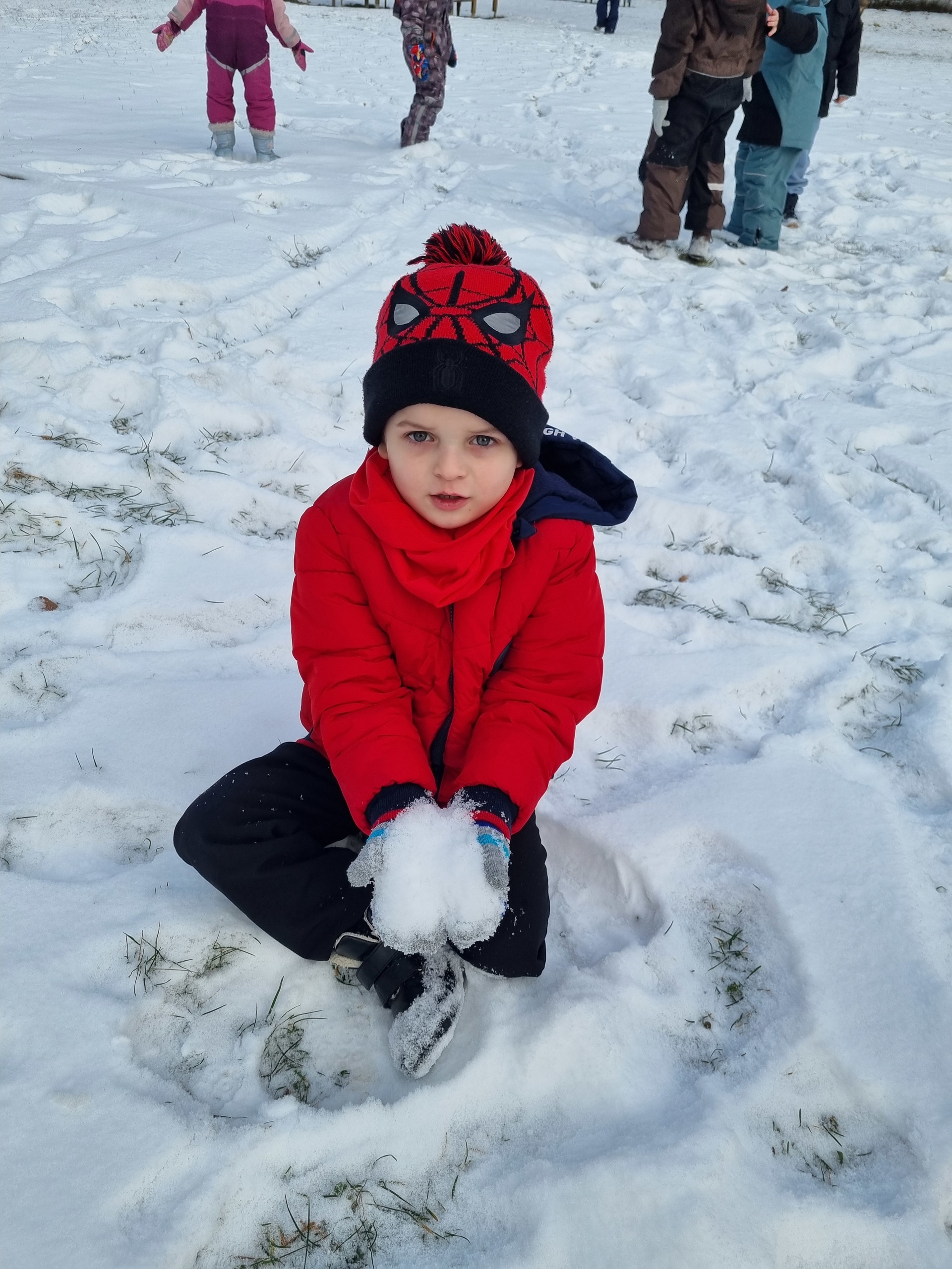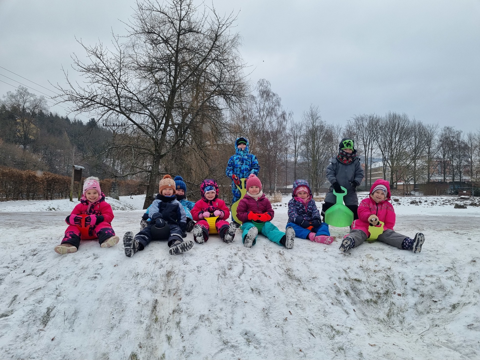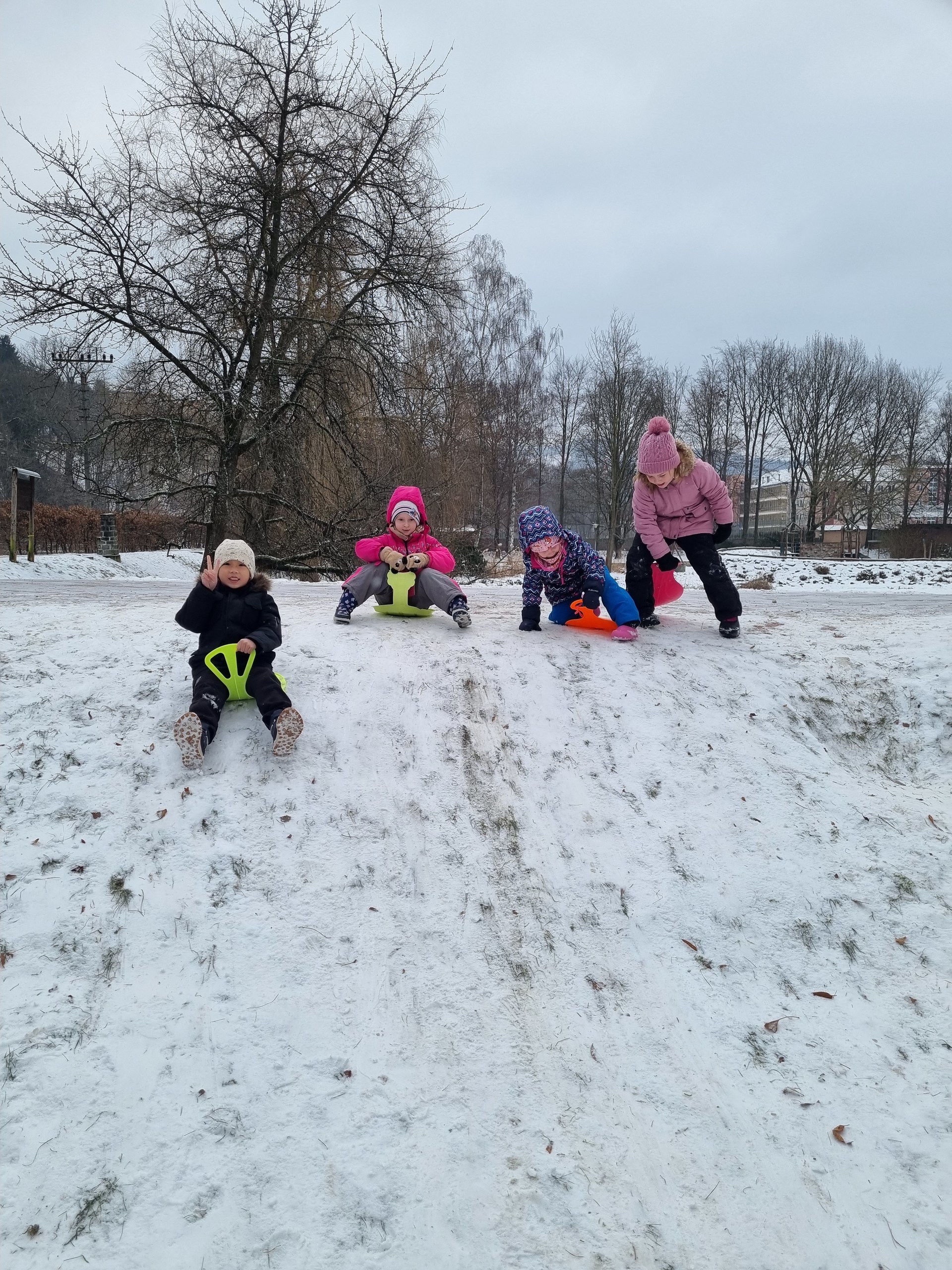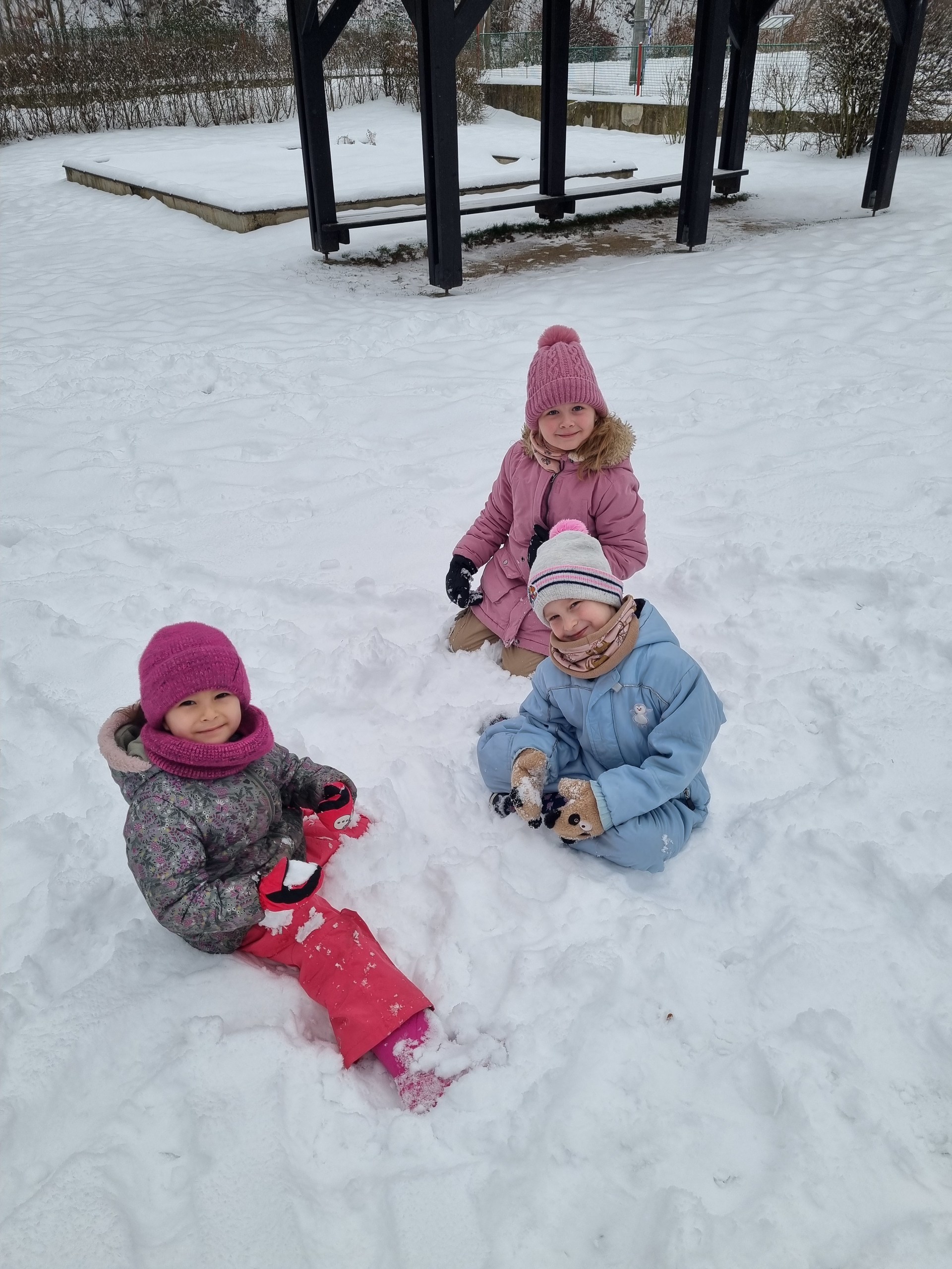 Teple se obléct, nasadit čepici, rukavice, a jde se na to! K maximálnímu využití sněhové pokrývky nám posloužila školní zahrada a příroda v okolí. Děti s radostí koulely sněhuláky, dělaly andělíčky, tvořily cestičky, vyzkoušely si malování barvičkami do sněhu a některé se dokonce chopily lopaty a zapojily své svaly během odklízení sněhu z chodníku. :-) Samozřejmě nechyběla ani jízda na lopatách, které si děti přinesly z domu a během níž jsme si užili spoustu legrace.