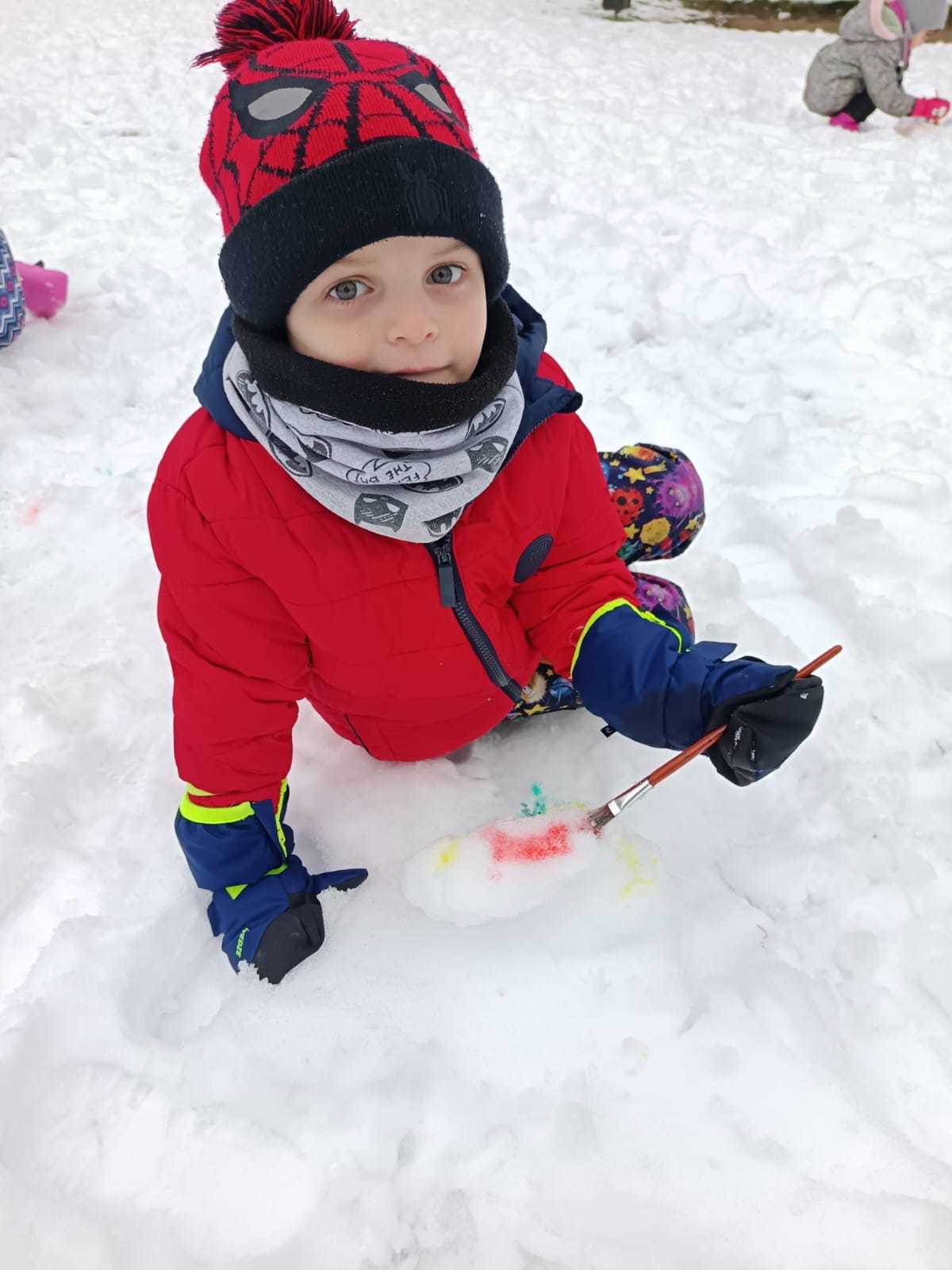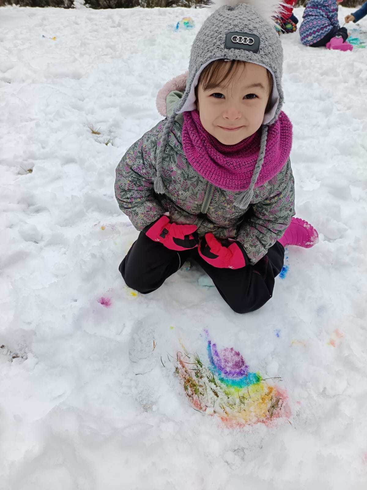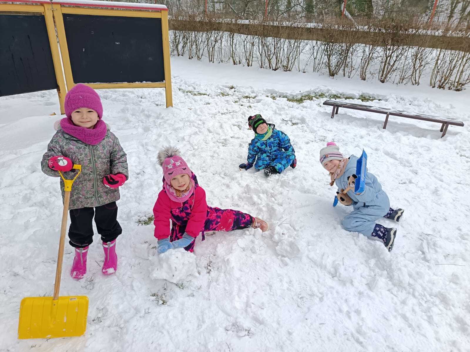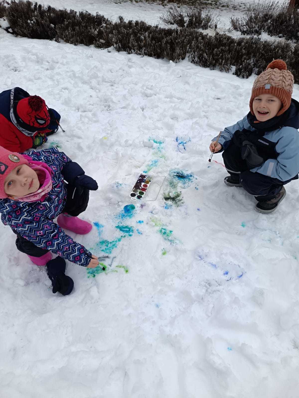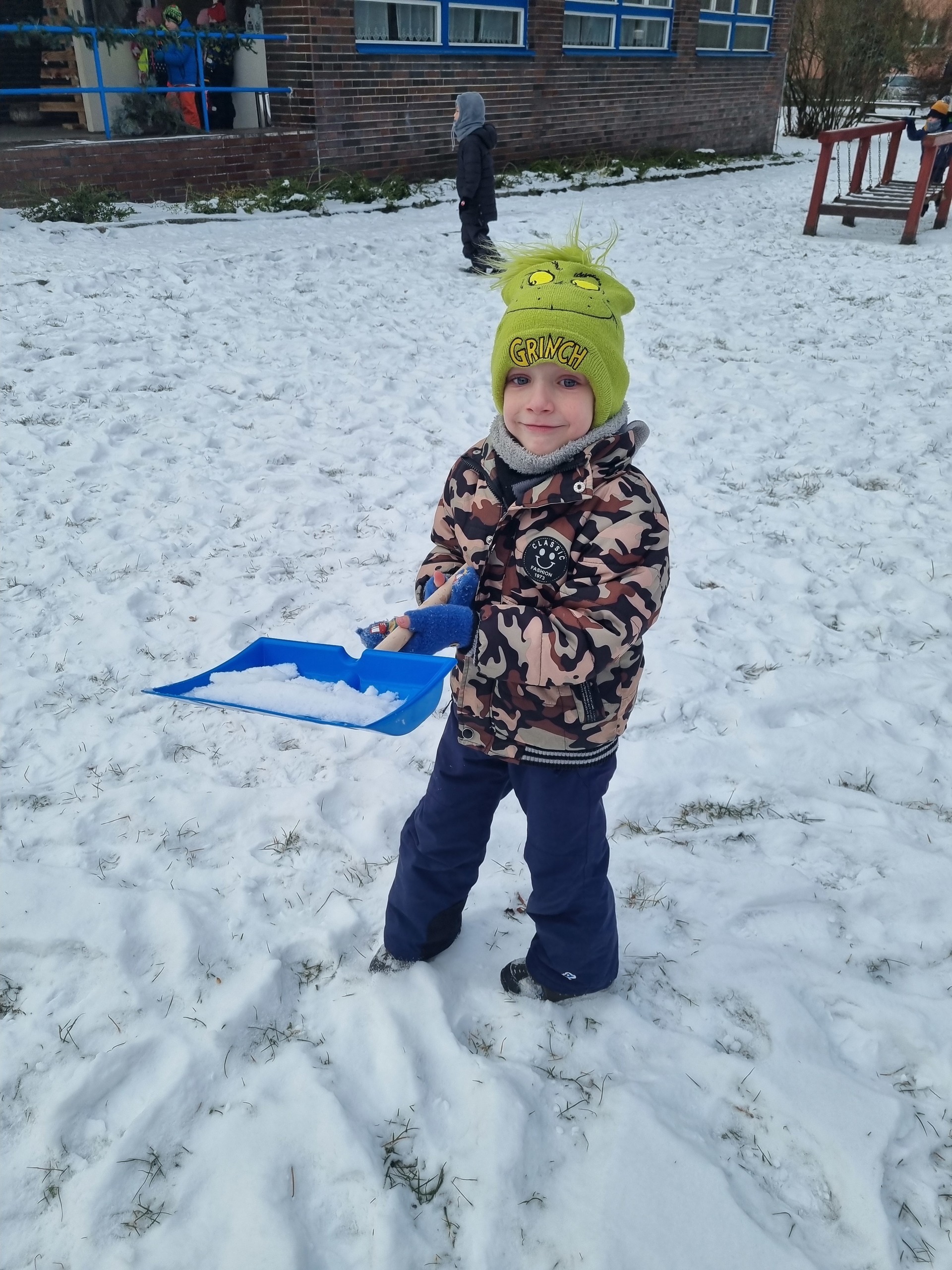 Teple se obléct, nasadit čepici, rukavice, a jde se na to! K maximálnímu využití sněhové pokrývky nám posloužila školní zahrada a příroda v okolí. Děti s radostí koulely sněhuláky, dělaly andělíčky, tvořily cestičky, vyzkoušely si malování barvičkami do sněhu a některé se dokonce chopily lopaty a zapojily své svaly během odklízení sněhu z chodníku. :-) Samozřejmě nechyběla ani jízda na lopatách, které si děti přinesly z domu a během níž jsme si užili spoustu legrace.