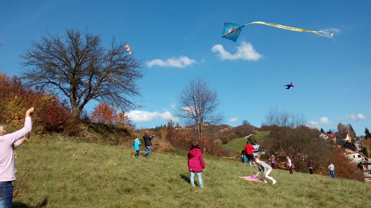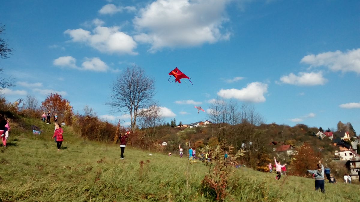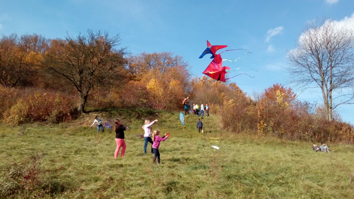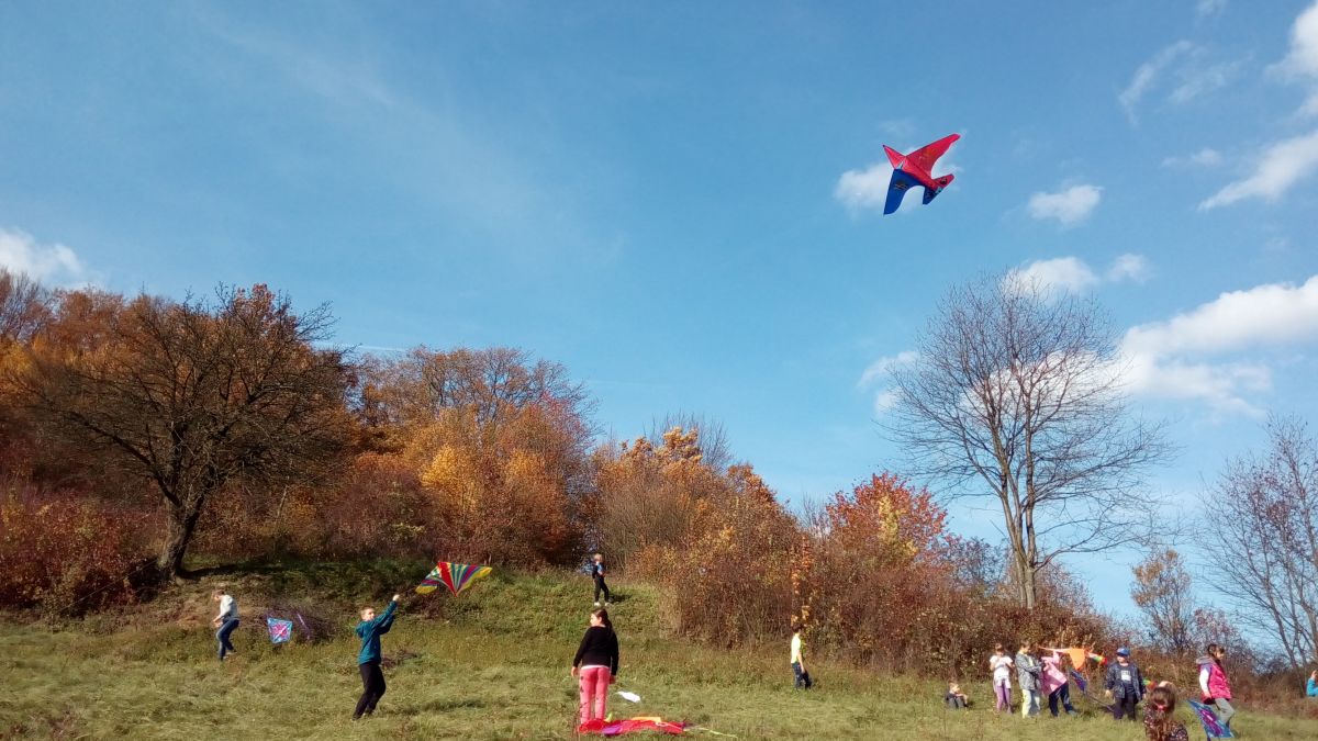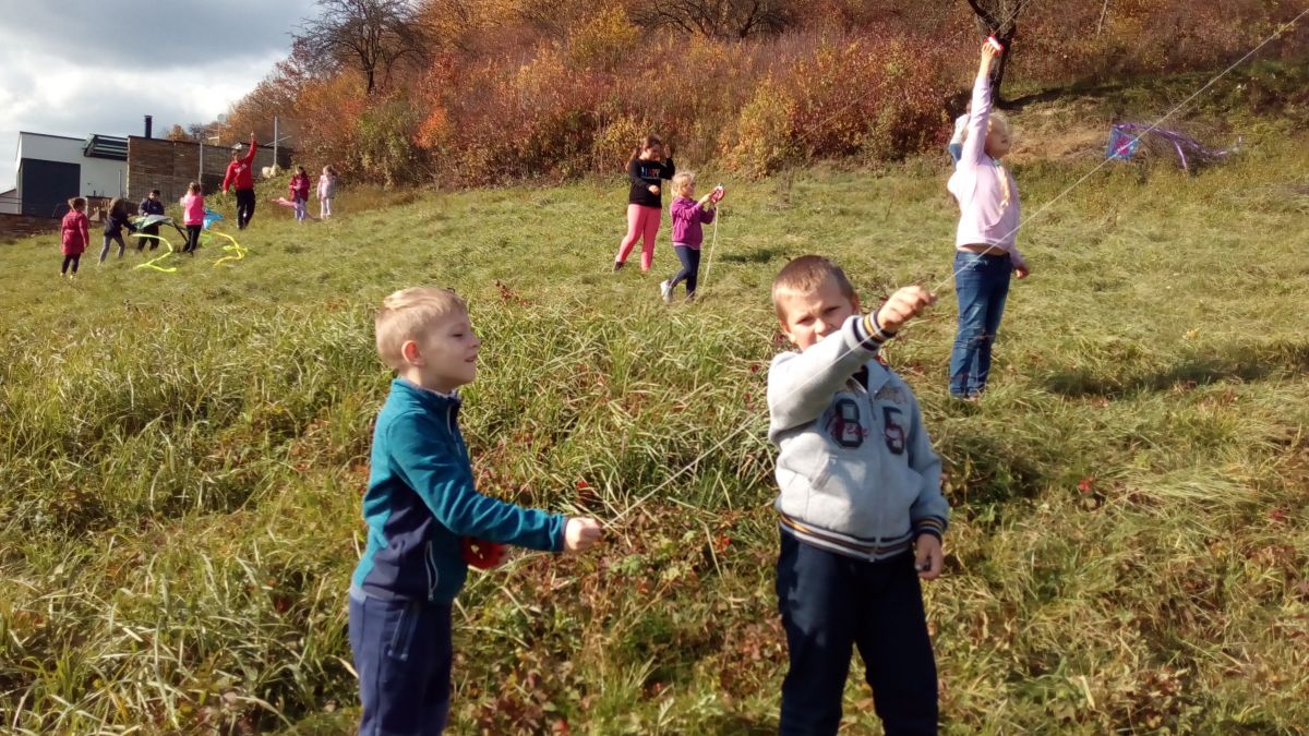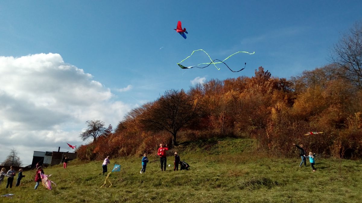 Krásné babí léto vylákalo na kopec za školou děti školní družiny se svými dráčky.