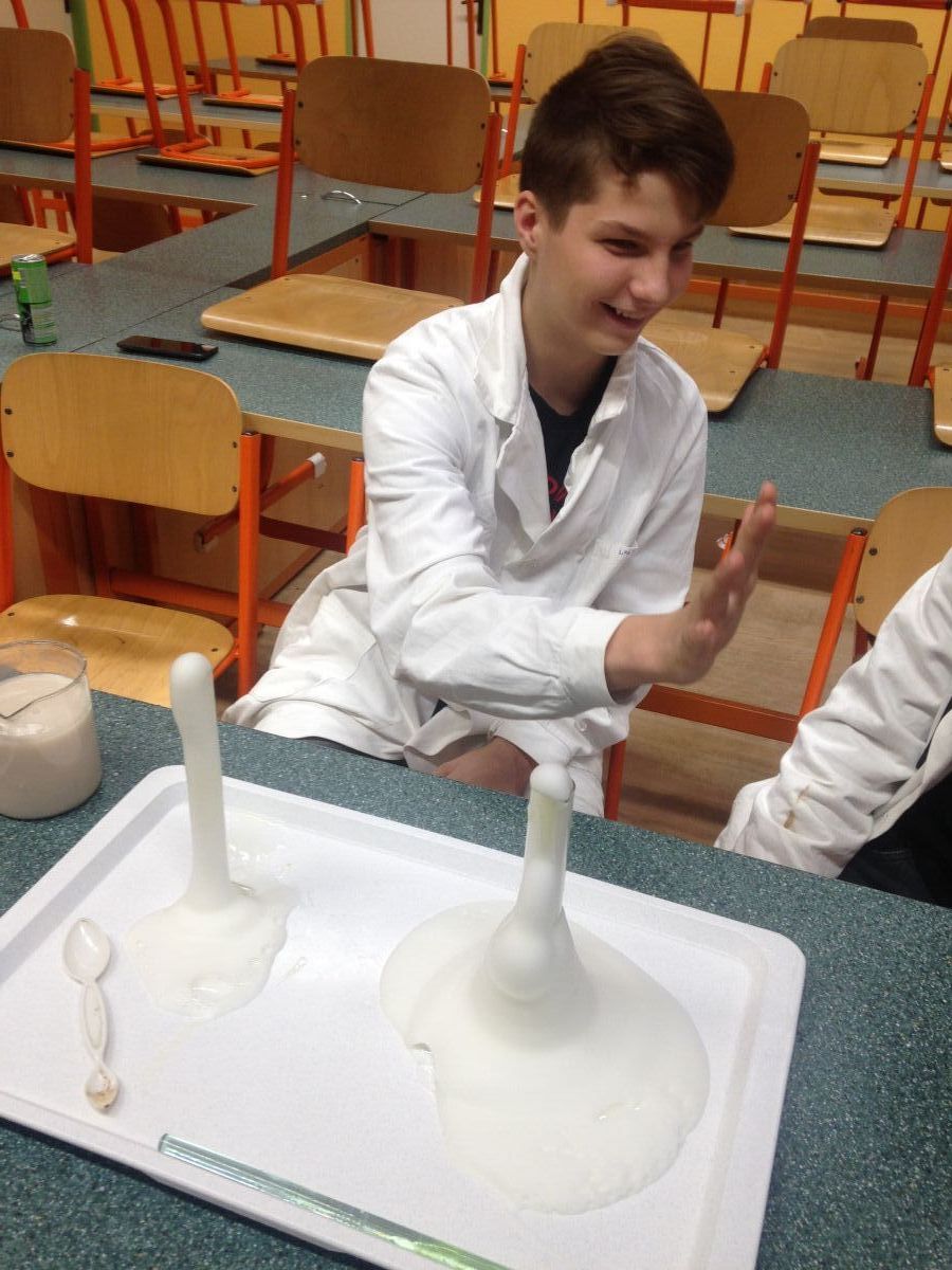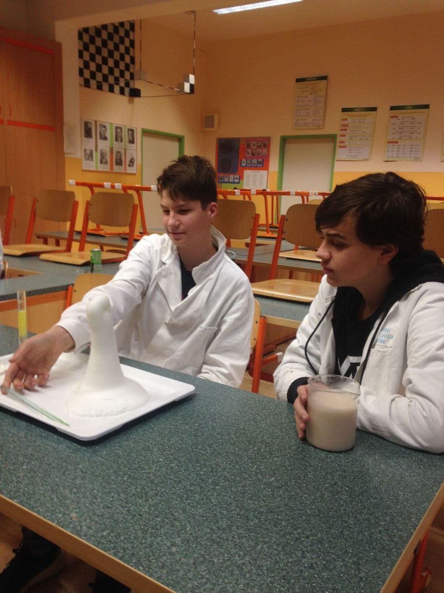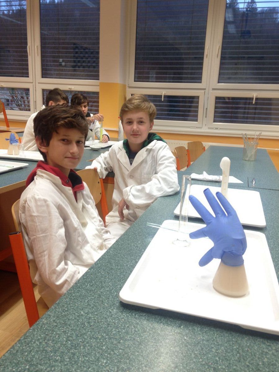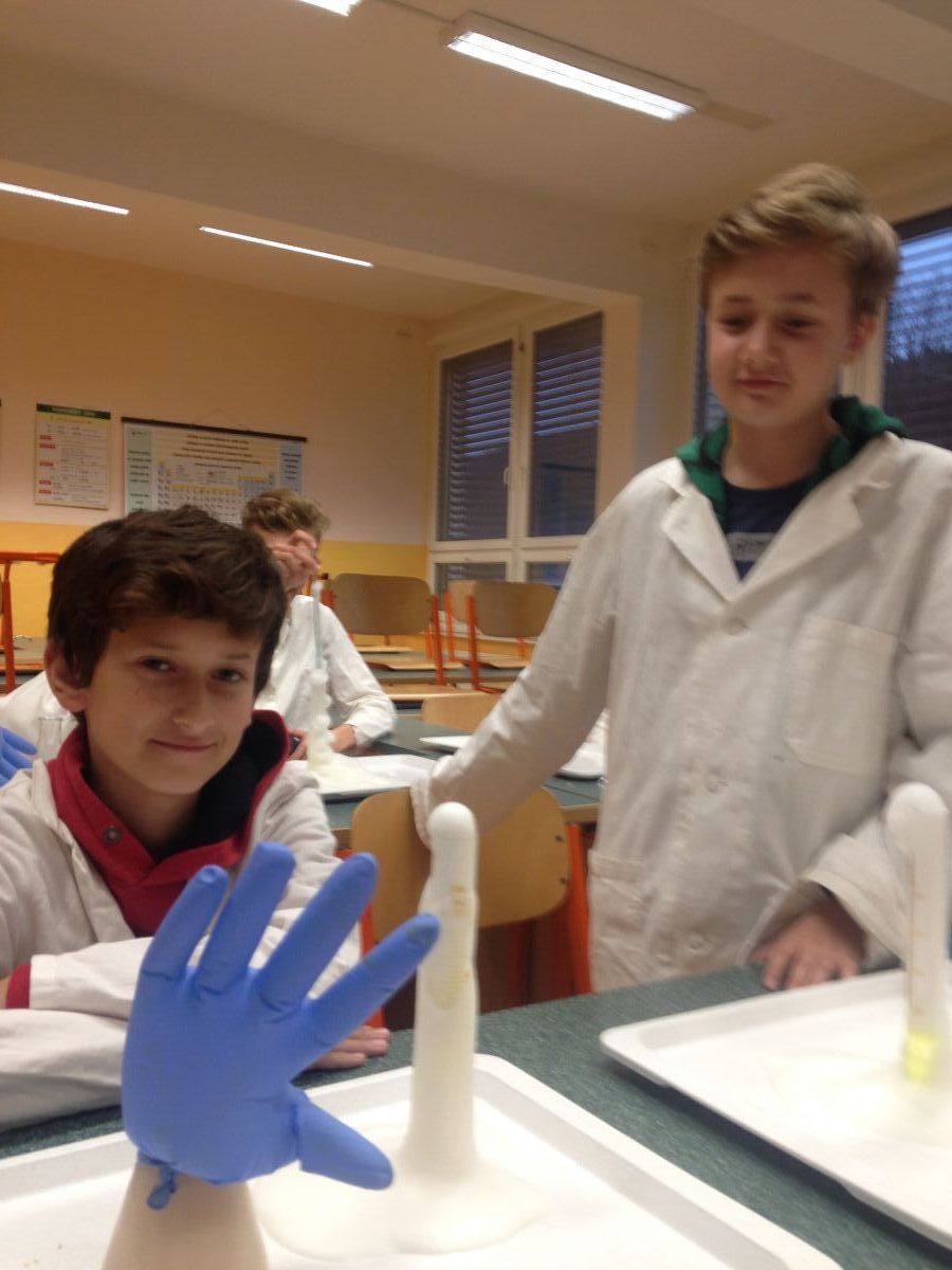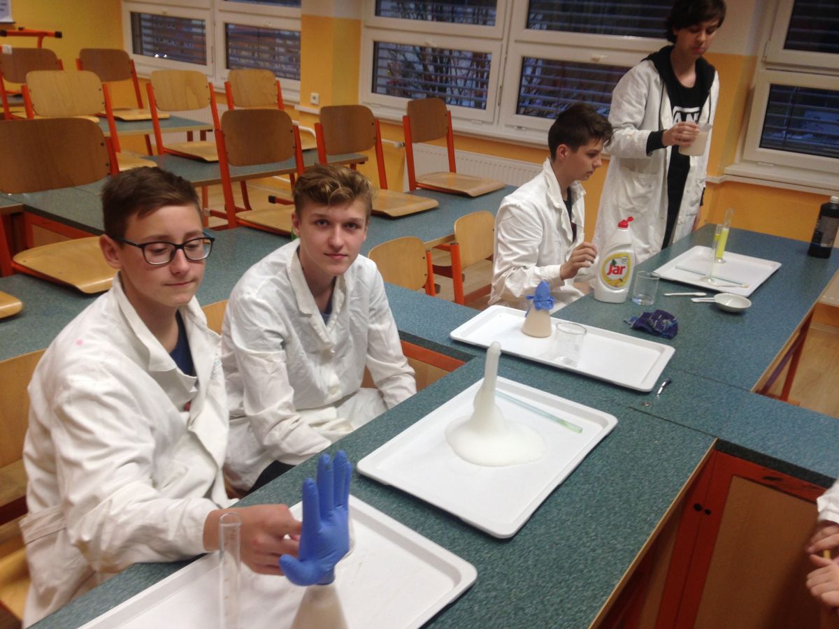 I v letošním roce na naší škole probíhá kroužek Zábavné chemie. Pod vedením Mgr. Jiřího Vařejky se osm badatelů z šestých až devátých tříd snaží pronikat do tajů chemických pokusů se záhadnými názvy "sloní zubní pasta", "blesky pod vodou"nebo "hrozící rukavice".