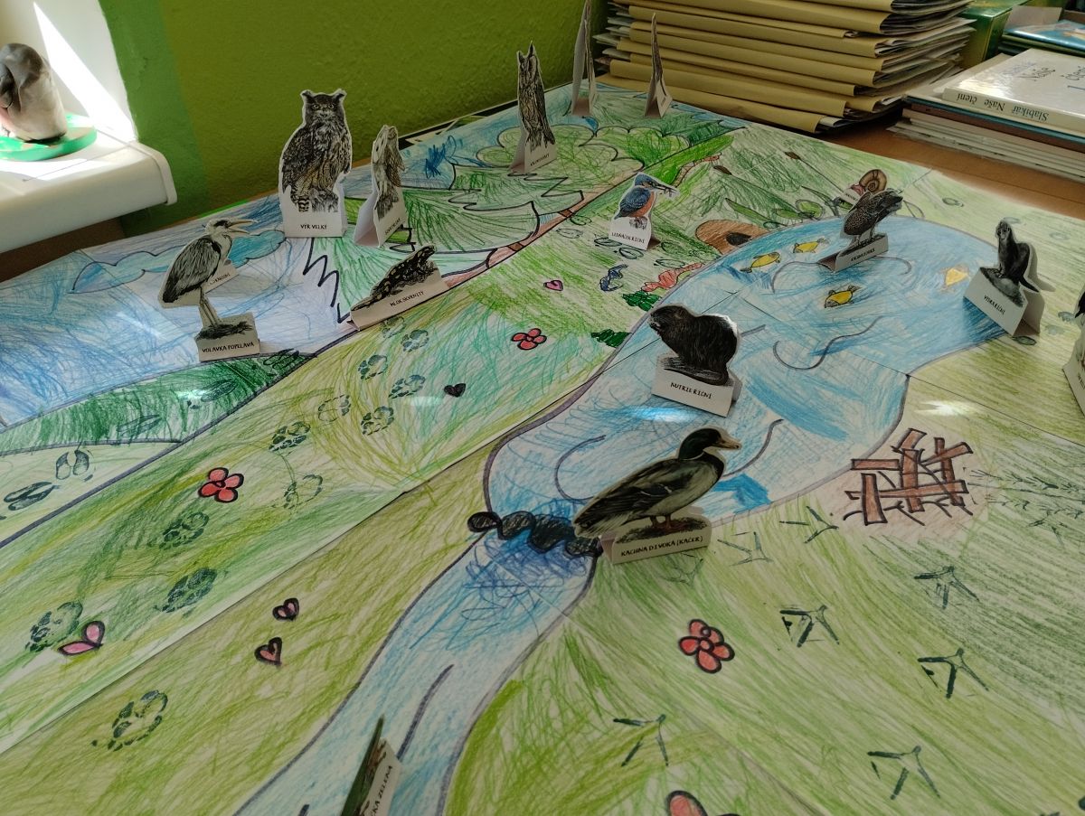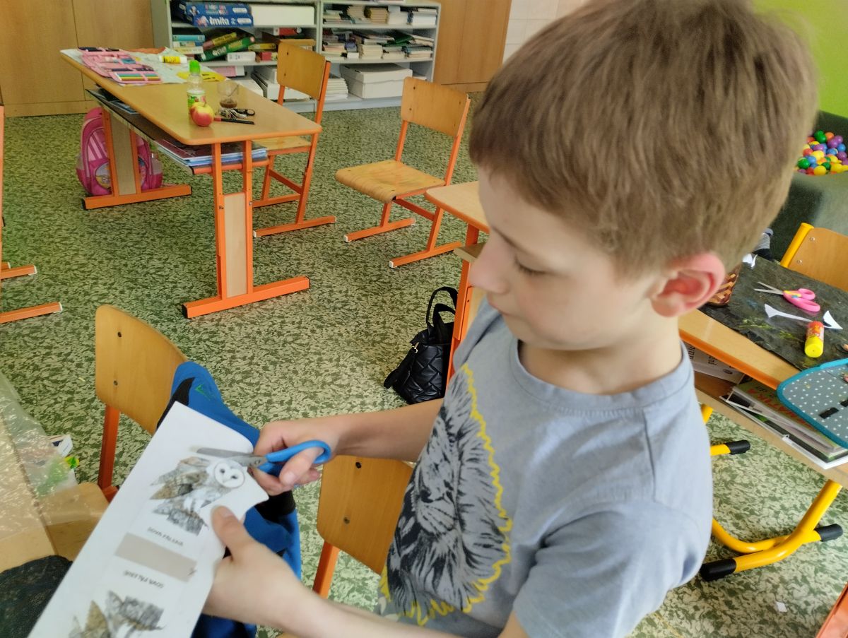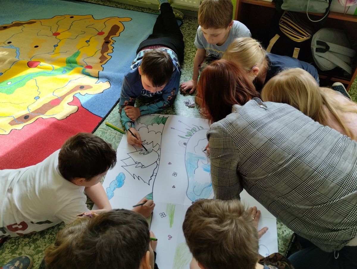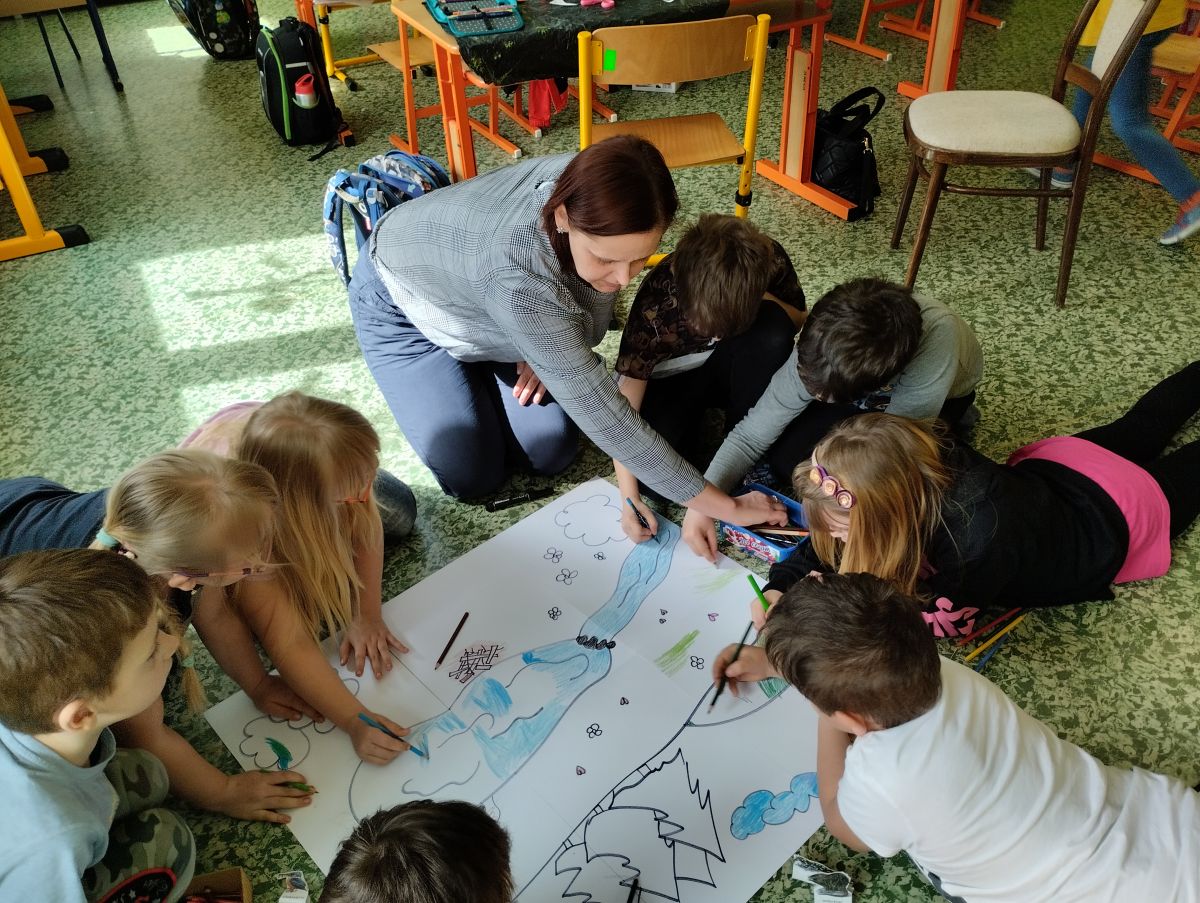 Materiály dodané z předcházející přednášky se hodily. Žáci společně namalovali velký obraz krajiny, do kterého vlepili vystřižené papírové obrázky a razítkem vyznačili stopy. Je radost sledovat, jak si navzájem rozdělí práci, někdo strouhá pastelky, někdo maluje oblohu a další stromy…