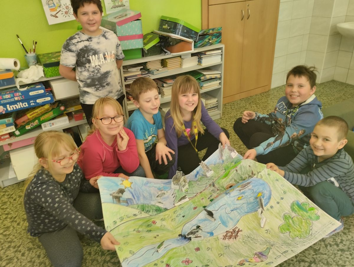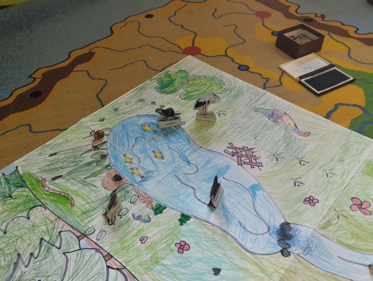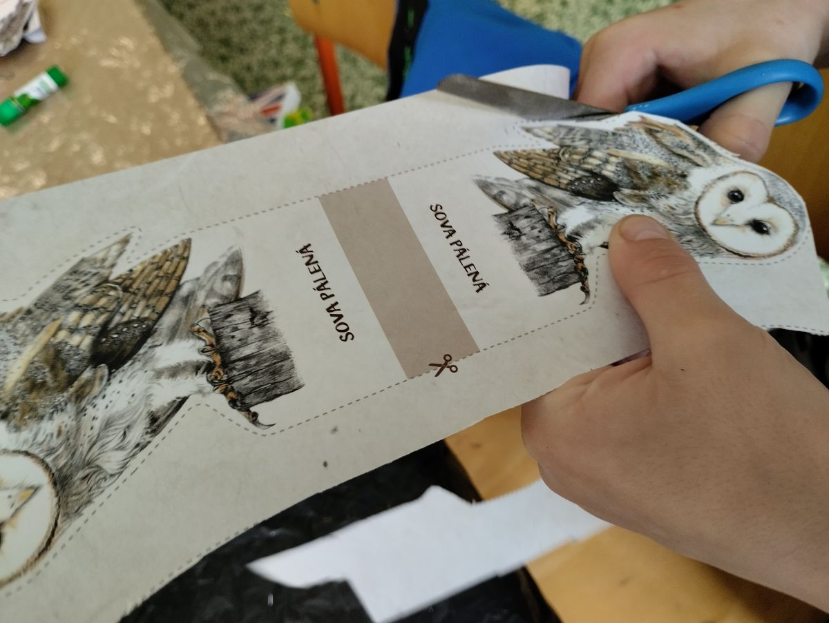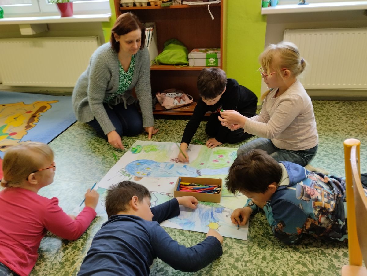 Materiály dodané z předcházející přednášky se hodily. Žáci společně namalovali velký obraz krajiny, do kterého vlepili vystřižené papírové obrázky a razítkem vyznačili stopy. Je radost sledovat, jak si navzájem rozdělí práci, někdo strouhá pastelky, někdo maluje oblohu a další stromy…