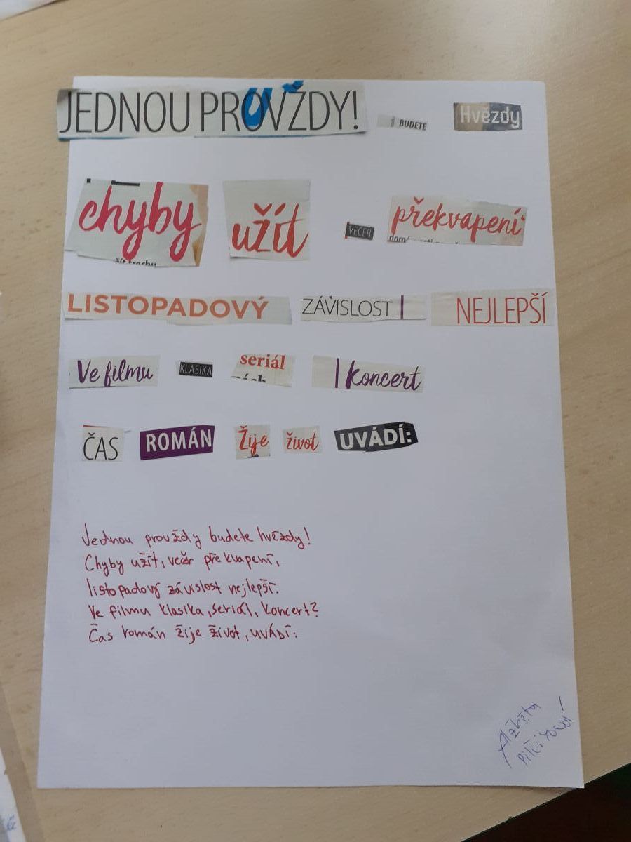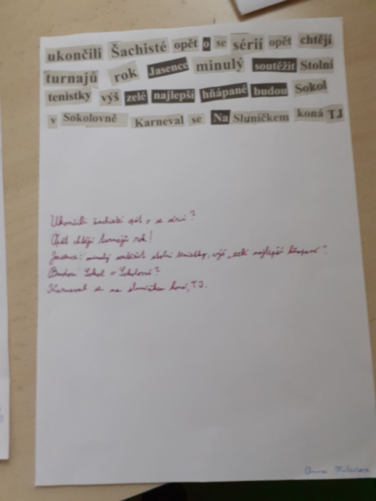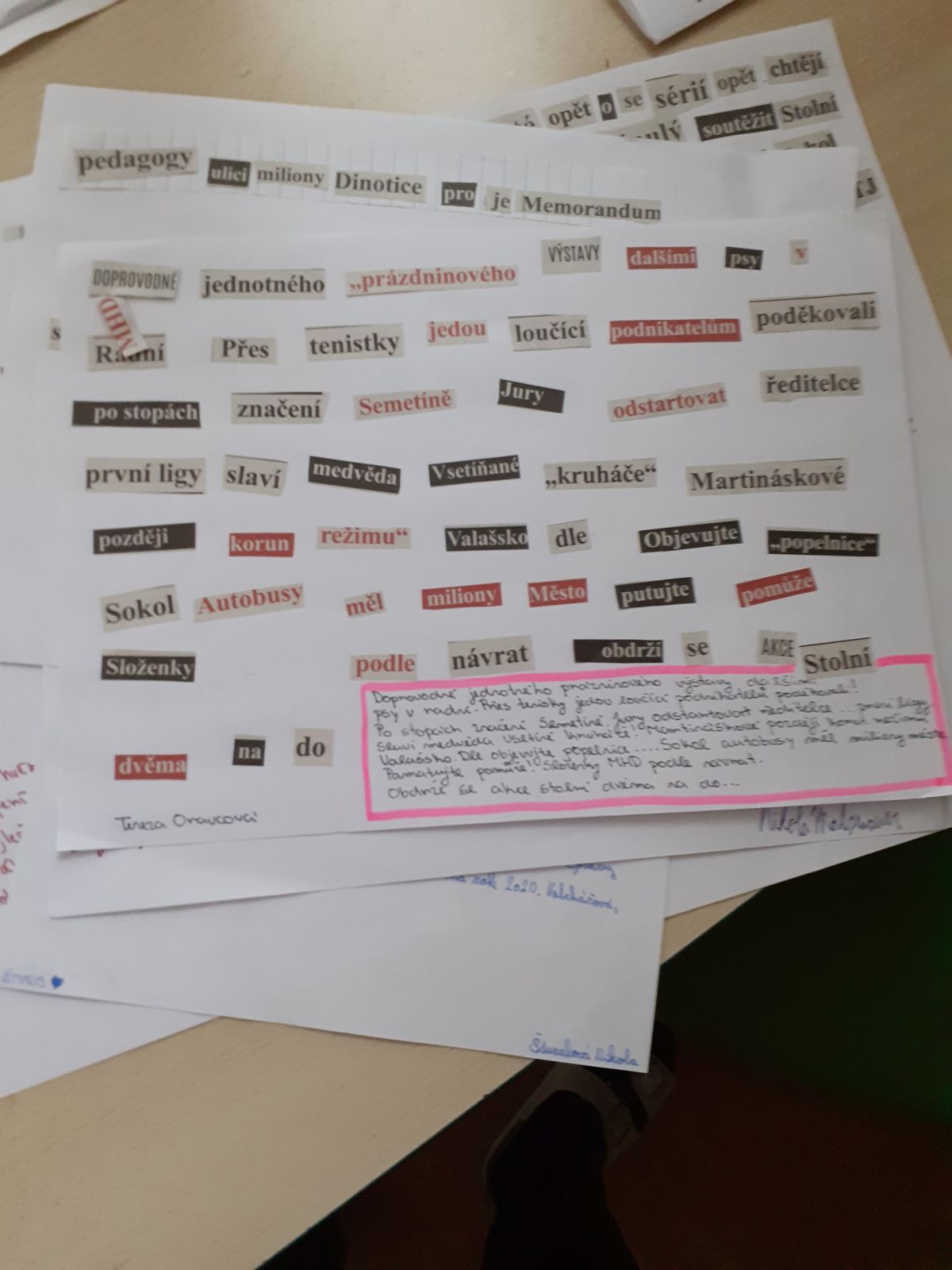 Pokusili jsme se s jedním takovým experimentálním básnickým stylem v hodině českého jazyka "popasovat" po svém.:-). Jedná se o "dadaismus", jehož duchovním otcem počátkem 20. století byl francouzský spisovatel rumunského původu Tristan Tzara. Dadaismus vznikl ze slova DADA - hra, hra se slovy. Děti vystřihují z článků v časopisech a novinách věty, nadpisy, které následně rozstříhají na slova. Tato slova zamíchají a bez hledání logiky a smyslu v řadění slov je náhodně pokládají za sebou a lepí na papír. Vznikají zajímavé slovní asociace, u kterých se nejednou zasmějeme. Tyto vzniklé asociace, slogany, u někoho i texty přepisují děti na papír a dolaďují je interpunkčními znaménky - tečky, čárky, vykřičníky, otazníky, uvozovky. Tady už se pokusí zapojit logiku, aby z náhodného textu vzniklo něco smysluplnějšího, event. slovní hříčka.