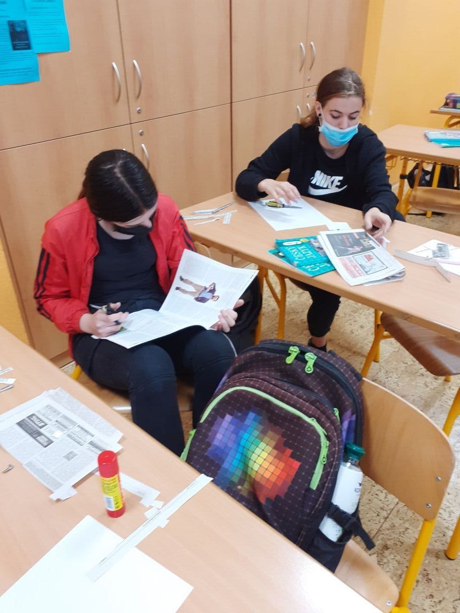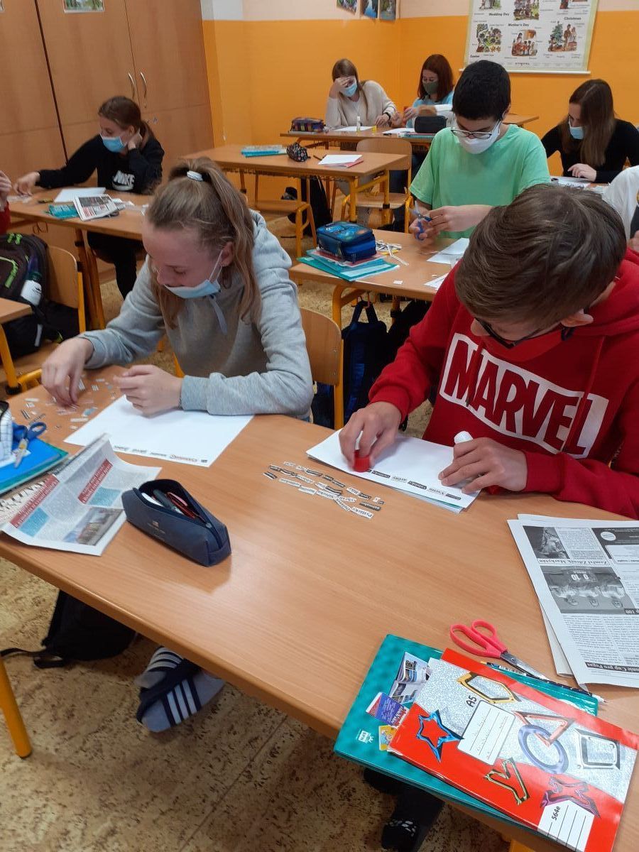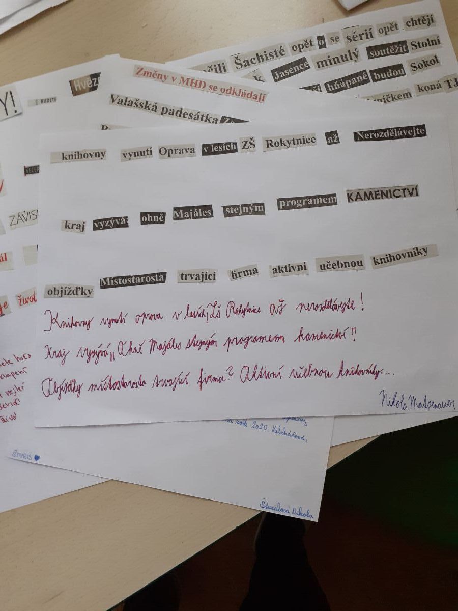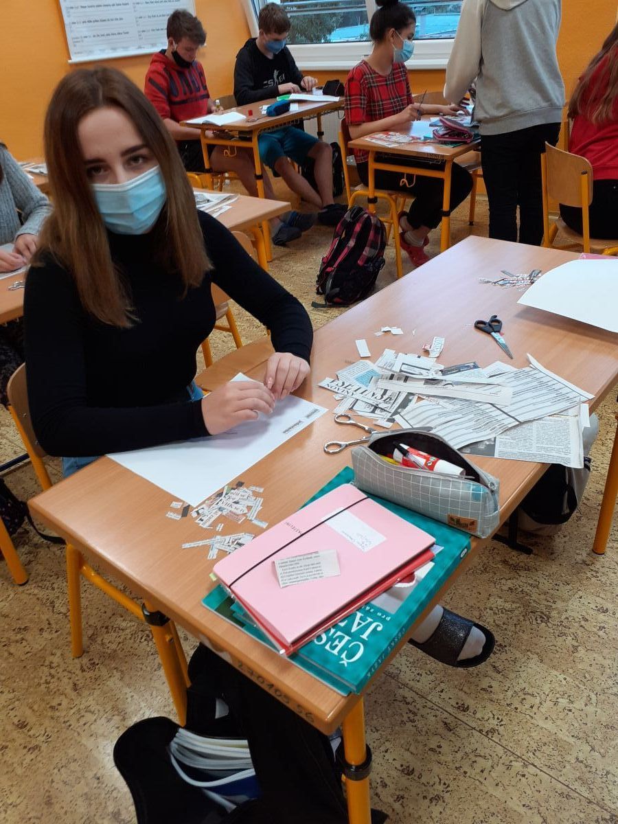 Pokusili jsme se s jedním takovým experimentálním básnickým stylem v hodině českého jazyka "popasovat" po svém.:-). Jedná se o "dadaismus", jehož duchovním otcem počátkem 20. století byl francouzský spisovatel rumunského původu Tristan Tzara. Dadaismus vznikl ze slova DADA - hra, hra se slovy. Děti vystřihují z článků v časopisech a novinách věty, nadpisy, které následně rozstříhají na slova. Tato slova zamíchají a bez hledání logiky a smyslu v řadění slov je náhodně pokládají za sebou a lepí na papír. Vznikají zajímavé slovní asociace, u kterých se nejednou zasmějeme. Tyto vzniklé asociace, slogany, u někoho i texty přepisují děti na papír a dolaďují je interpunkčními znaménky - tečky, čárky, vykřičníky, otazníky, uvozovky. Tady už se pokusí zapojit logiku, aby z náhodného textu vzniklo něco smysluplnějšího, event. slovní hříčka.