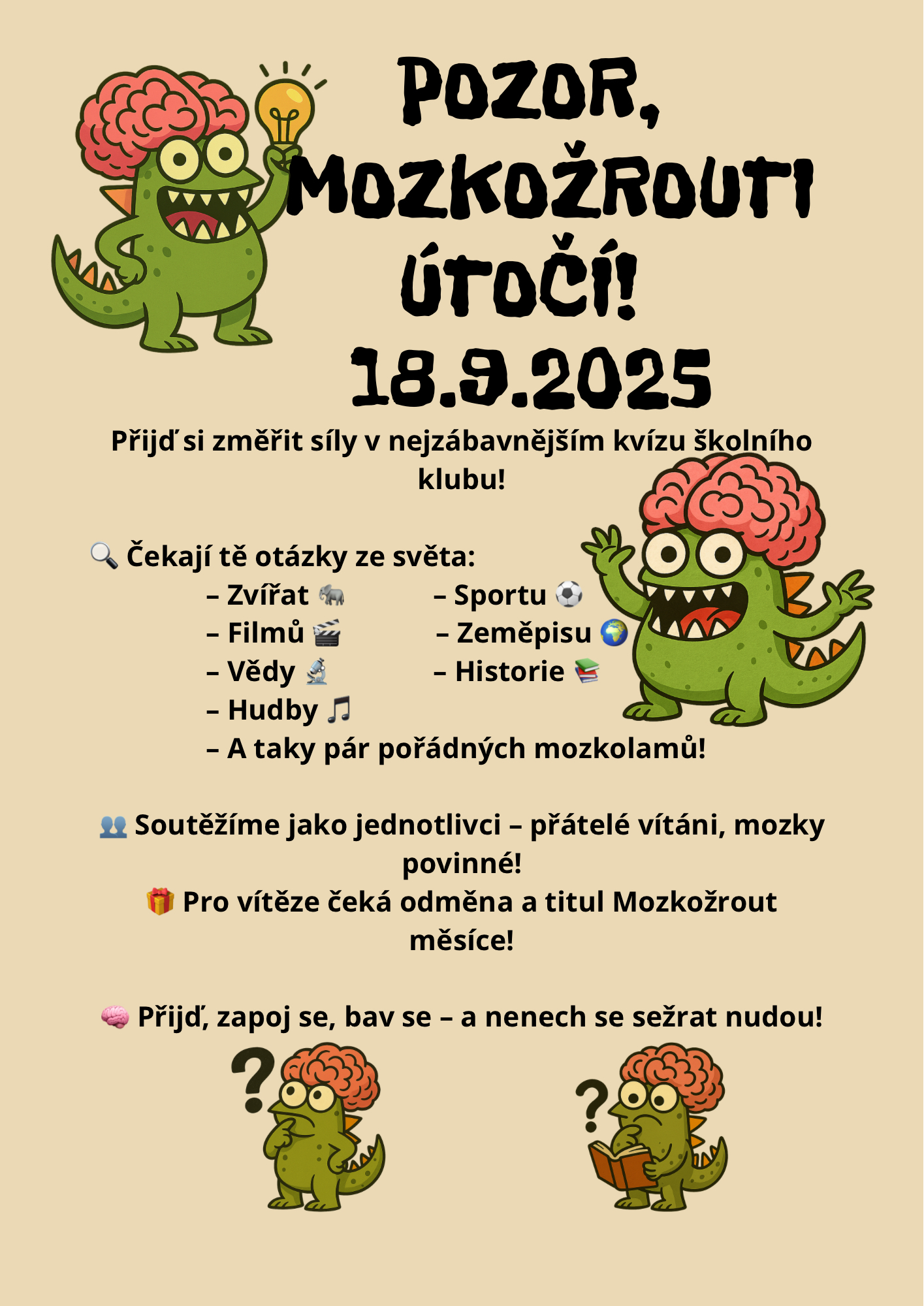 Ve čtvrtek odpoledne se klub proměnil v arénu plnou napětí, smíchu a bystrých hlav. Proběhla zde akce s názvem Mozkožrouti – soutěžní kvíz, kde si děti porovnávaly své znalosti a logické myšlení. Atmosféra byla nabitá energií a soutěžící se s vervou pustili do boje o titul největšího mozkožrouta.