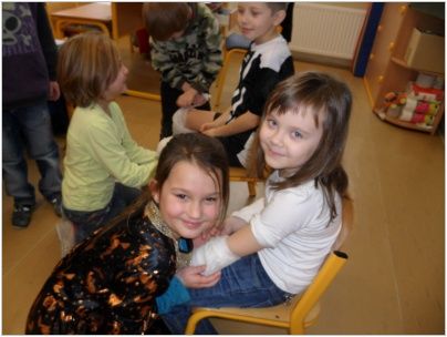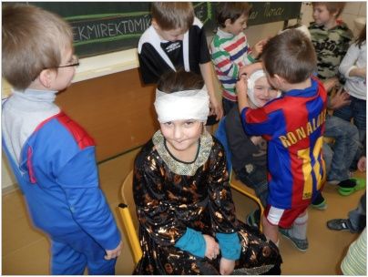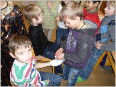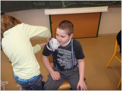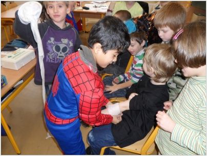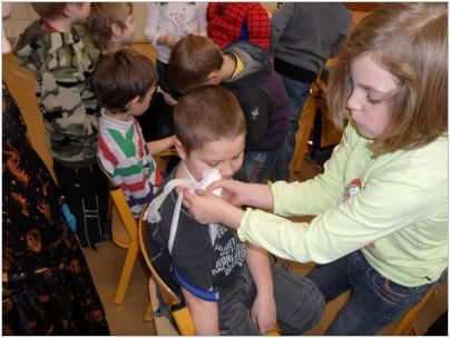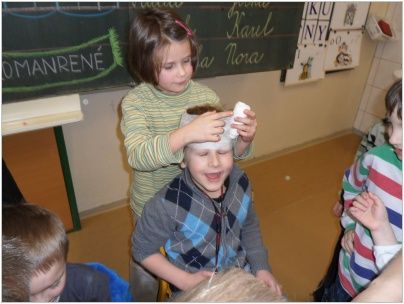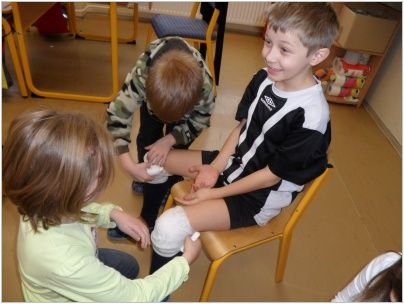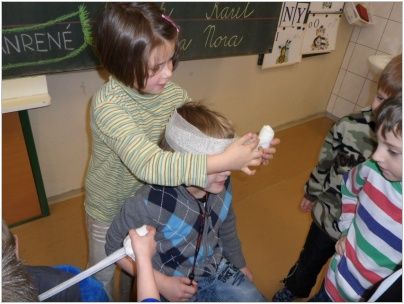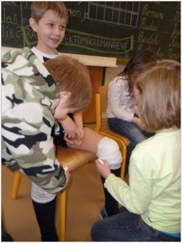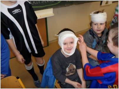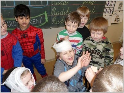 V předmětu Člověk a svět se teoreticky seznámili se zdravovědou a není nic lepšího, než si vše vyzkoušet v praxi. Téma Nemoc - úraz jsme si hodně „vychutnali“. Žáčci byli na potencionálním místě úrazu pomazáni červenou křídou, načež je jejich spolužáci vehementně ošetřovali. Snažili se ze všech sil zachránit spolužákům holý život! Do obvazu však v závěru hodiny byli zamotaní nejen zranění.