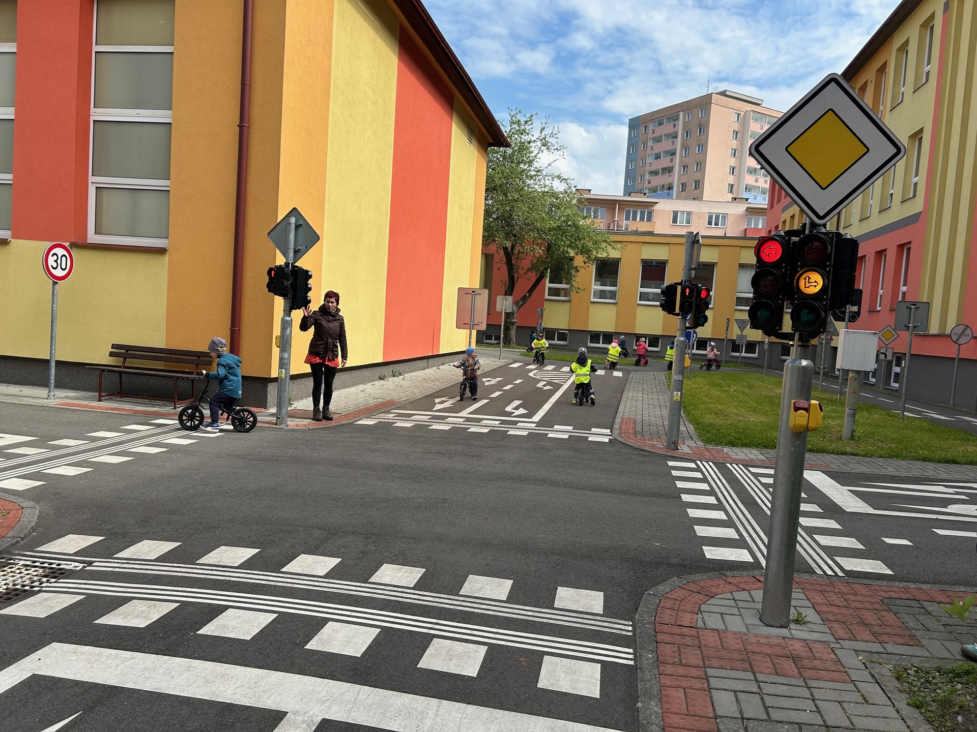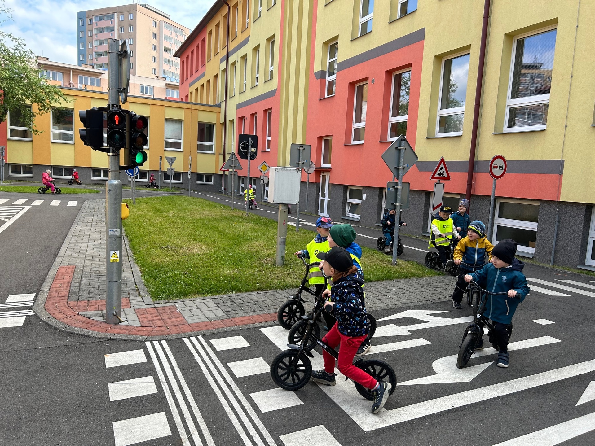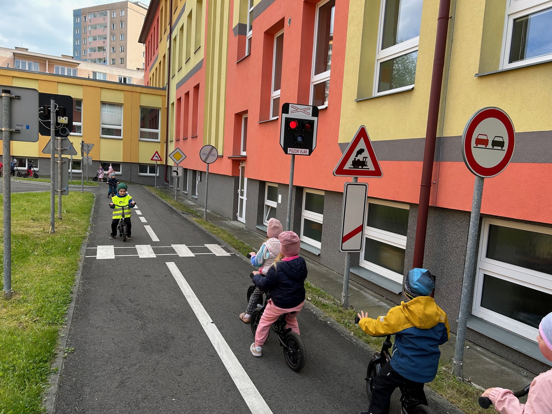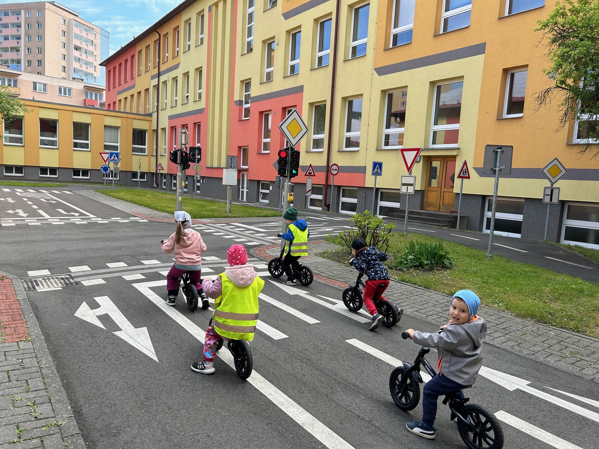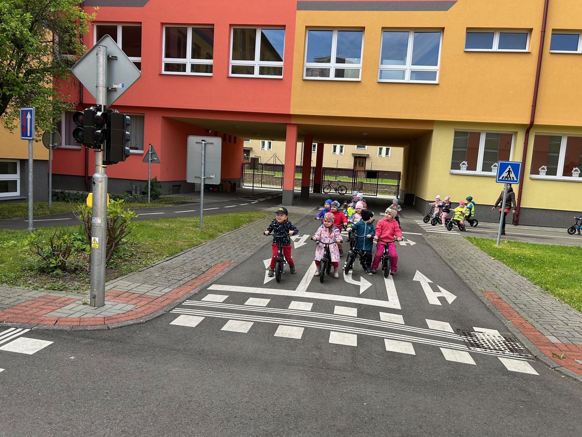 Na hřišti děti nasedly na připravená odrážedla a vydaly se na „silnici“. Některé hrály roli chodců, jiné se staly malými cyklisty. Všichni se snažili co nejlépe dodržovat pravidla, zastavovali na značce „STOP“ a dávali přednost v jízdě.