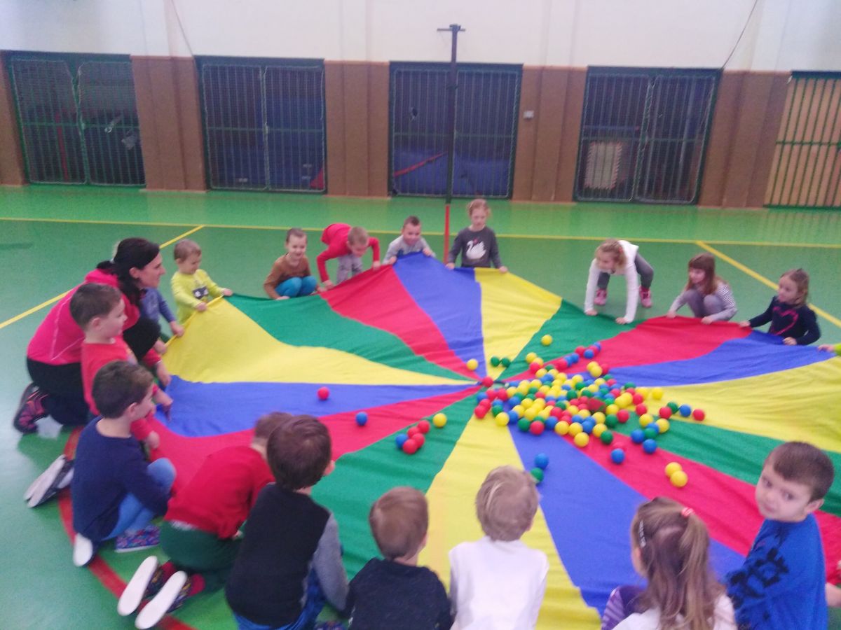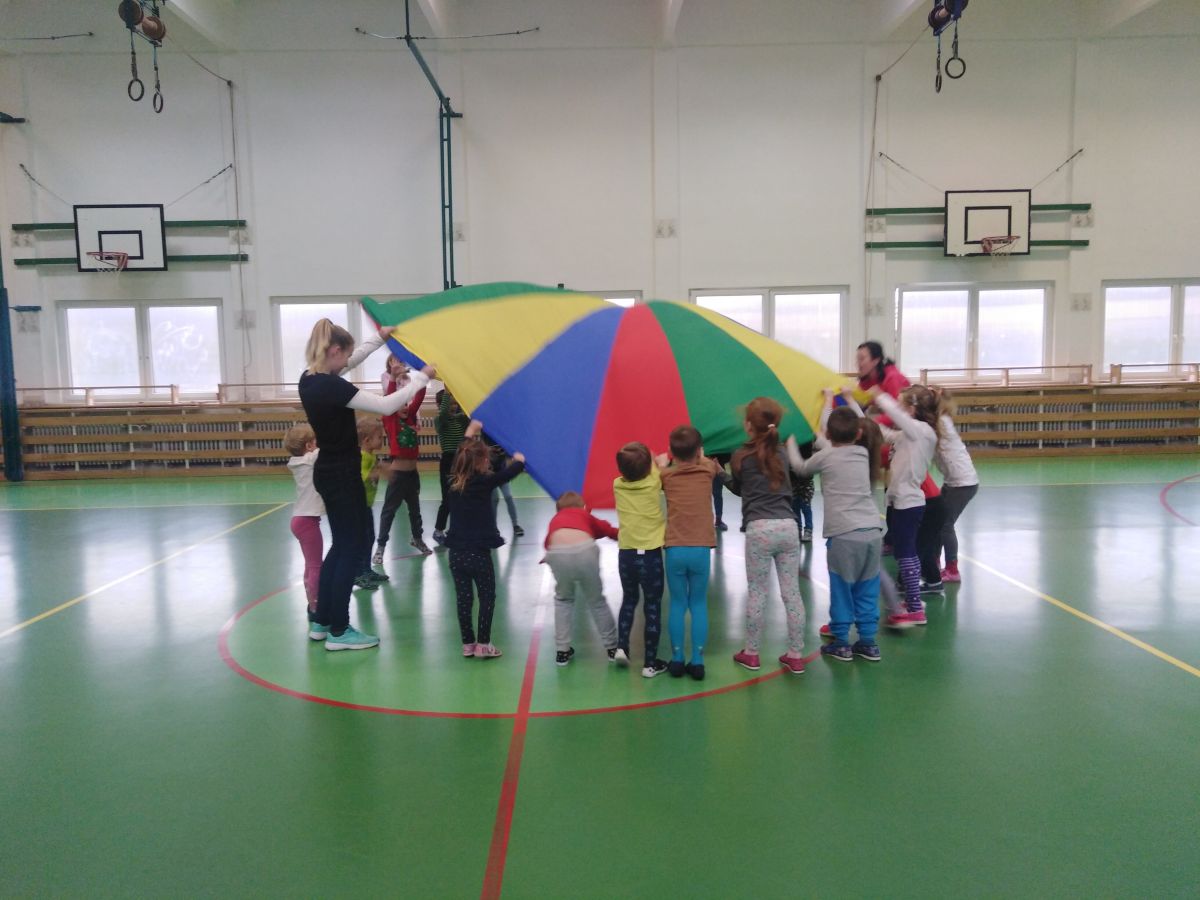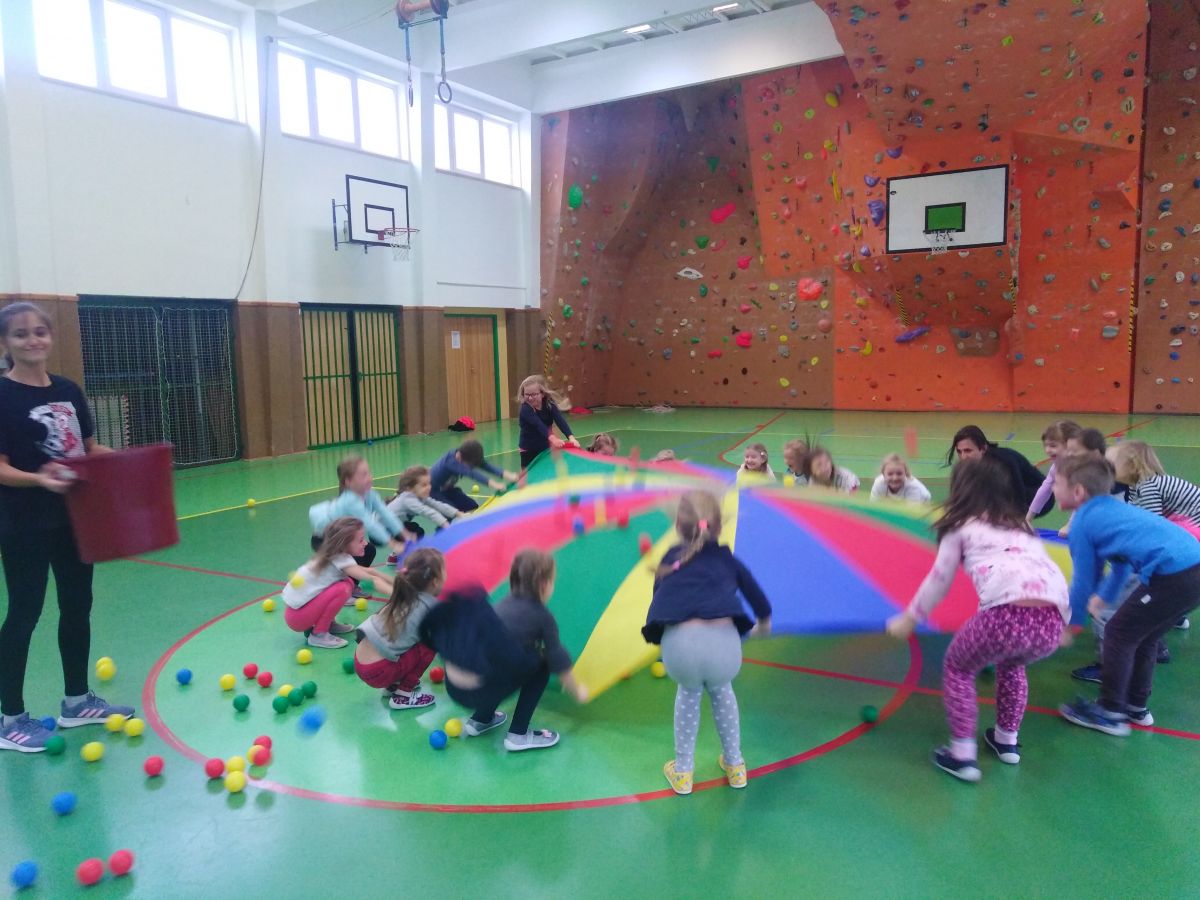 Děti zažily spoustu legrace s padákem, pod kterým podbíhaly nebo naopak pomocí padáku vyhazovaly do vzduchu míčky.